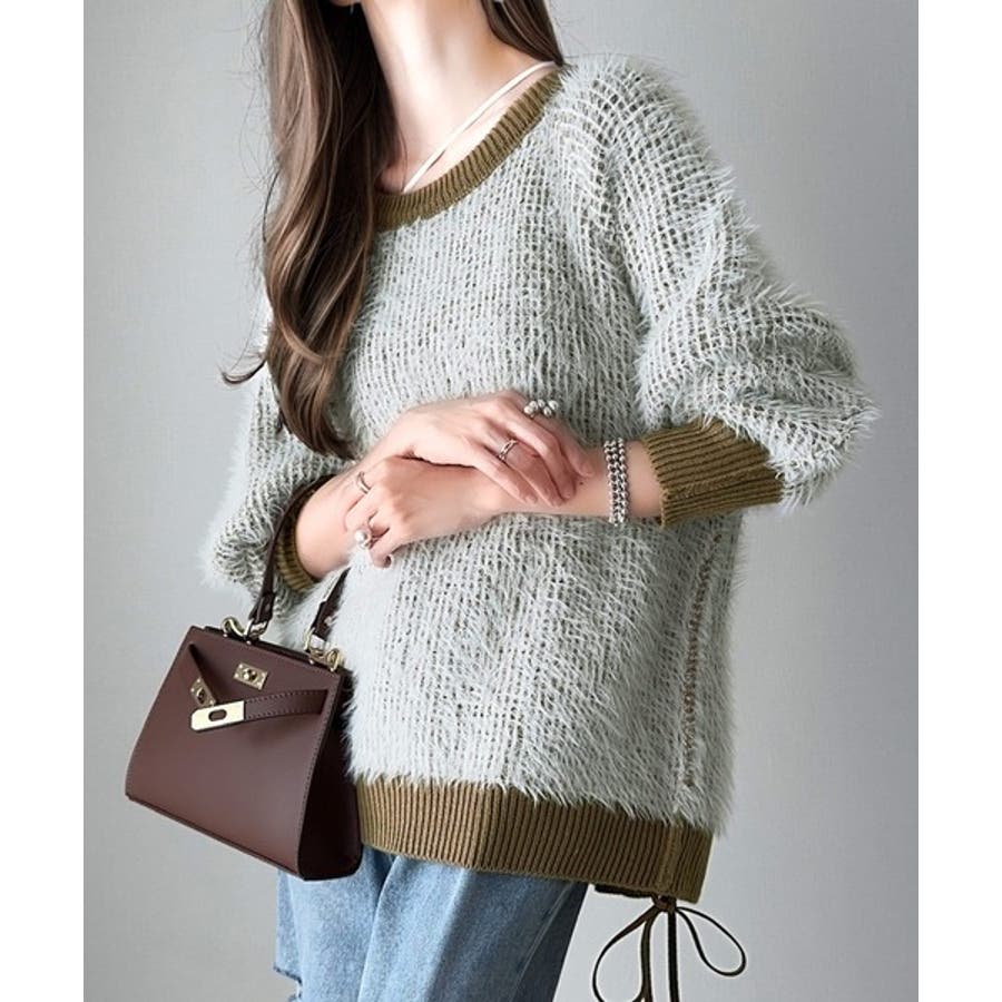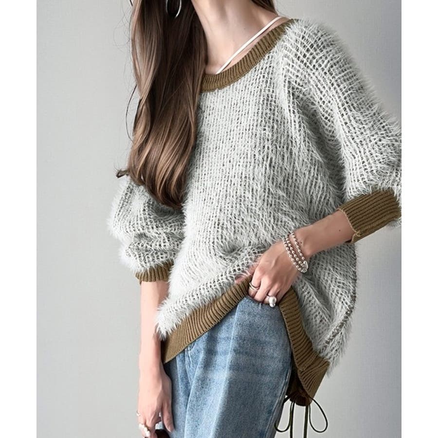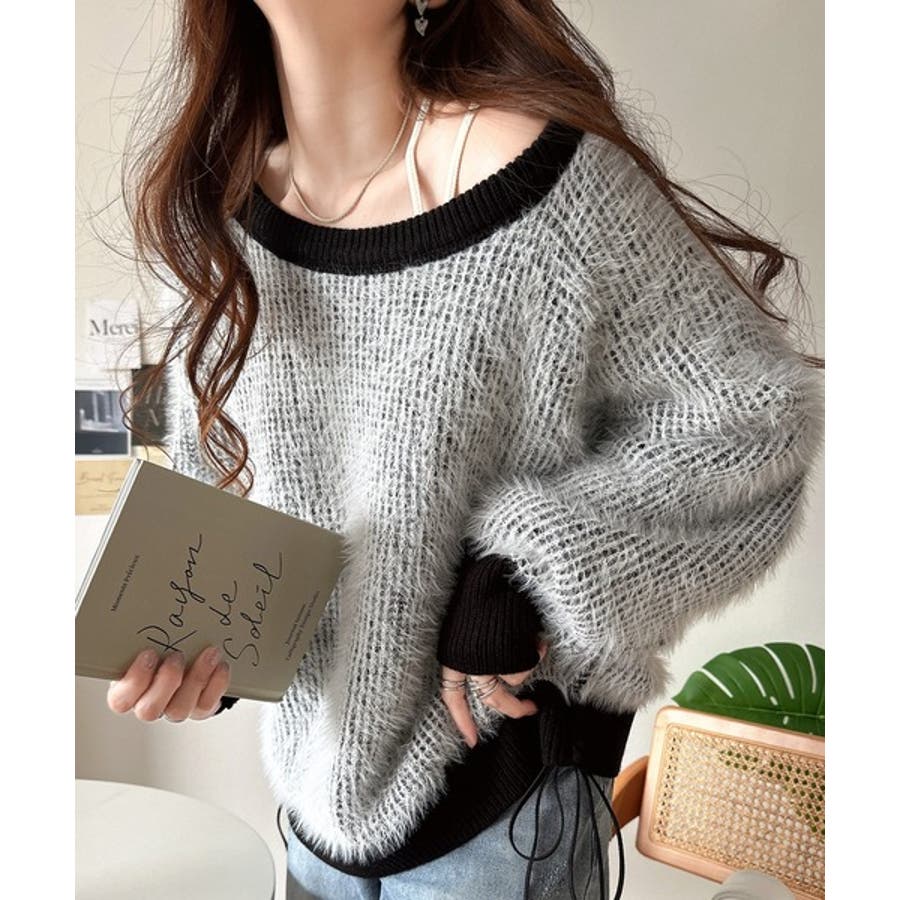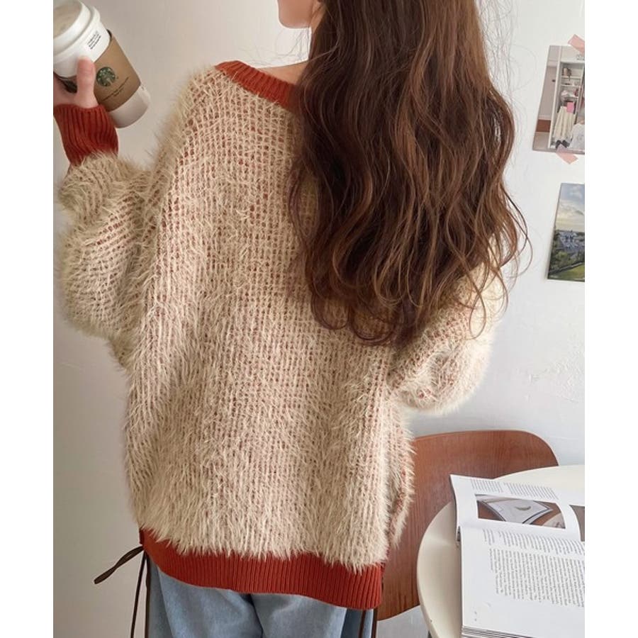 甘すぎないフェミニン感。サイドリボン使いフェザーヤーンシャギー配色ニット