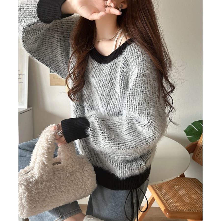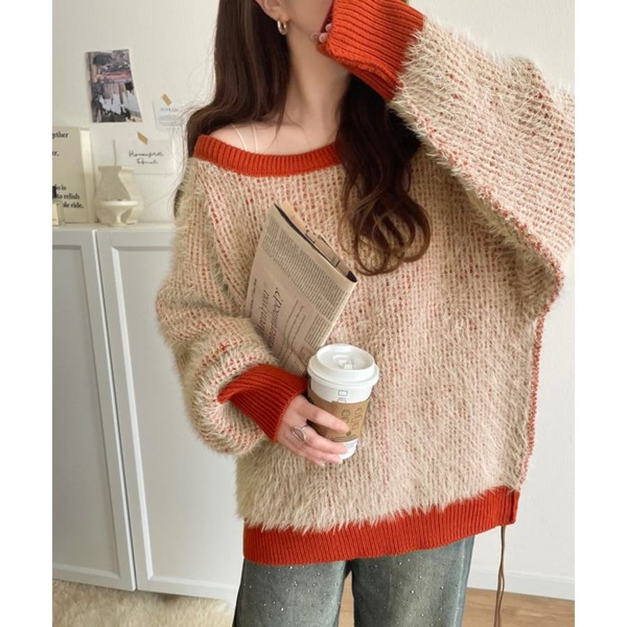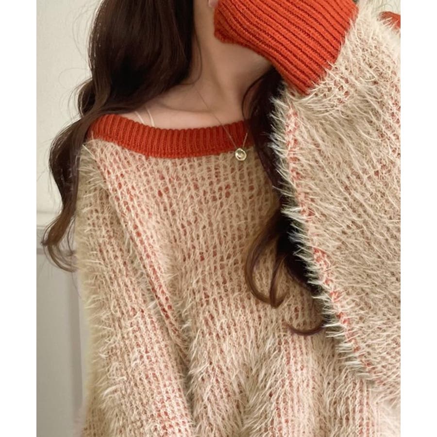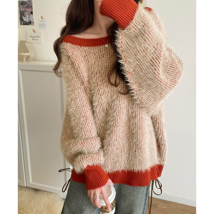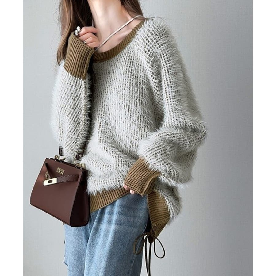 甘すぎないフェミニン感。サイドリボン使いフェザーヤーンシャギー配色ニット