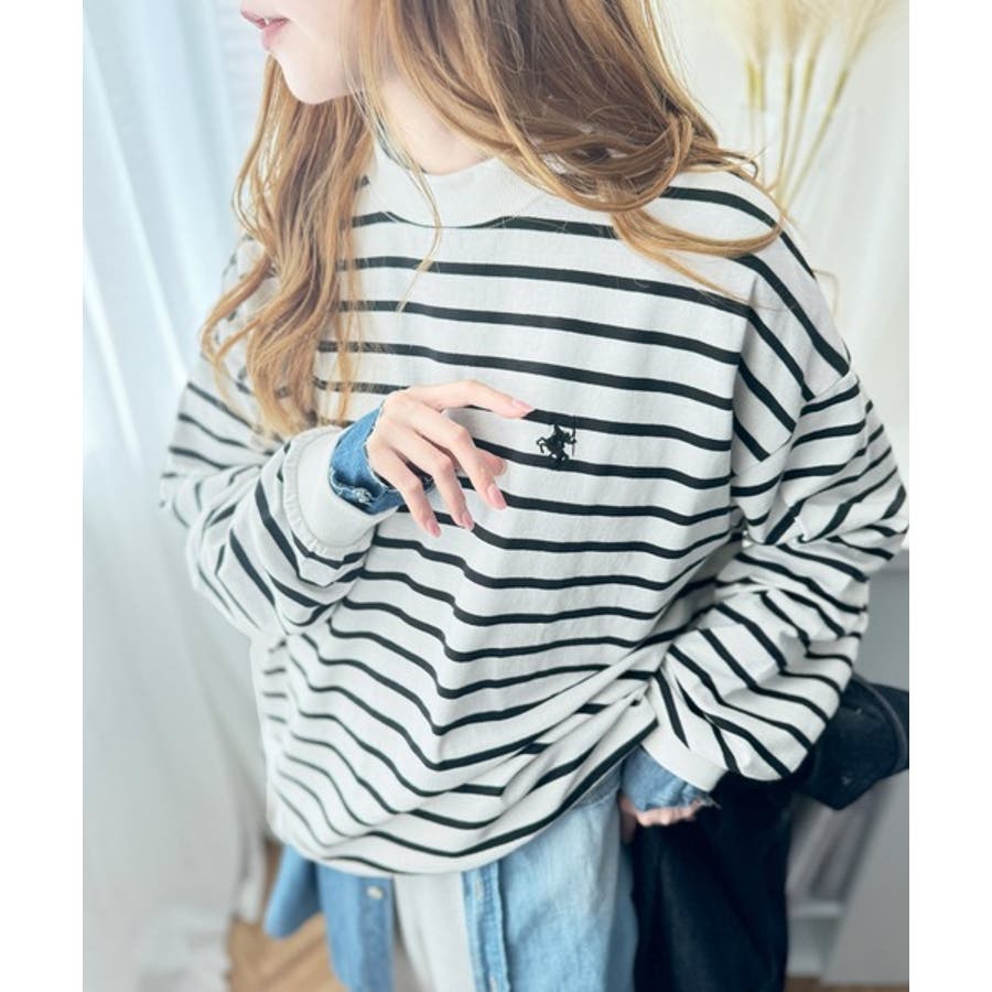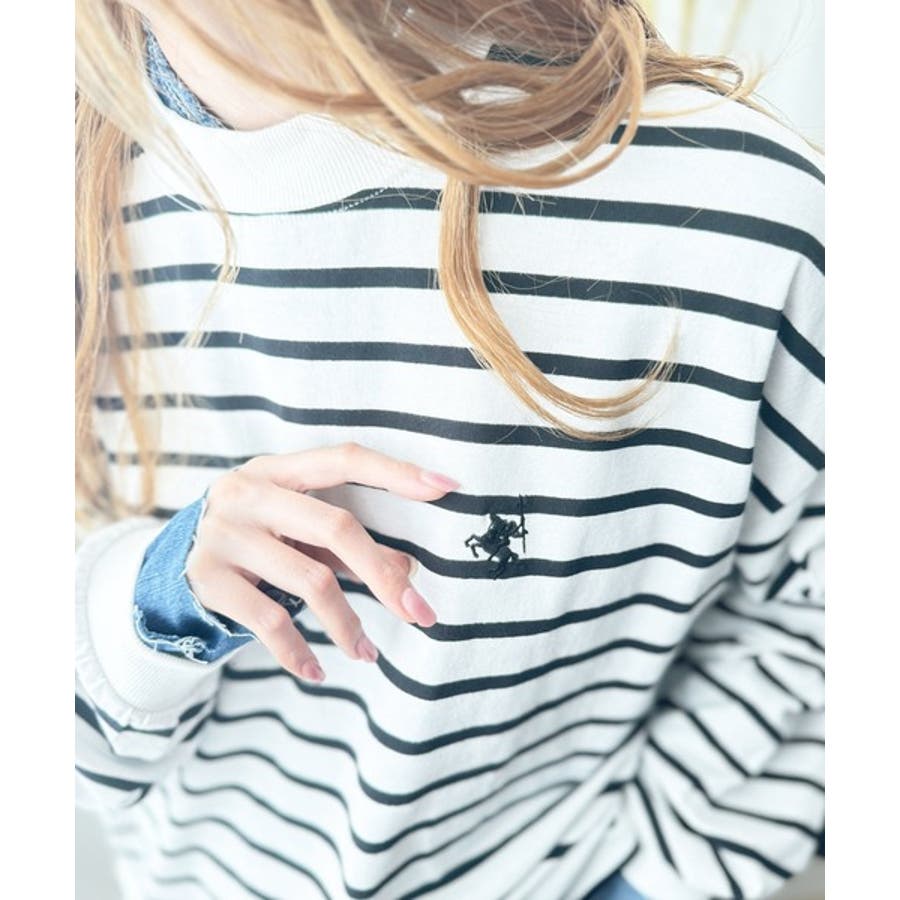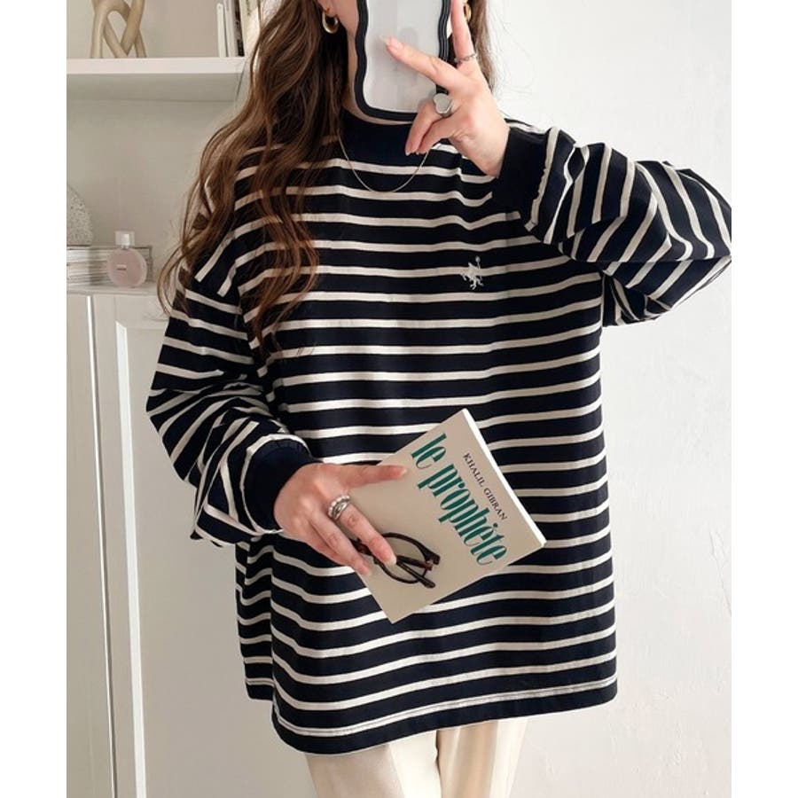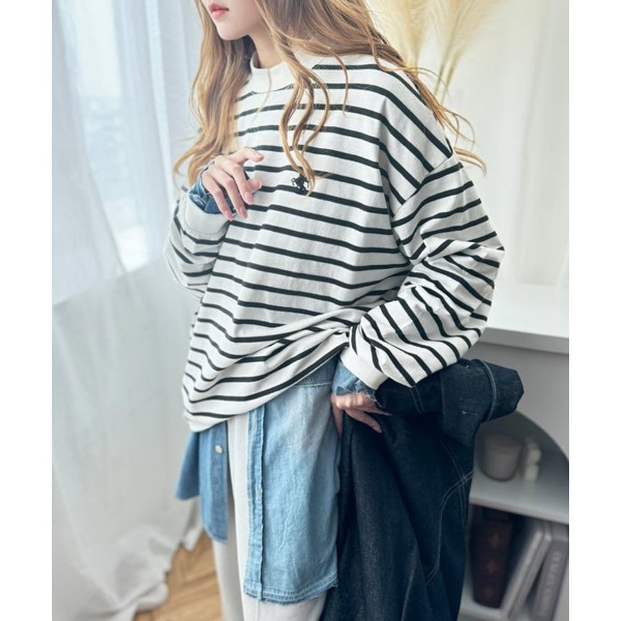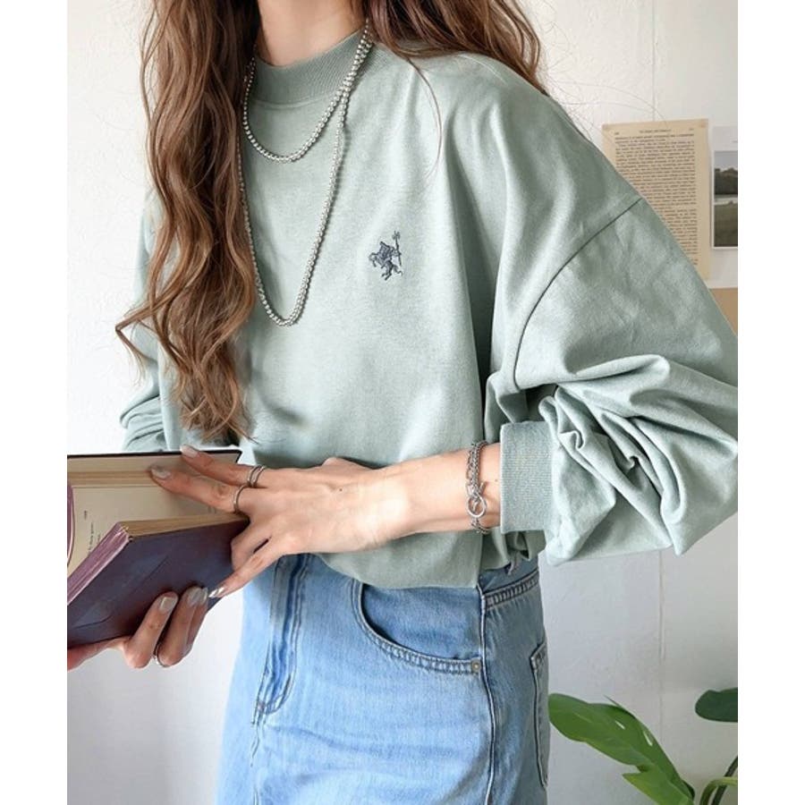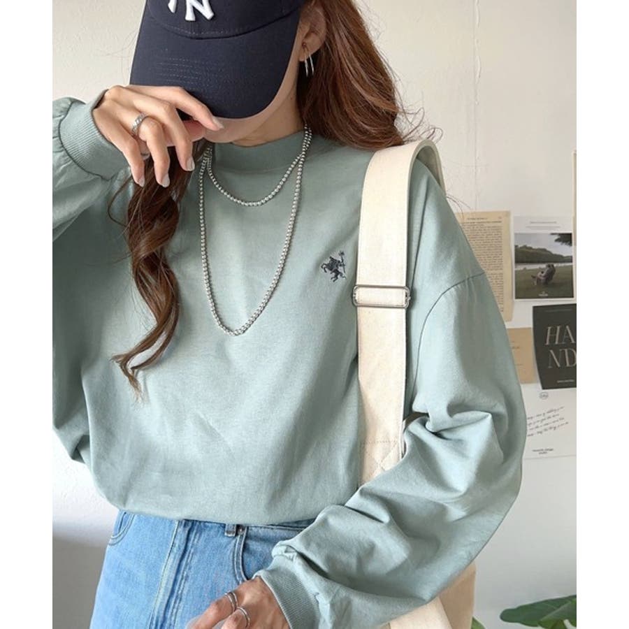 大人リラックススタイル。ワンポイント刺繍モックネック長袖Tシャツ(無地 ボーダー…