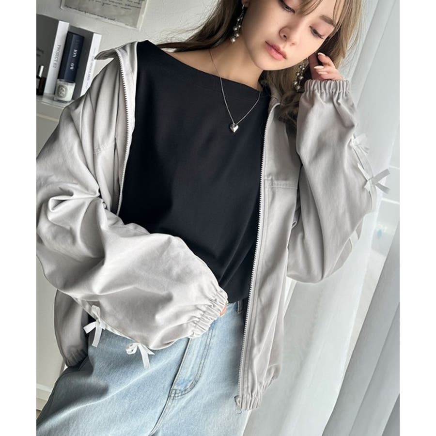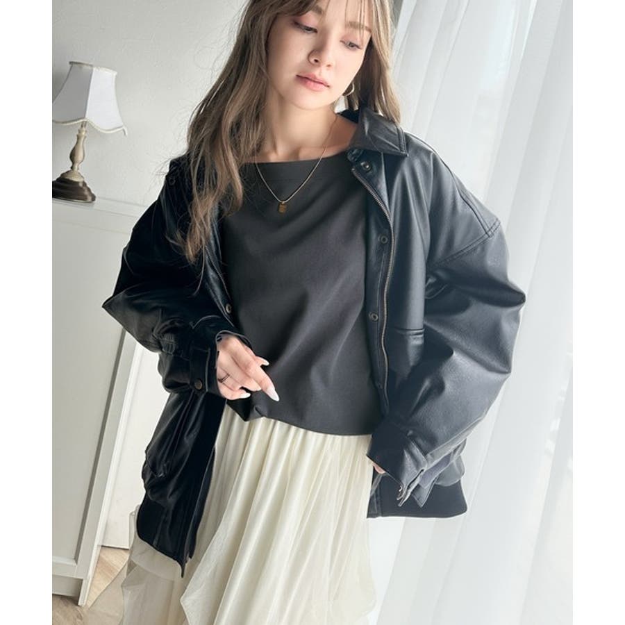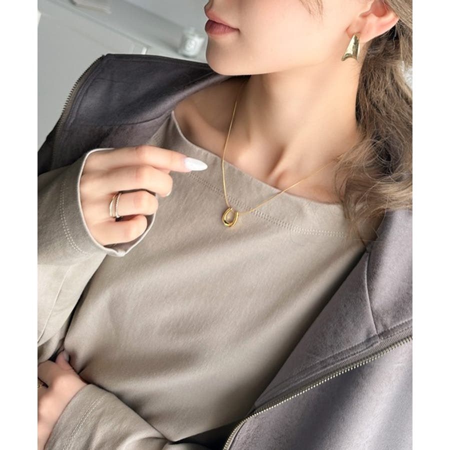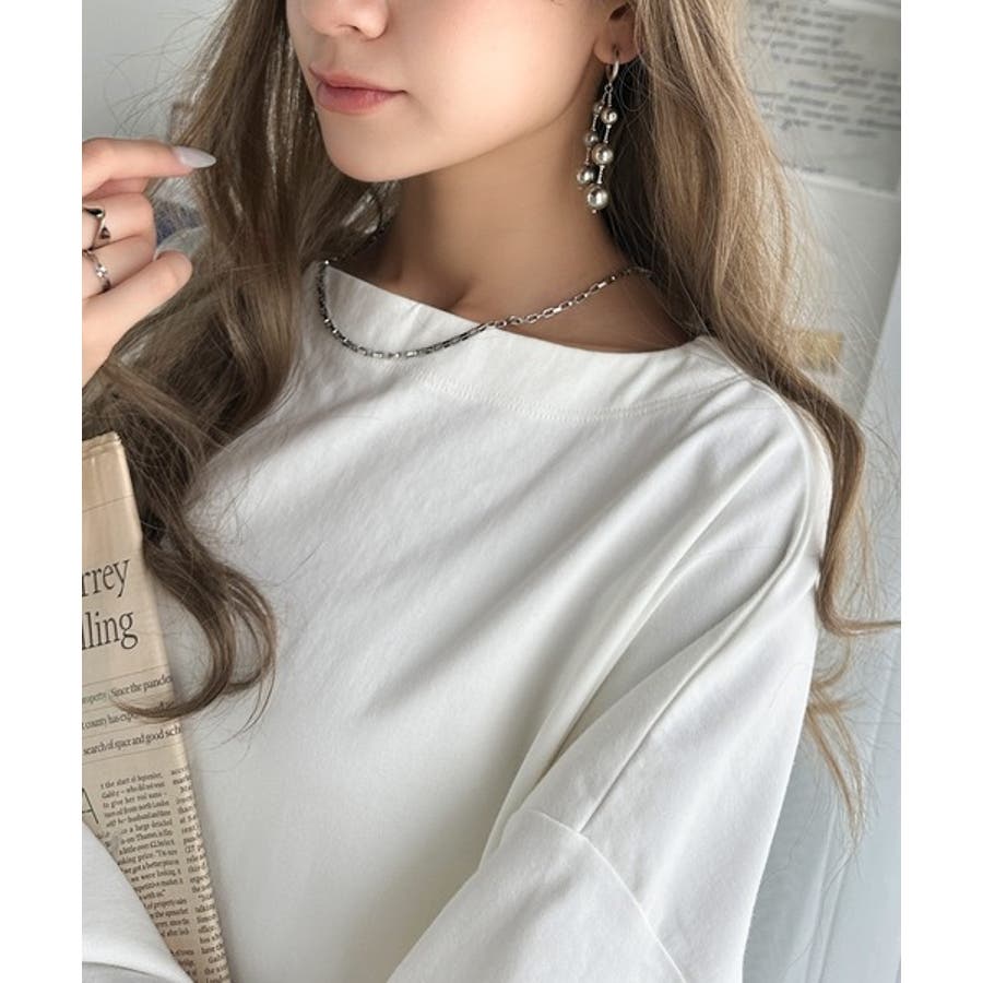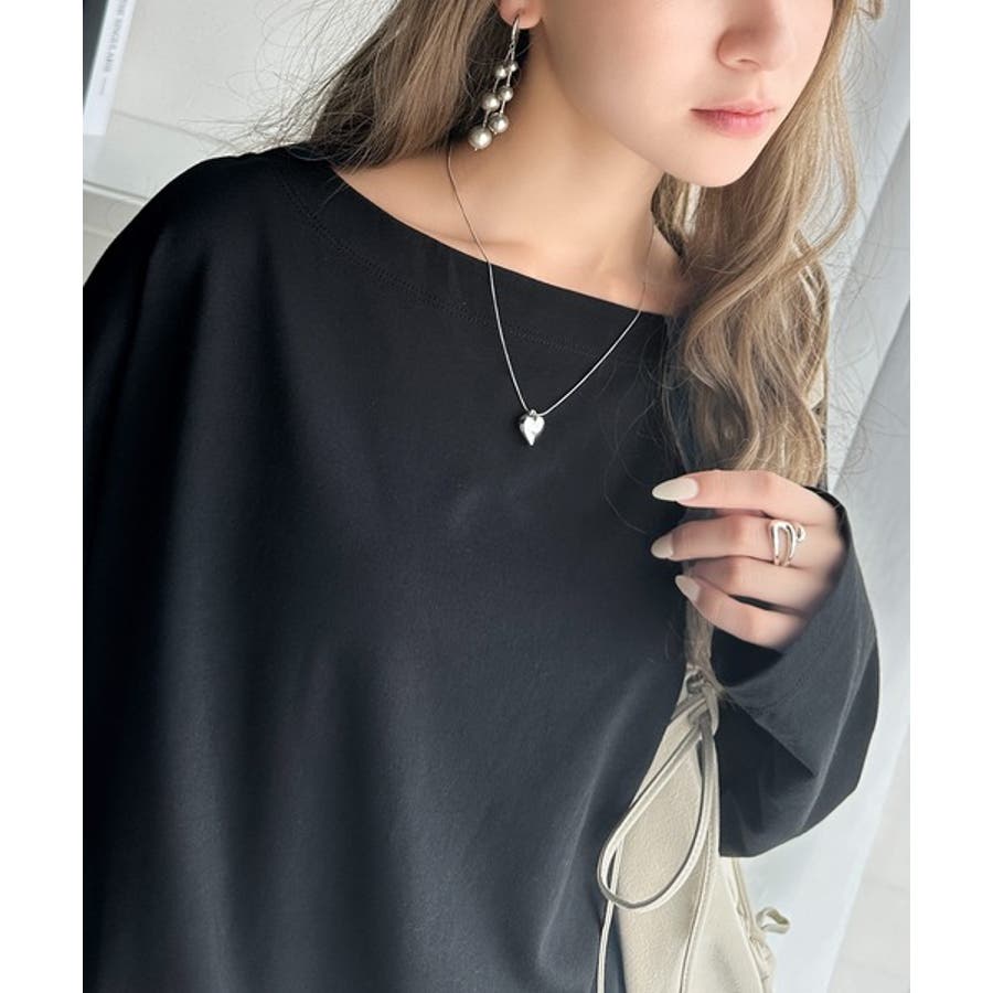 ボートネックデザインですっきりとした首元にはネックレスを合わせるとより一層オシャレな雰囲気に。