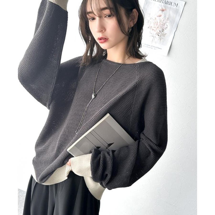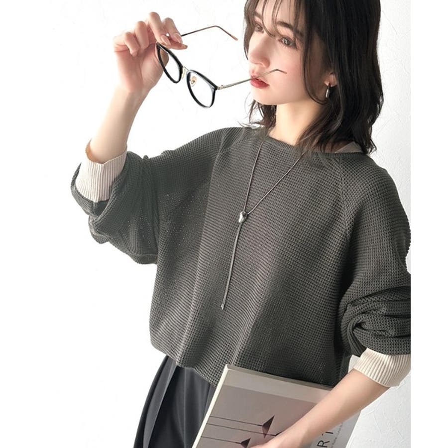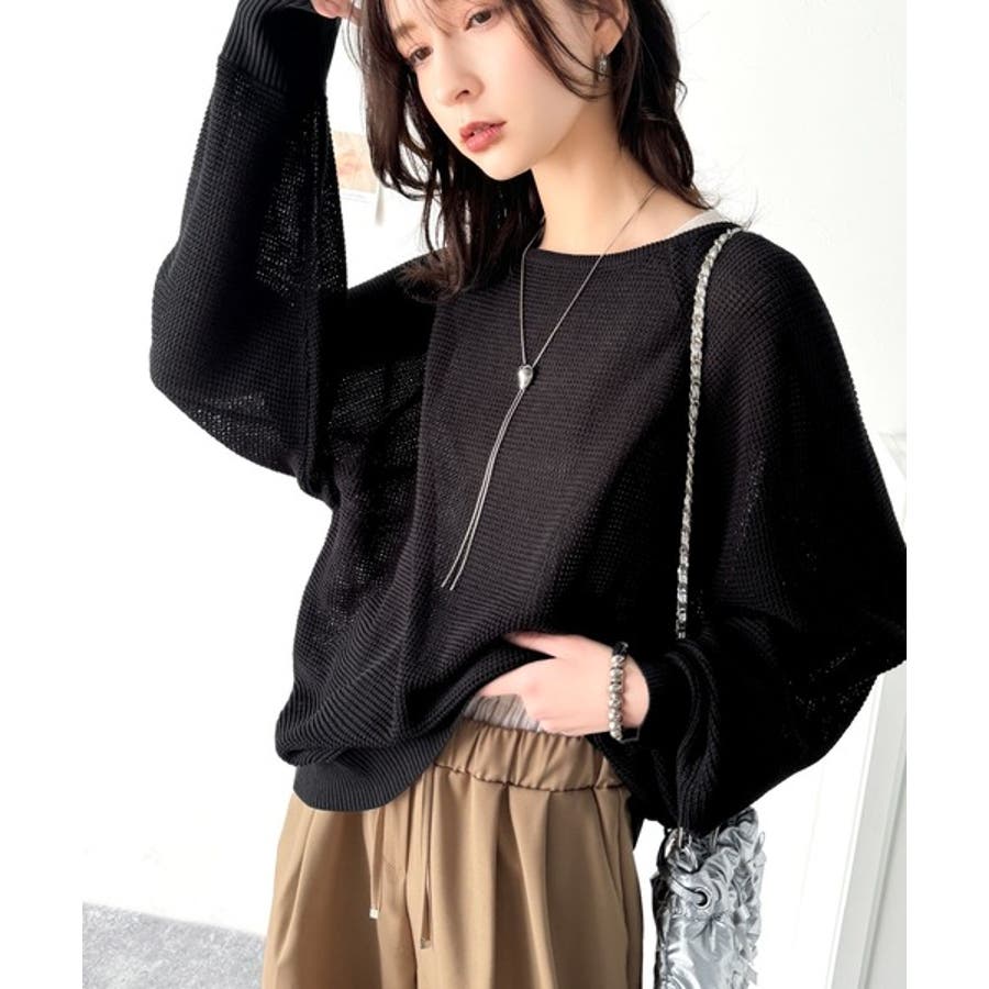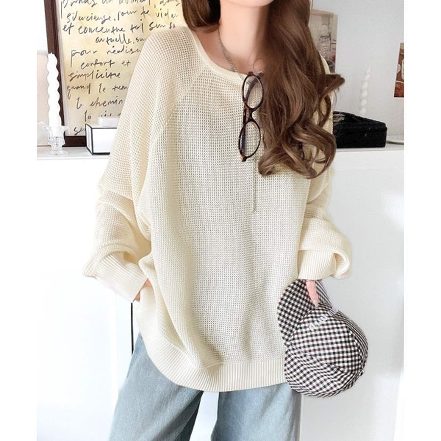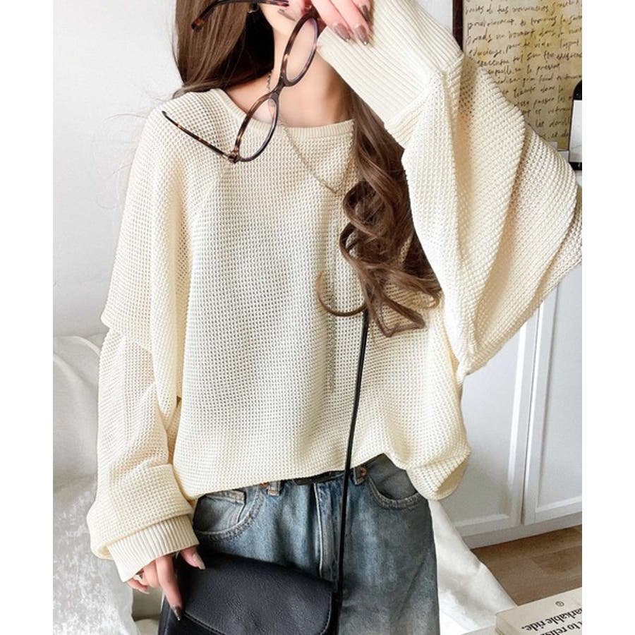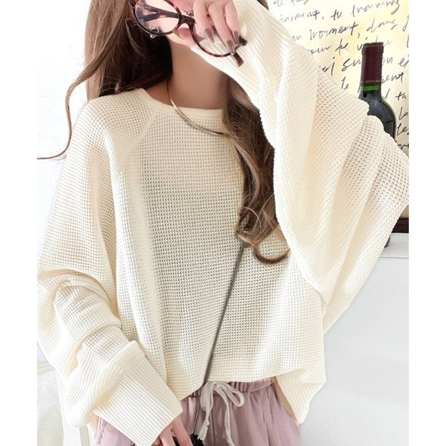 遊び心のある程よい透け感。オーバーサイズワッフル編みドルマン袖トップス(長袖)