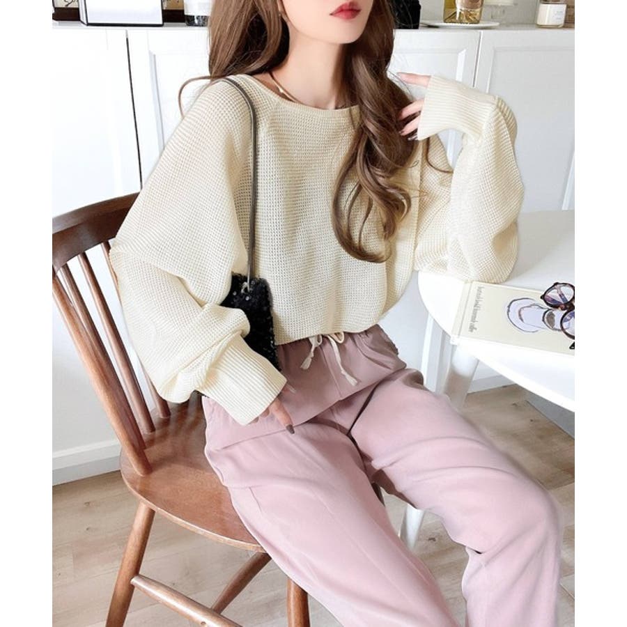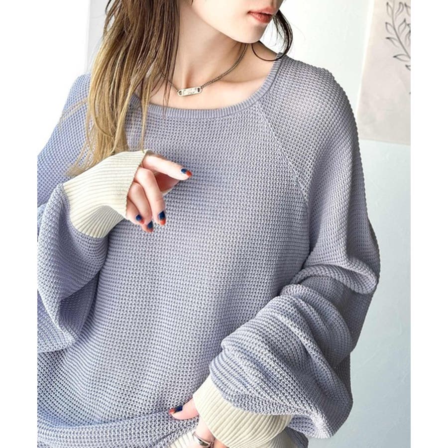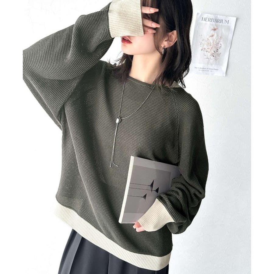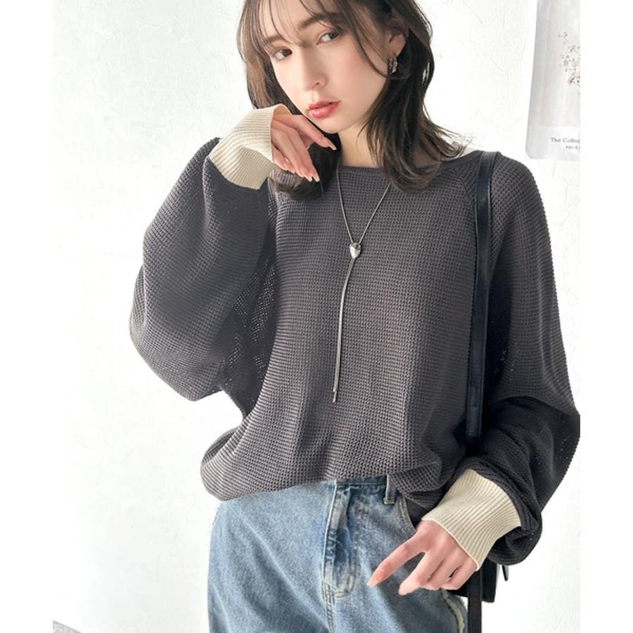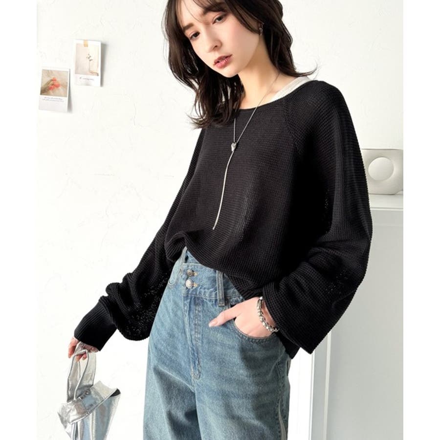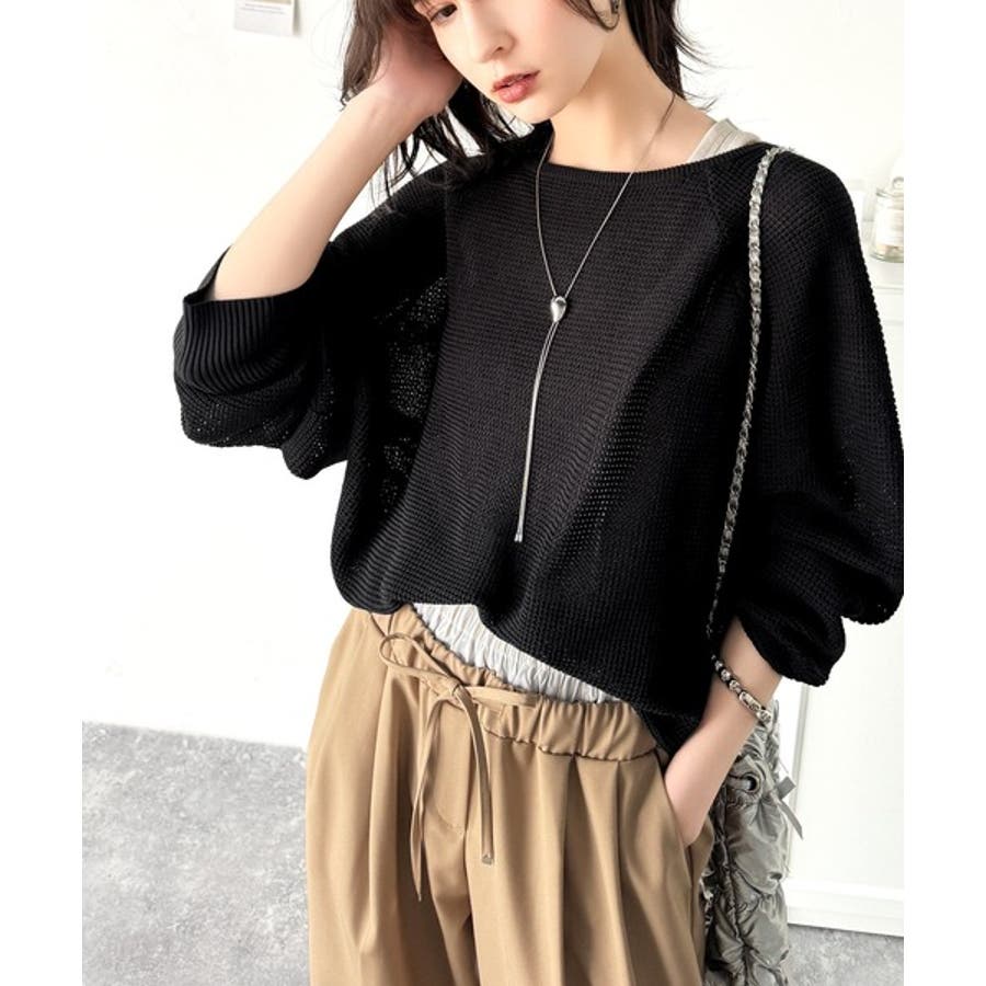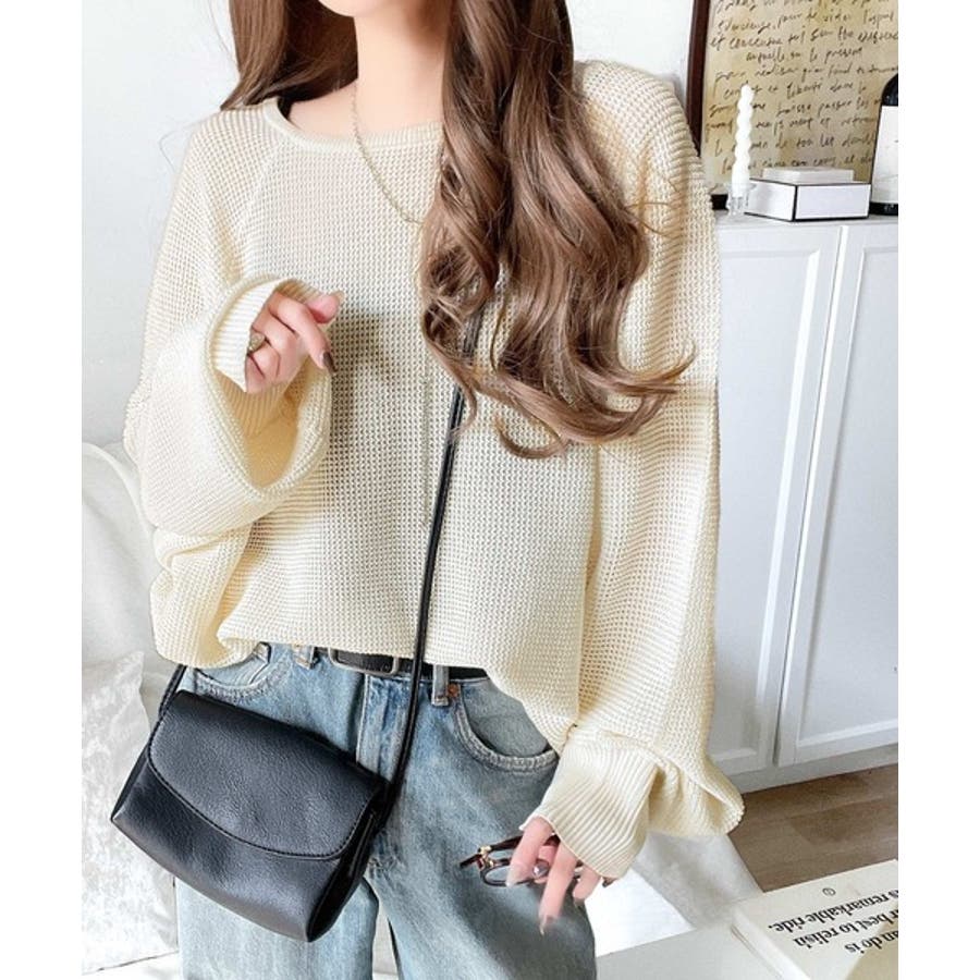 遊び心のある程よい透け感。オーバーサイズワッフル編みドルマン袖トップス(長袖)
