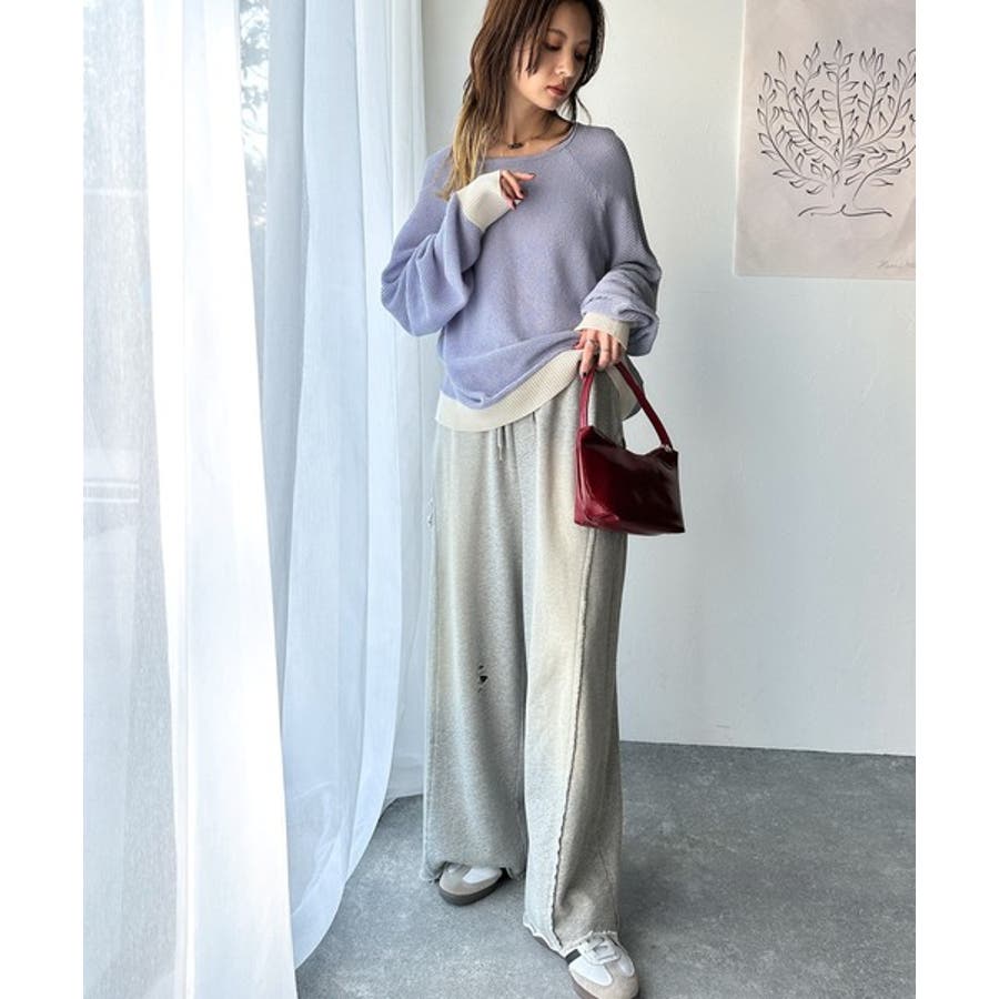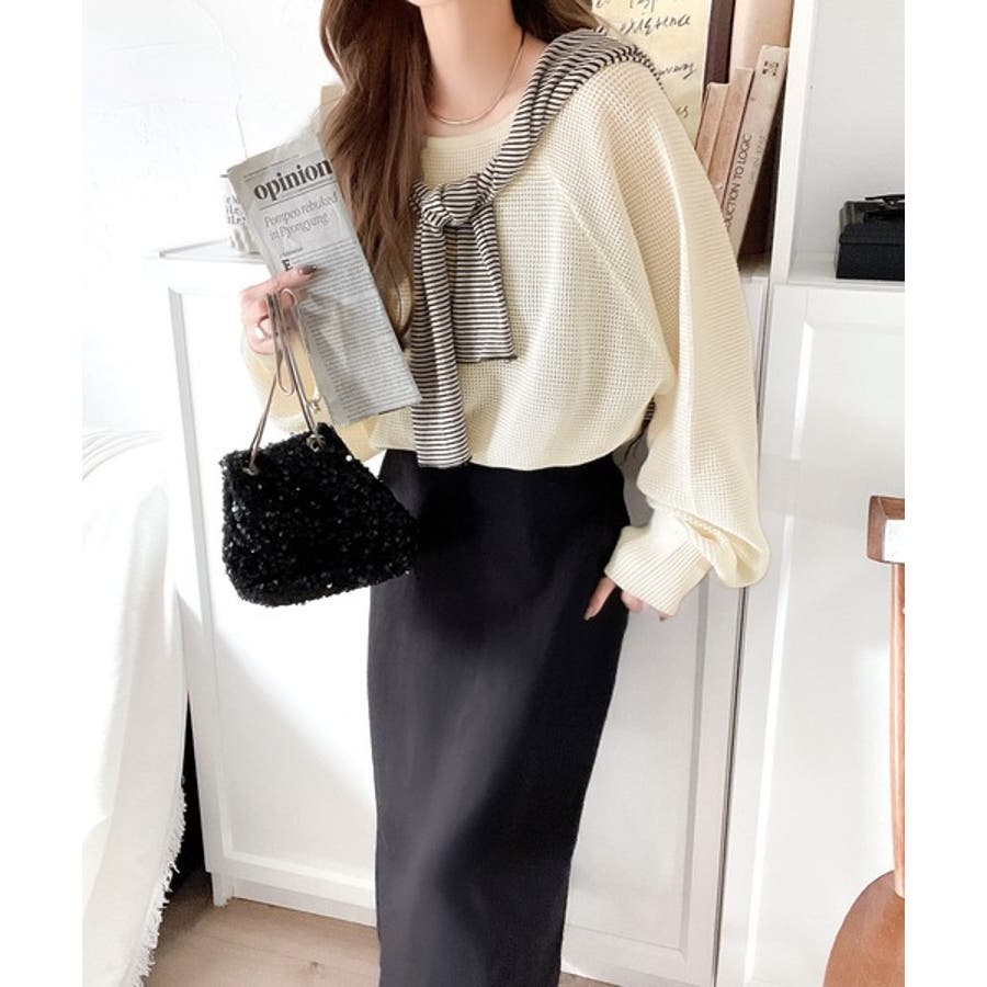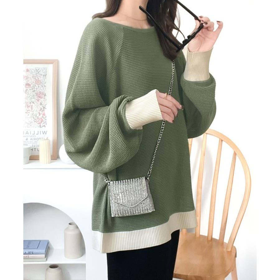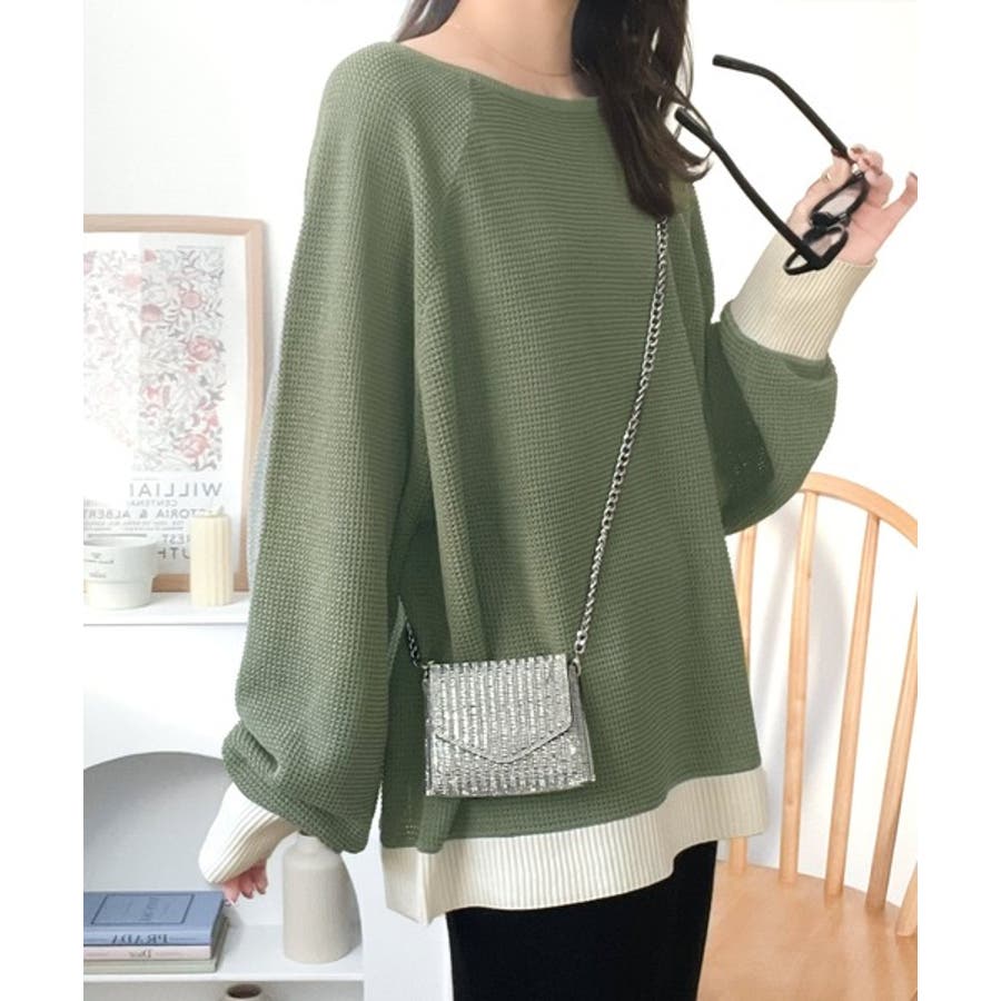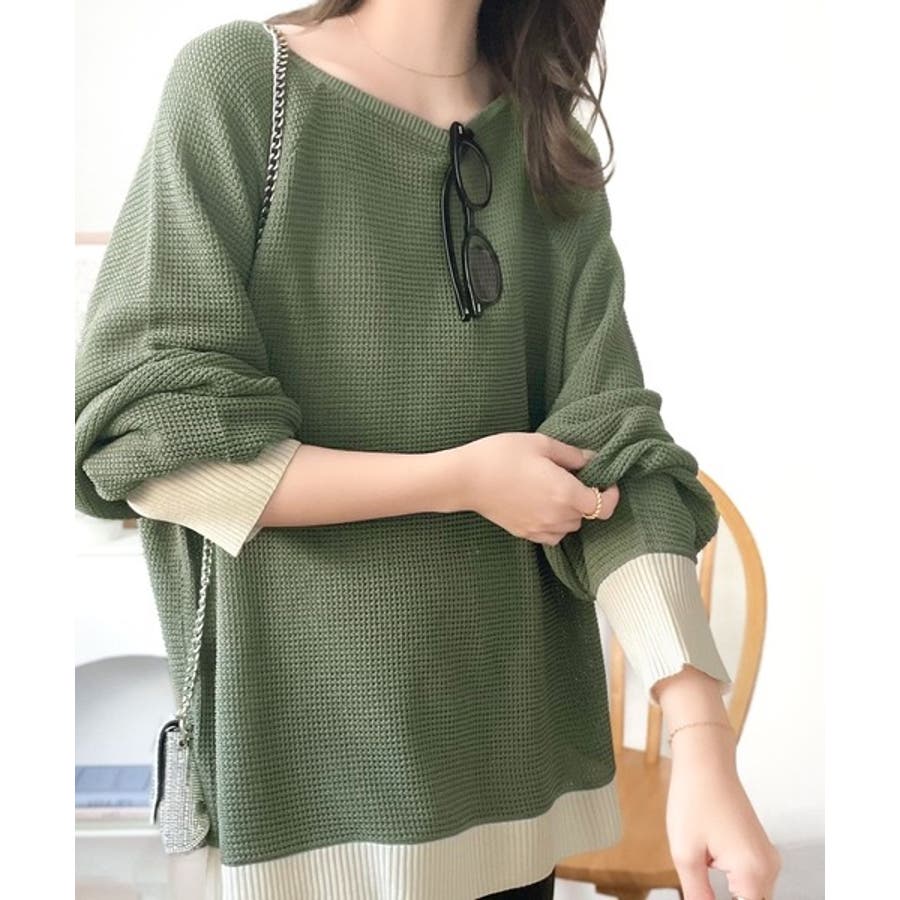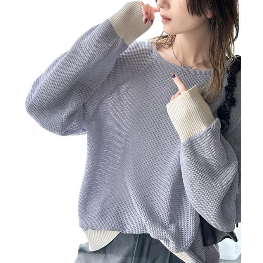 遊び心のある程よい透け感。オーバーサイズワッフル編みドルマン袖トップス(長袖)