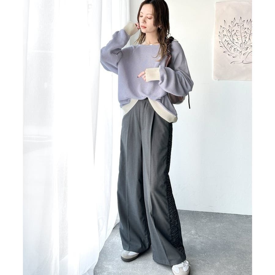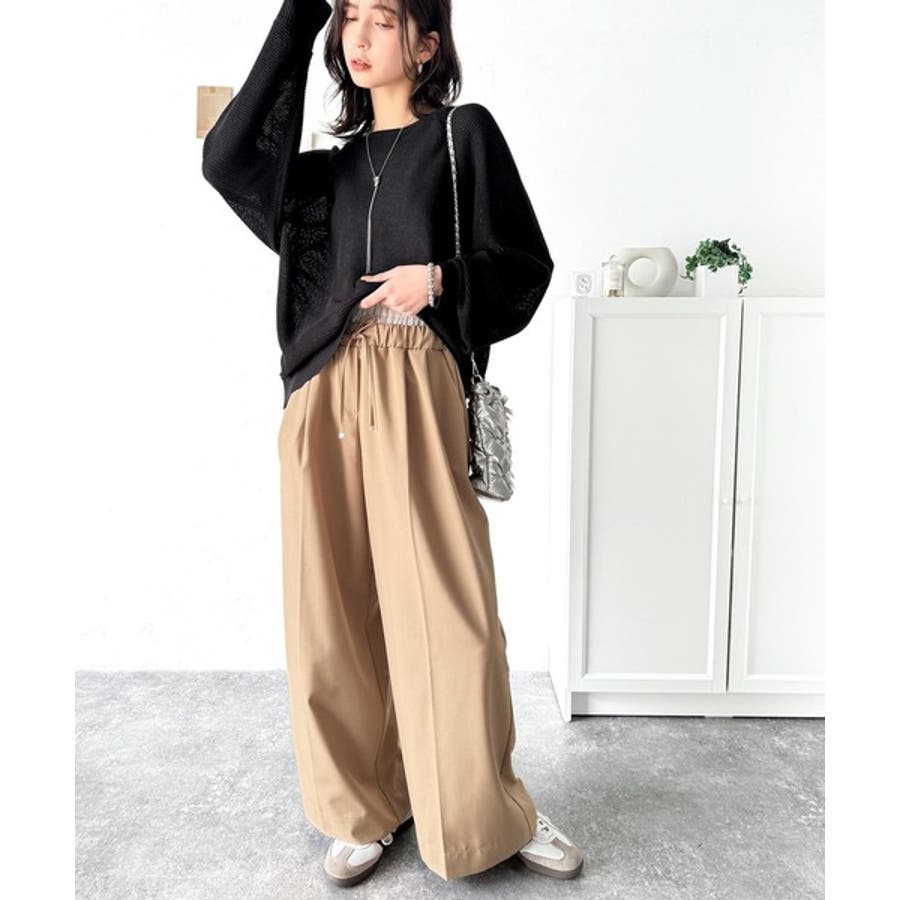 例えば、ベージュのワイドパンツを合わせて、足元にはスニーカーをセレクトすれば、休日のお出かけにぴったりのスタイルが完成。