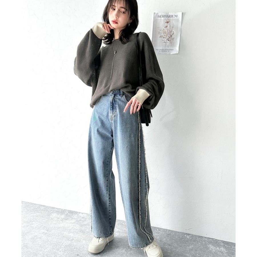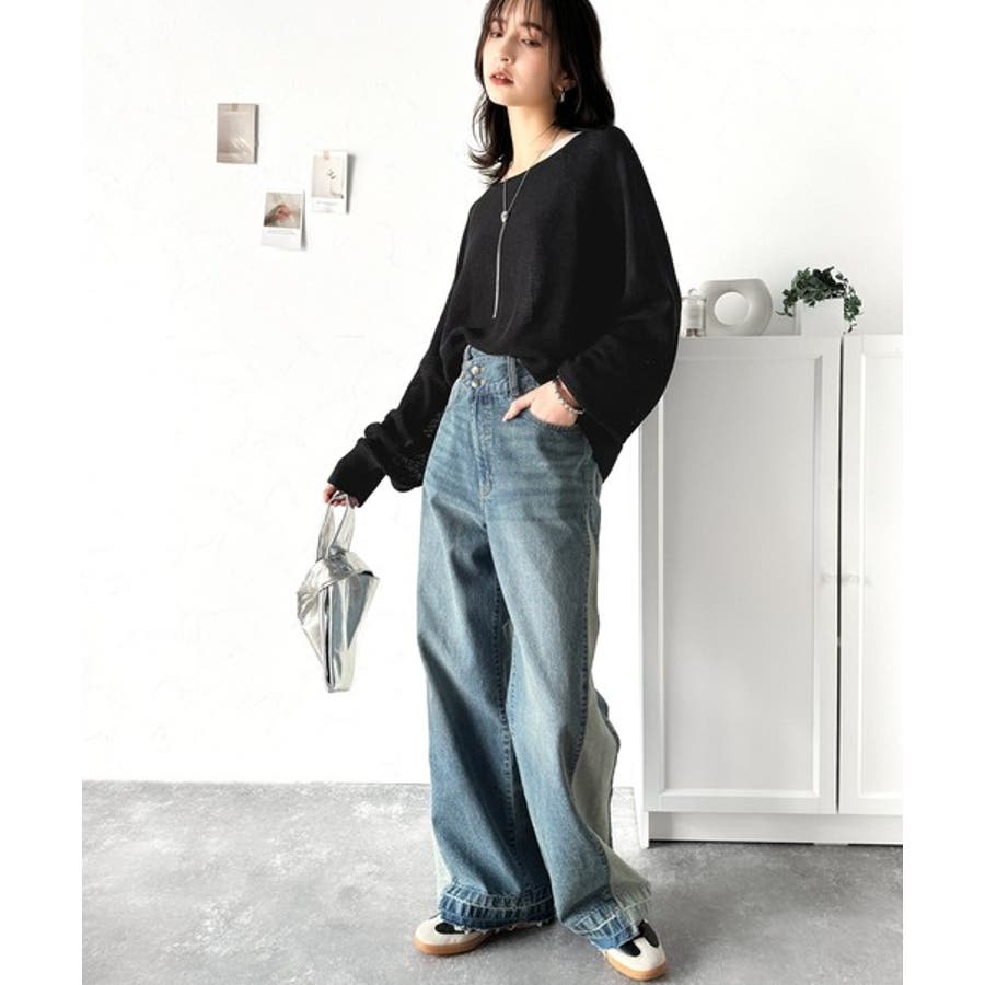 また、きれいめなコーデが好みの方には、デニムスカートやスリムなパンツを合わせると一気に華やかに。