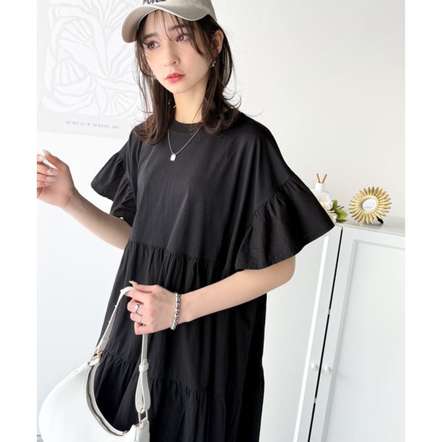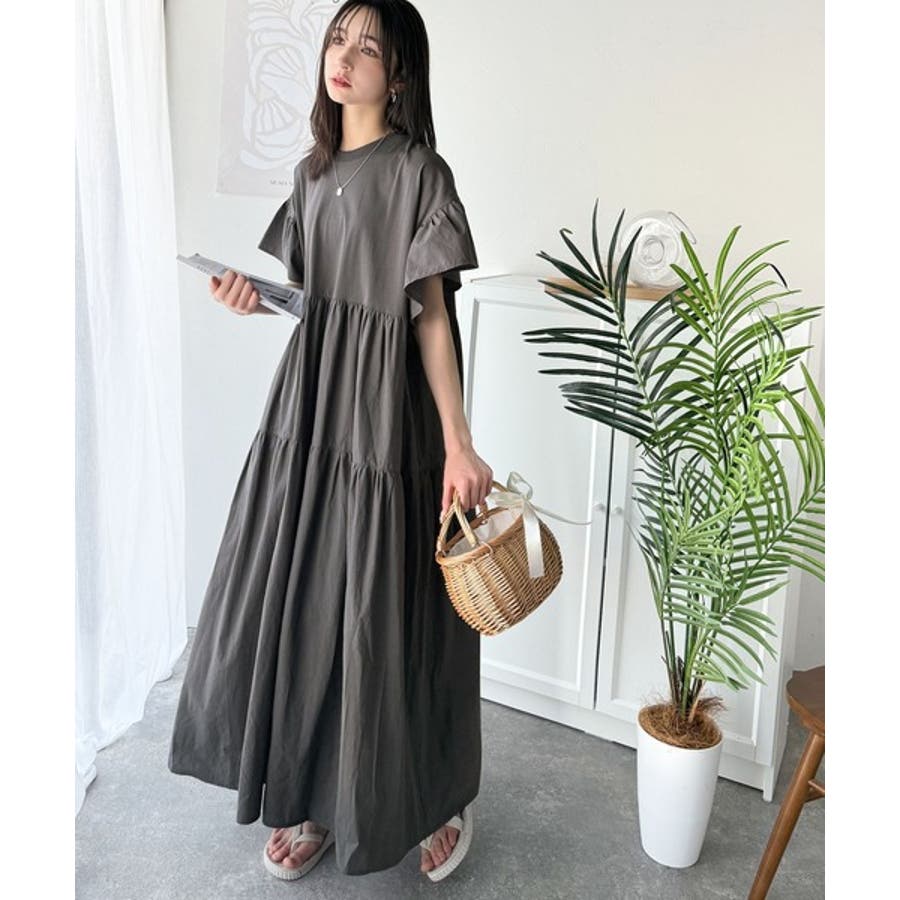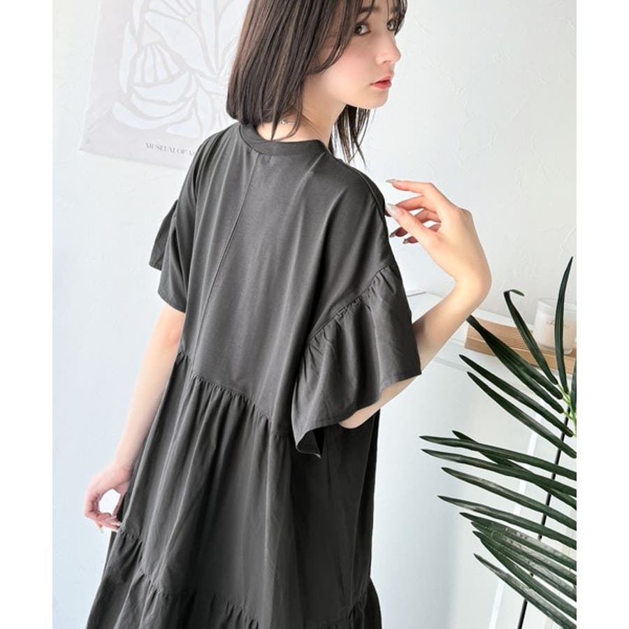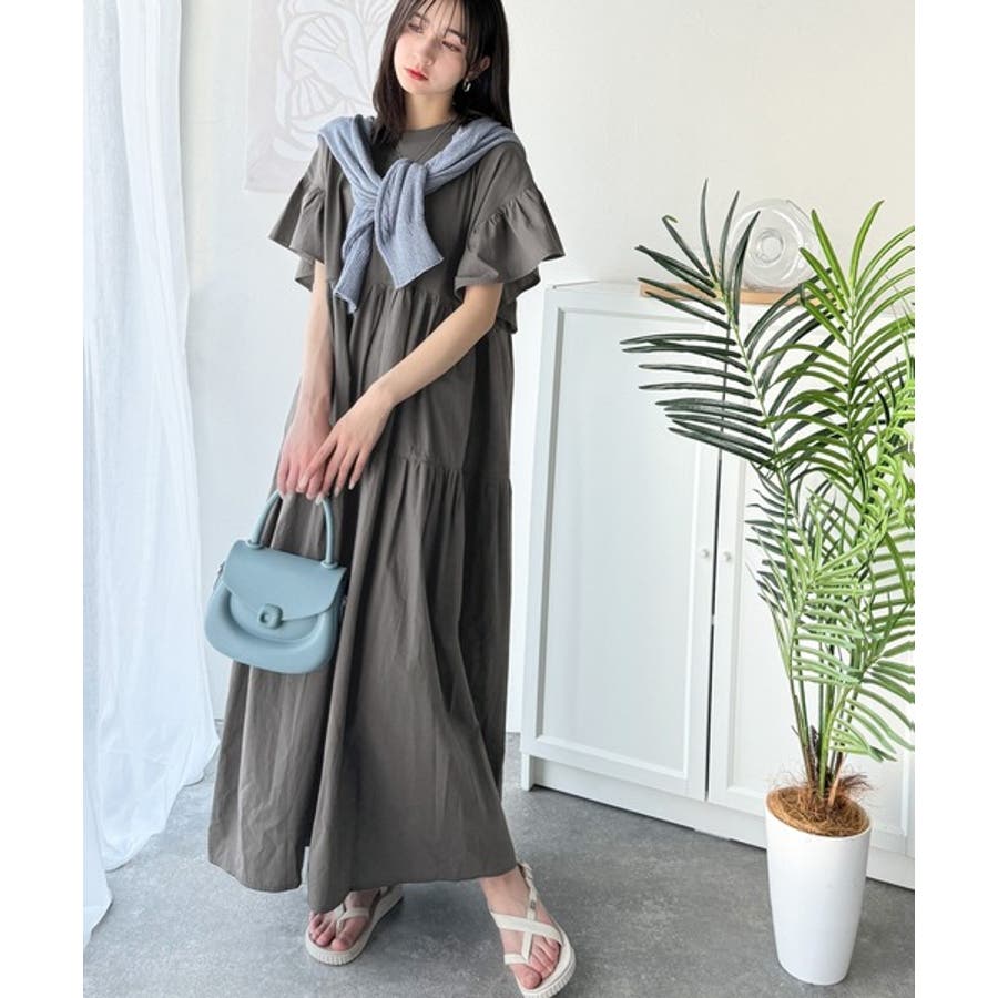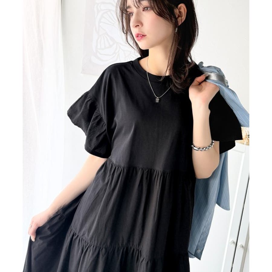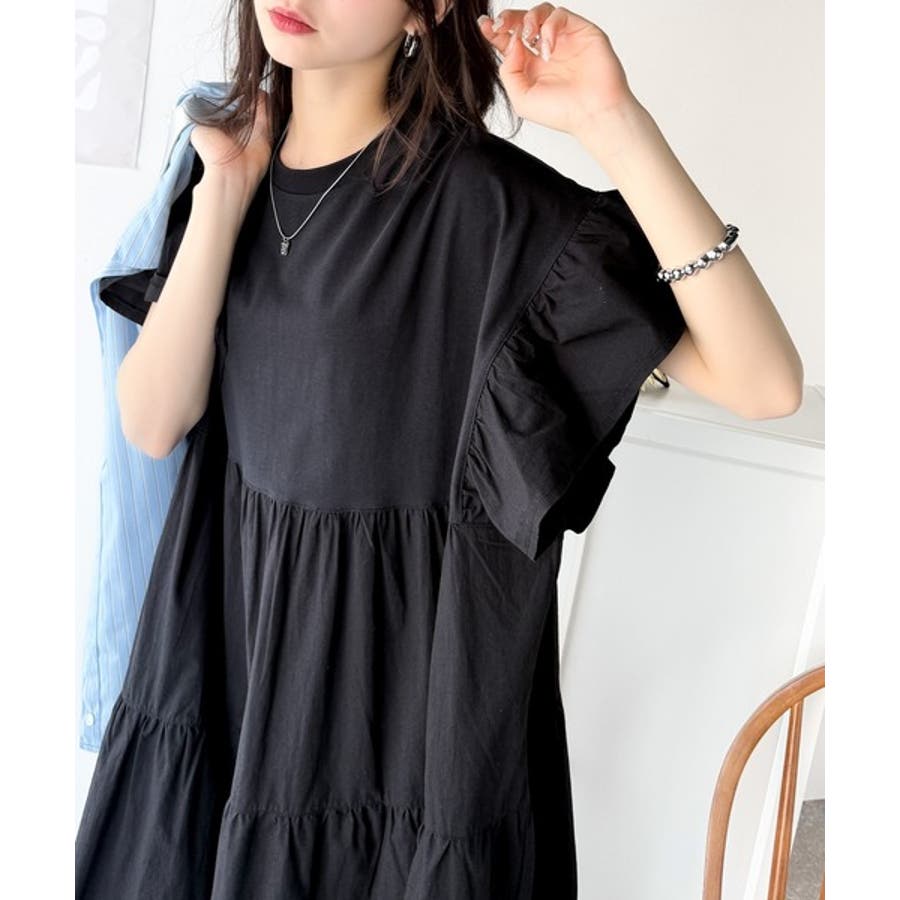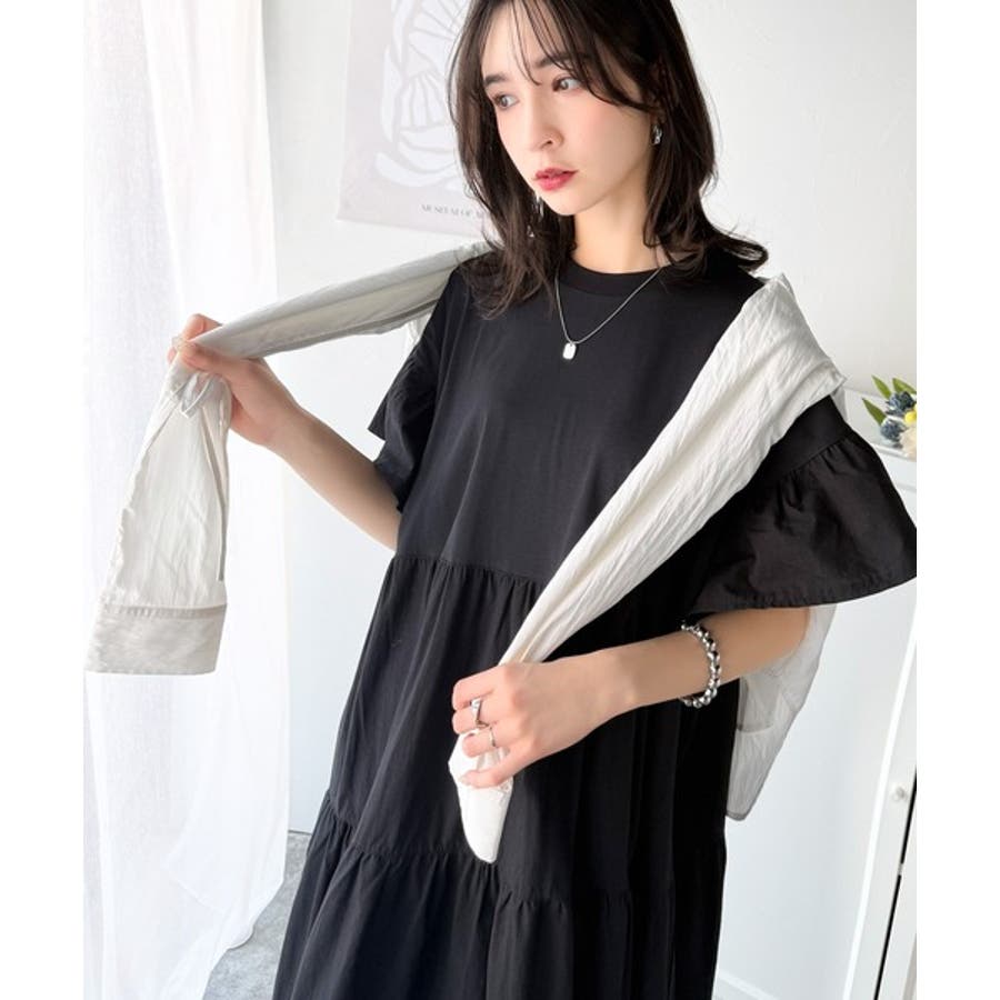 接触冷感♪涼しげフリルで夏の装い。布帛ドッキング袖フリルティアードワンピース(ロ…