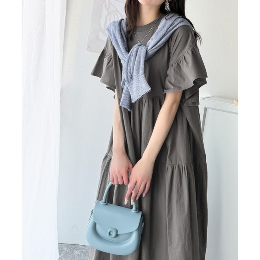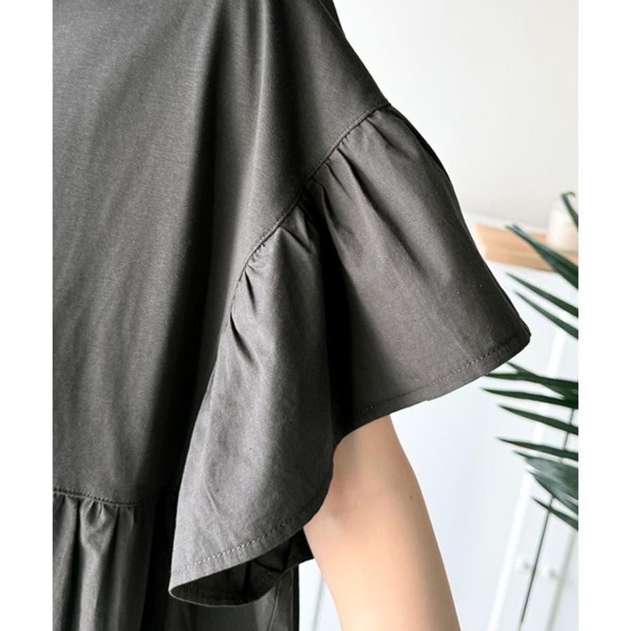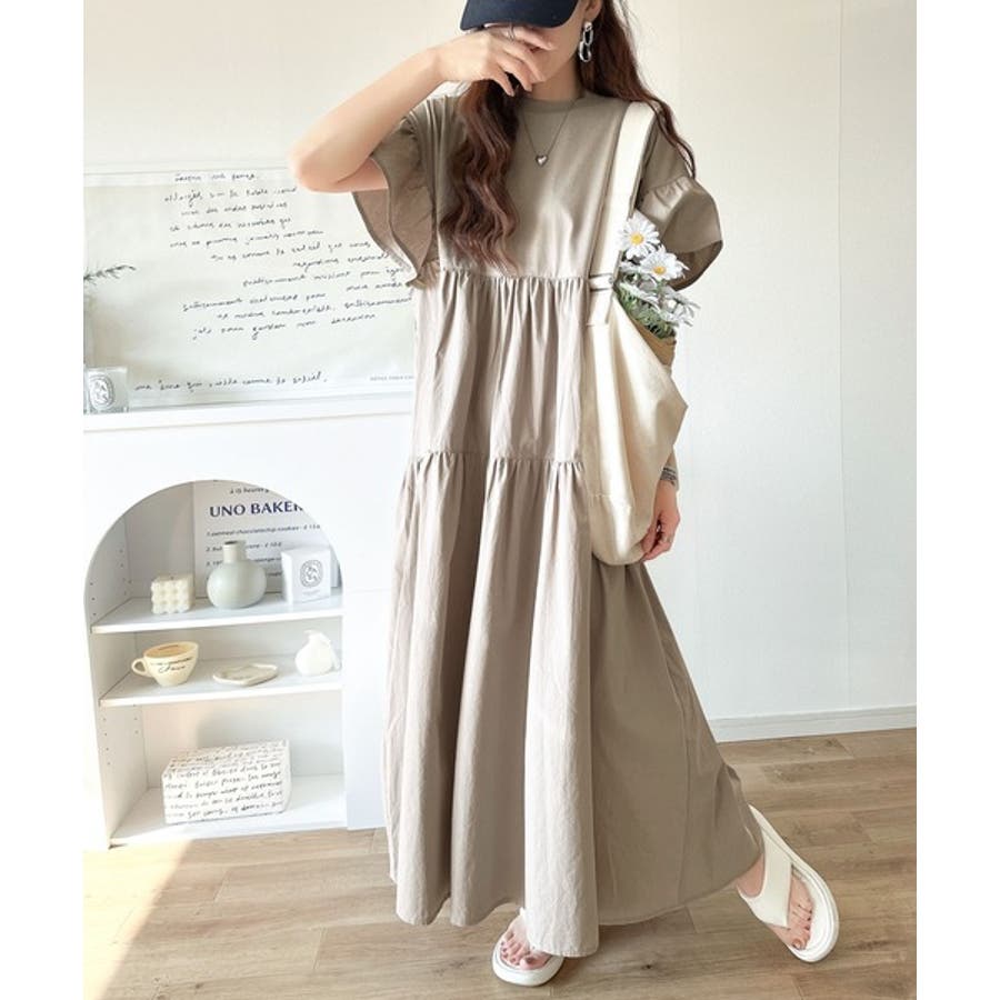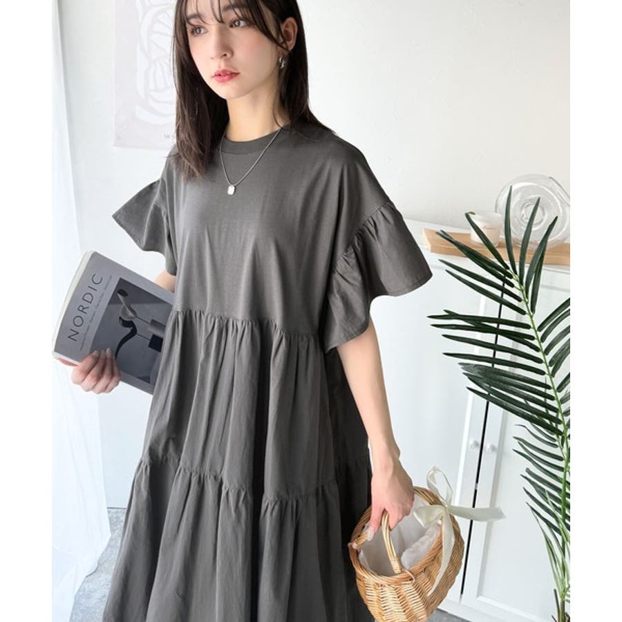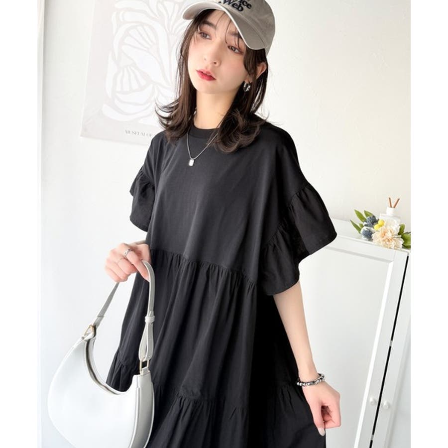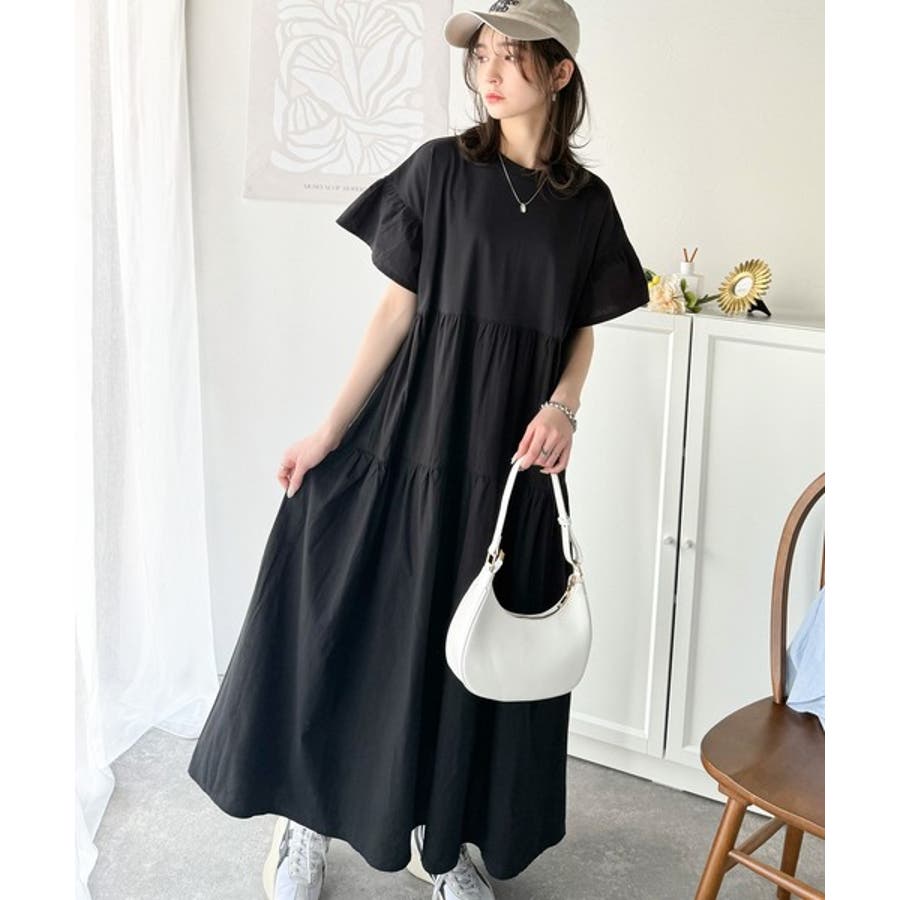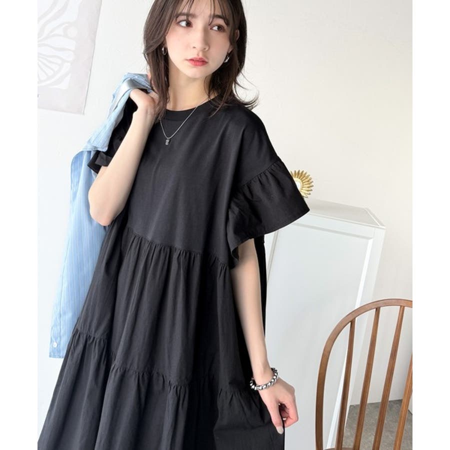 接触冷感♪涼しげフリルで夏の装い。布帛ドッキング袖フリルティアードワンピース(ロ…