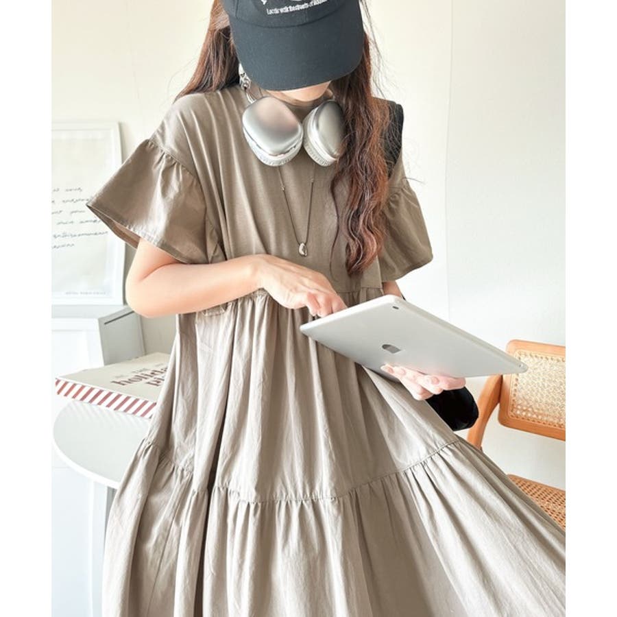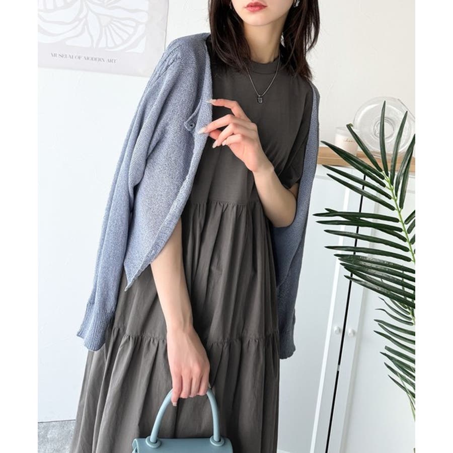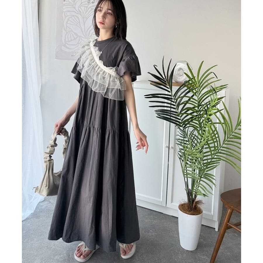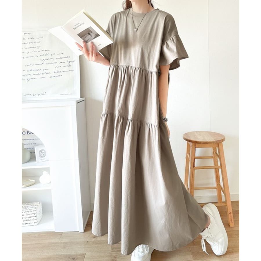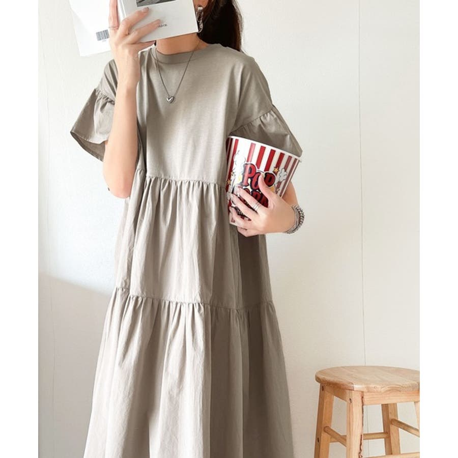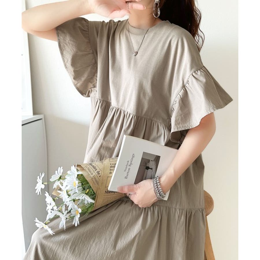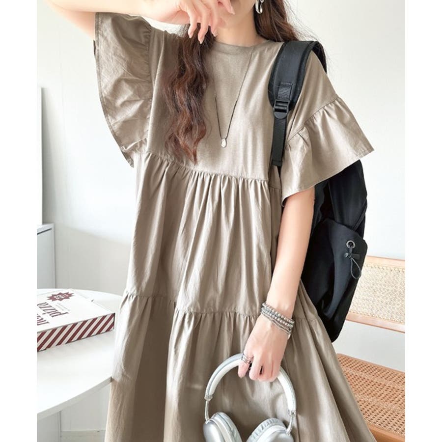 接触冷感♪涼しげフリルで夏の装い。布帛ドッキング袖フリルティアードワンピース(ロ…