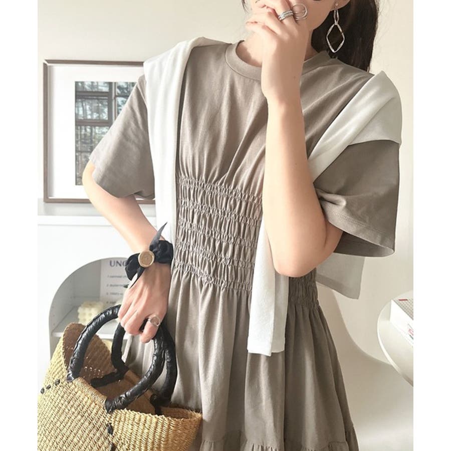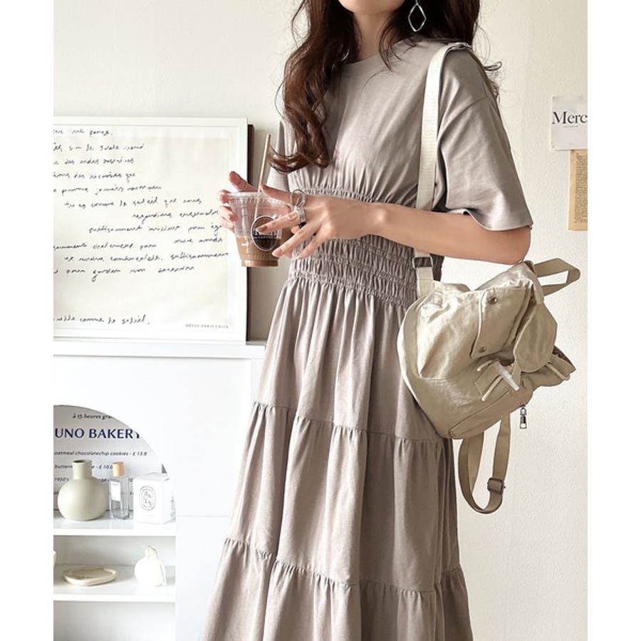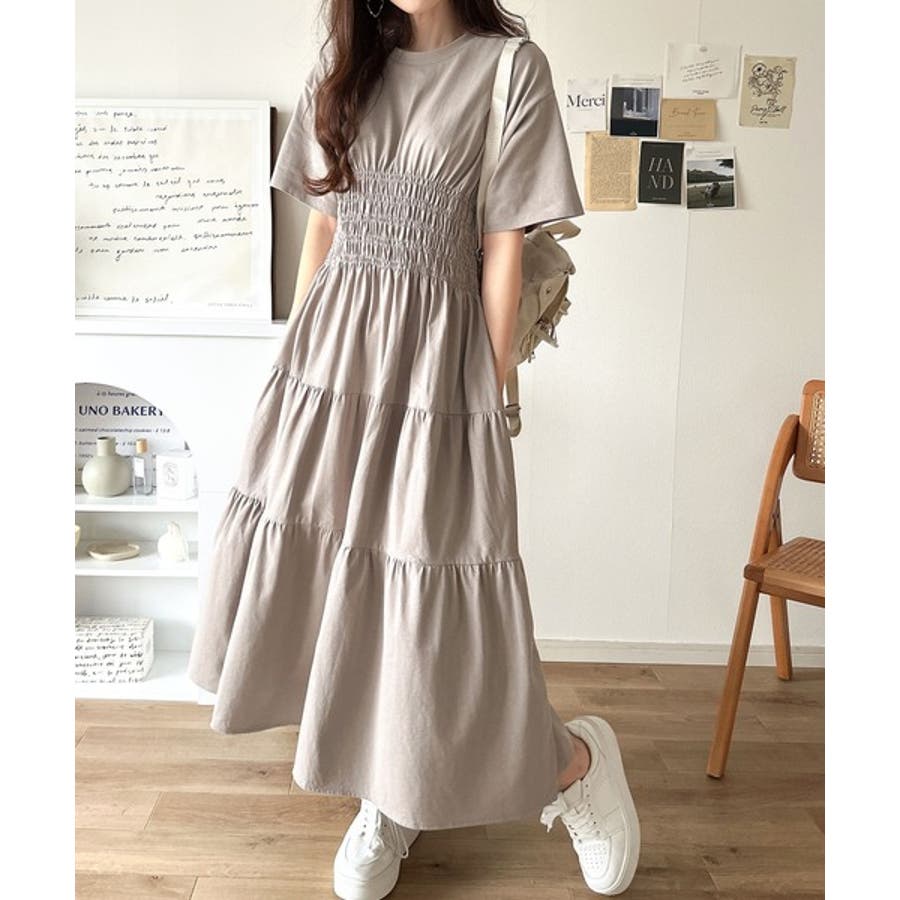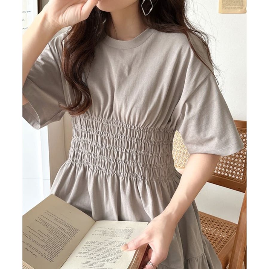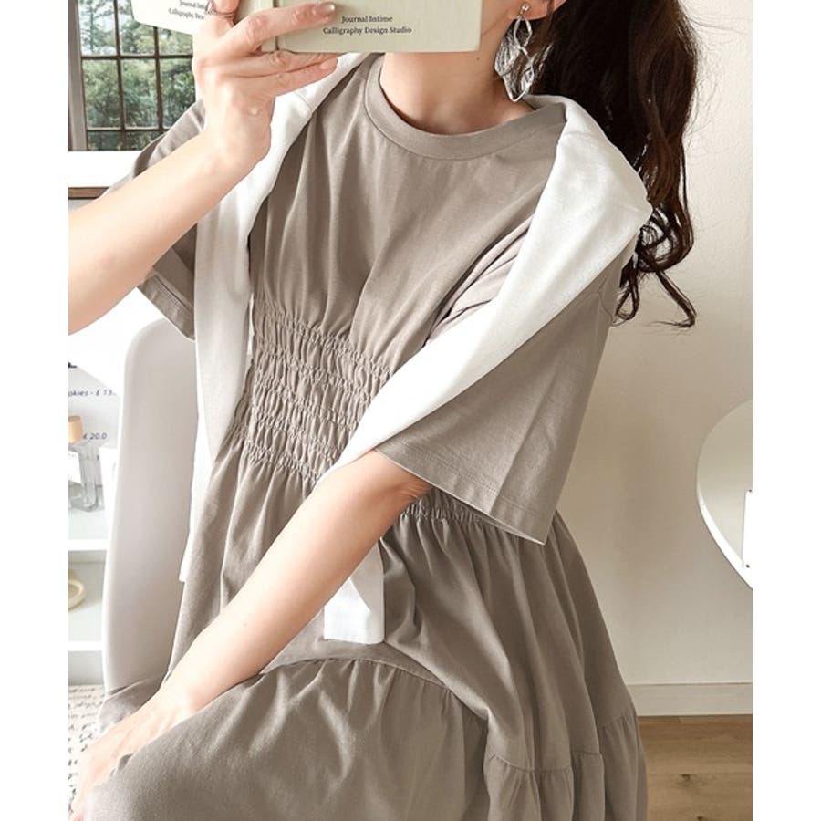 楽ちんキレイ見え。綿100%ウエストシャーリングティアードカット半袖ワンピース(…