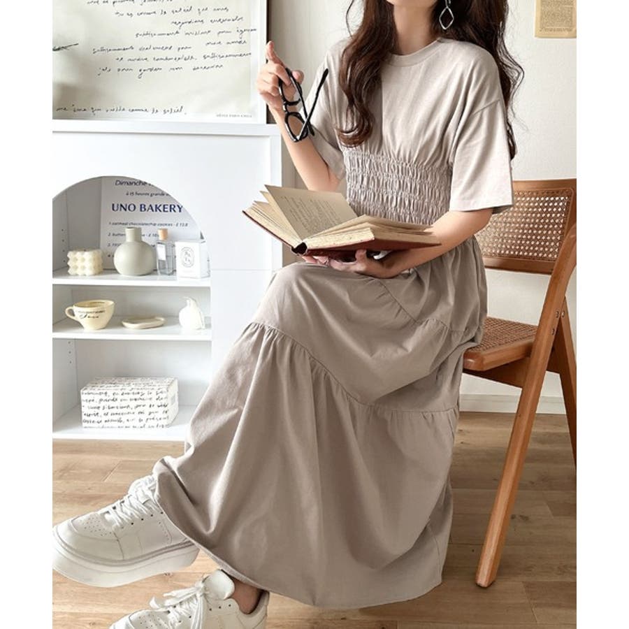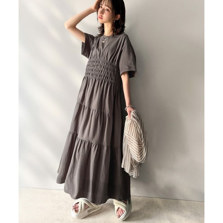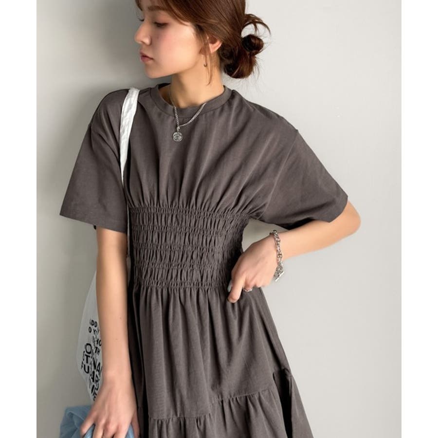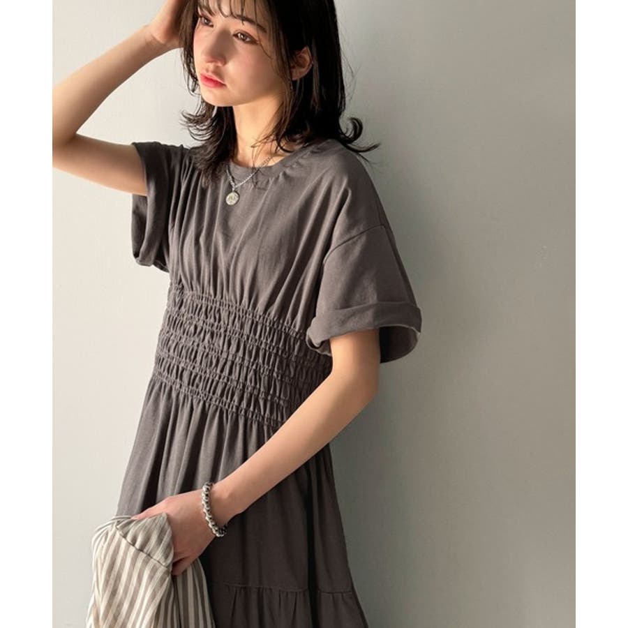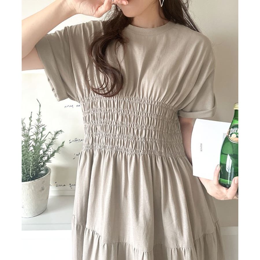 楽ちんキレイ見え。綿100%ウエストシャーリングティアードカット半袖ワンピース(…