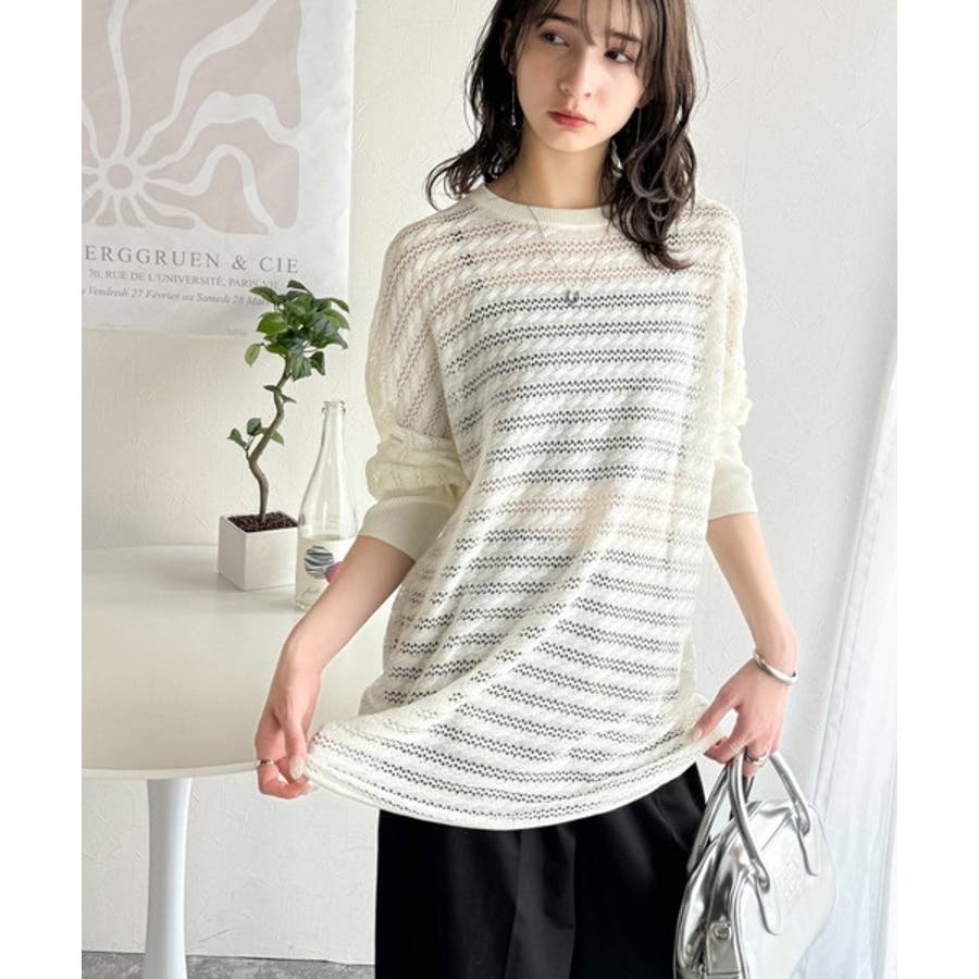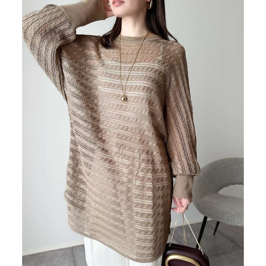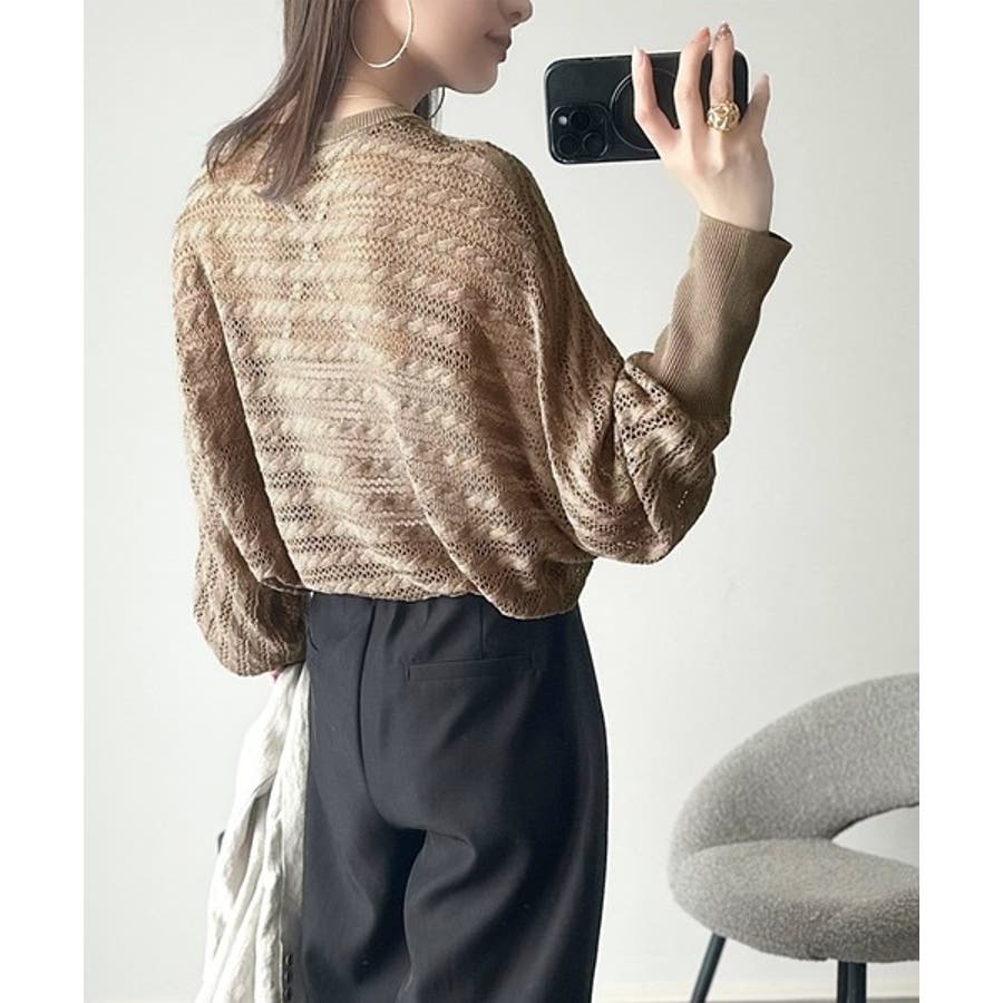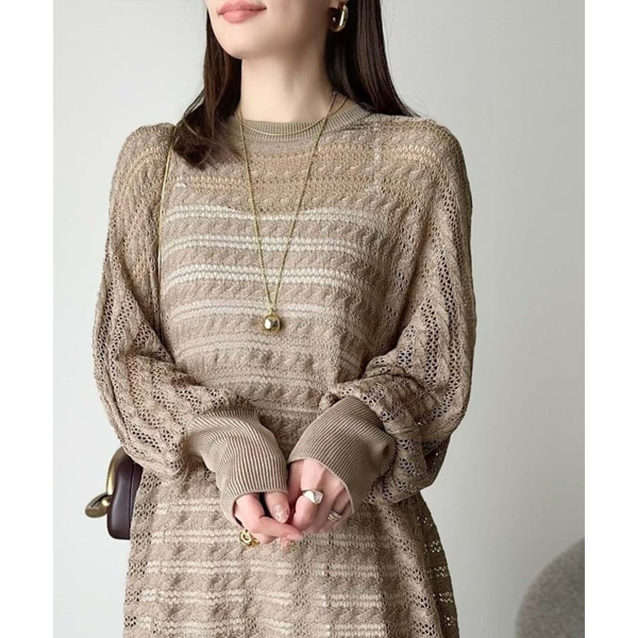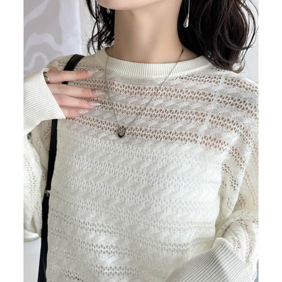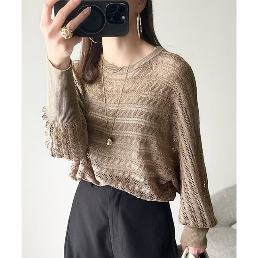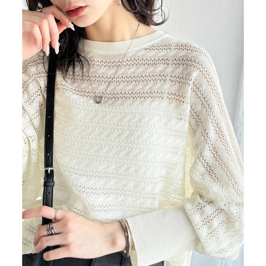 春夏シーズンにぴったりな透かし編み横使いケーブル柄ニットプルオーバー。