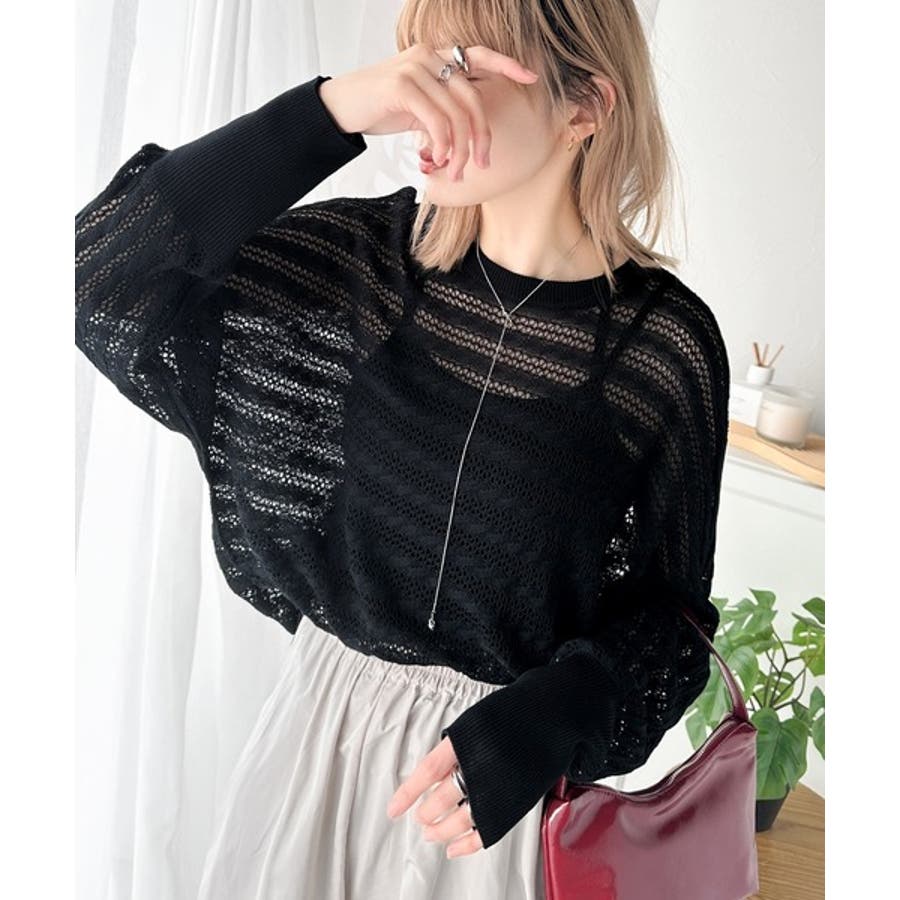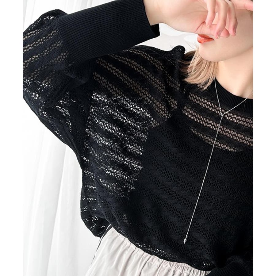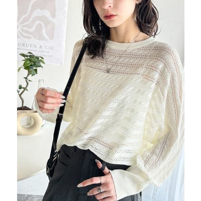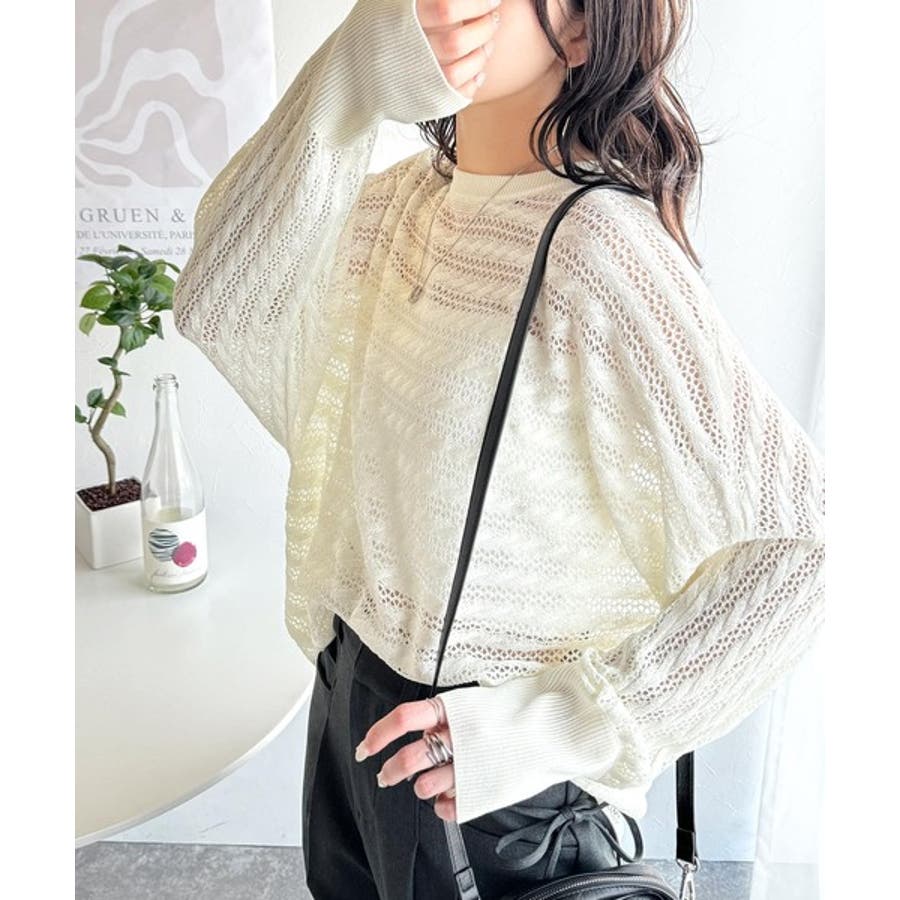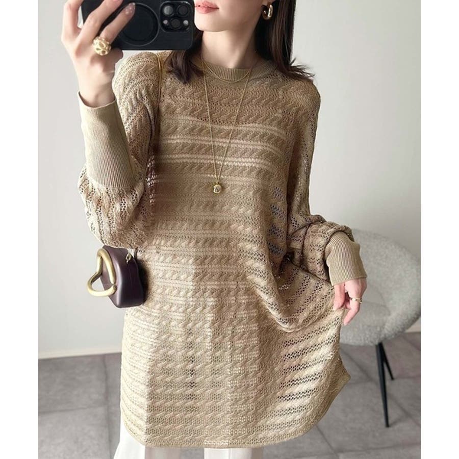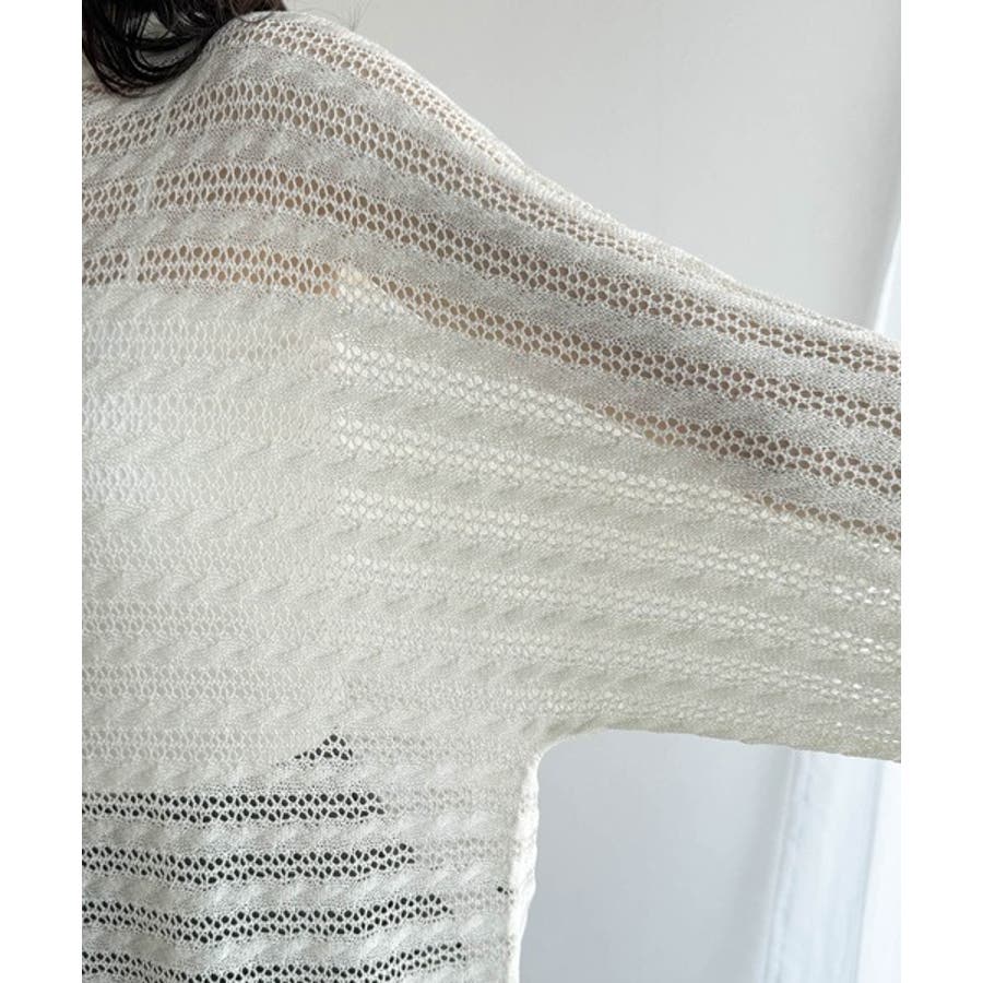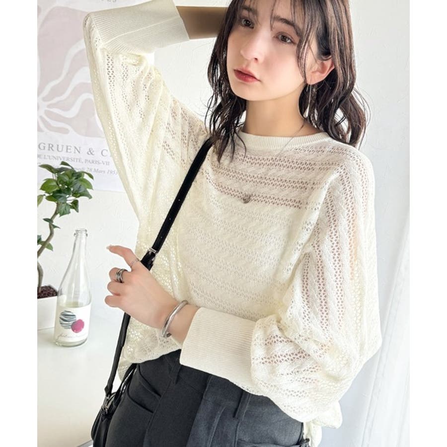 春夏シーズンにぴったりな透かし編み横使いケーブル柄ニットプルオーバー。