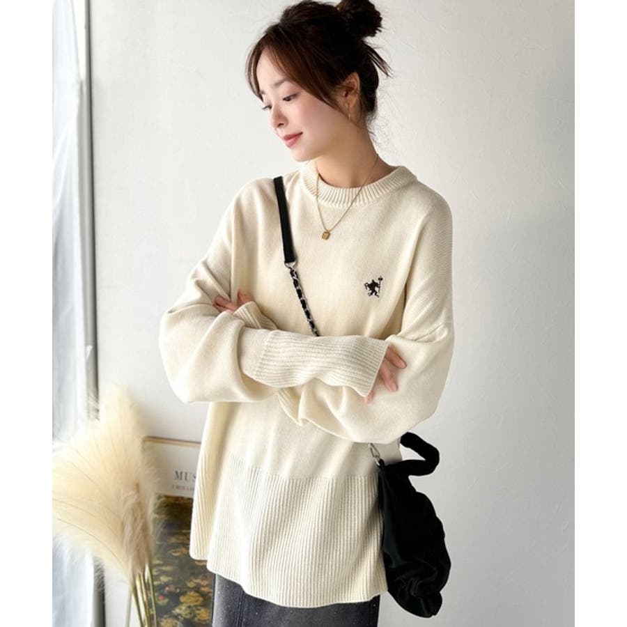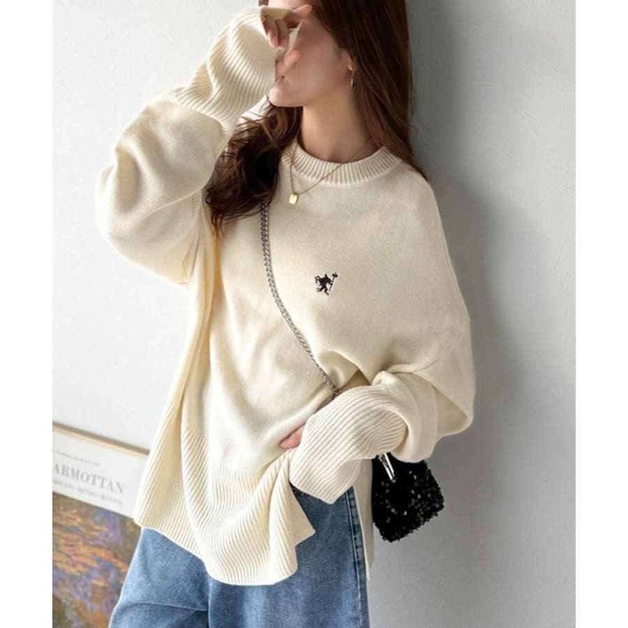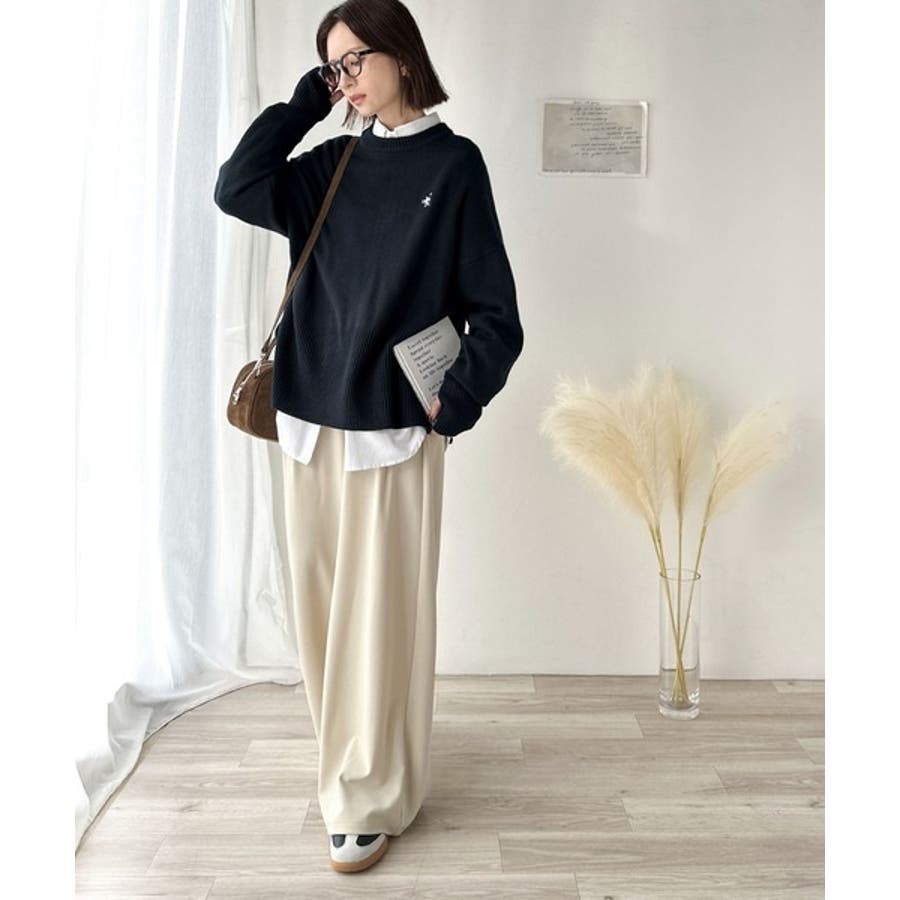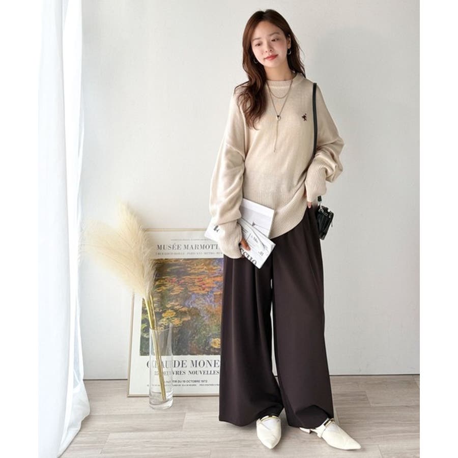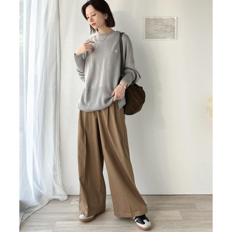 ゆったりとしたワイドシルエットに、さりげない胸元の刺繍が映えるシンプルなニットトップス。