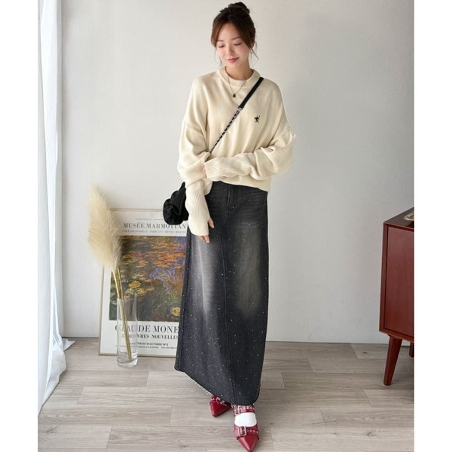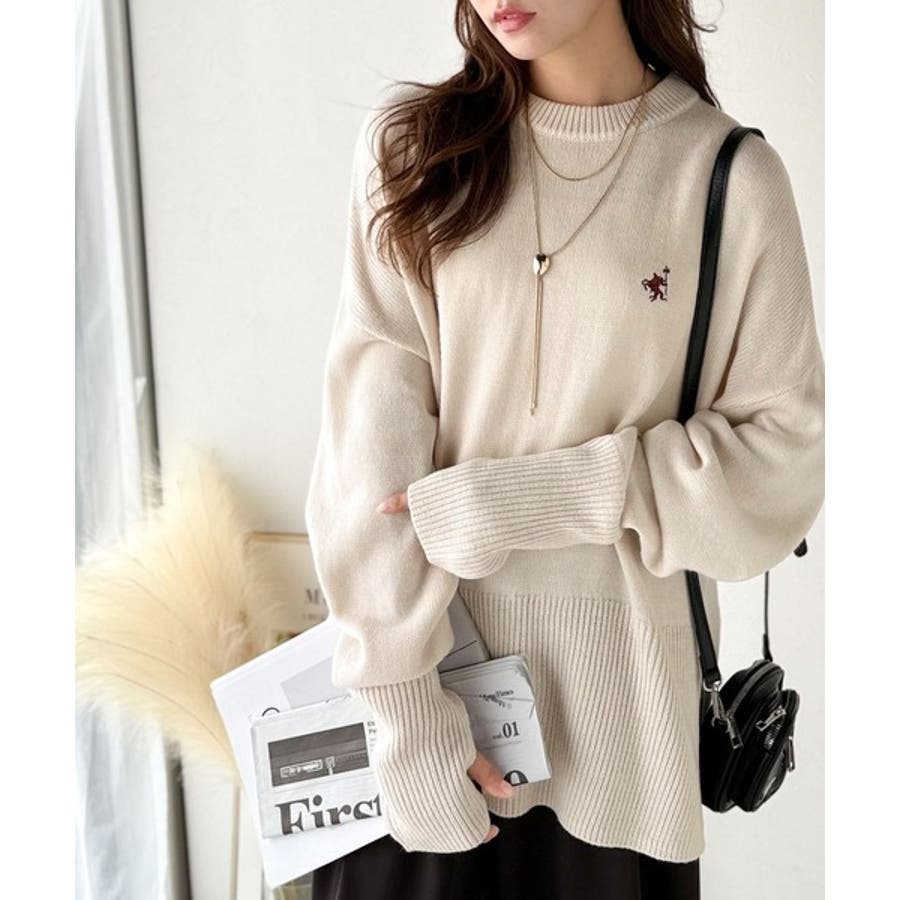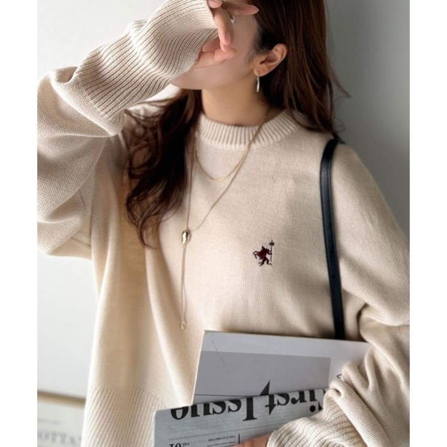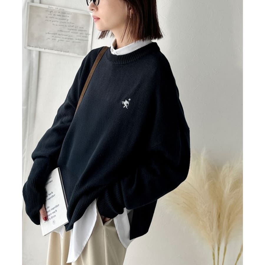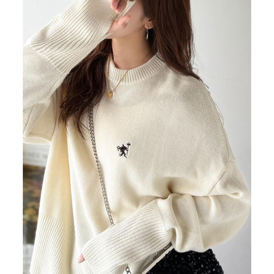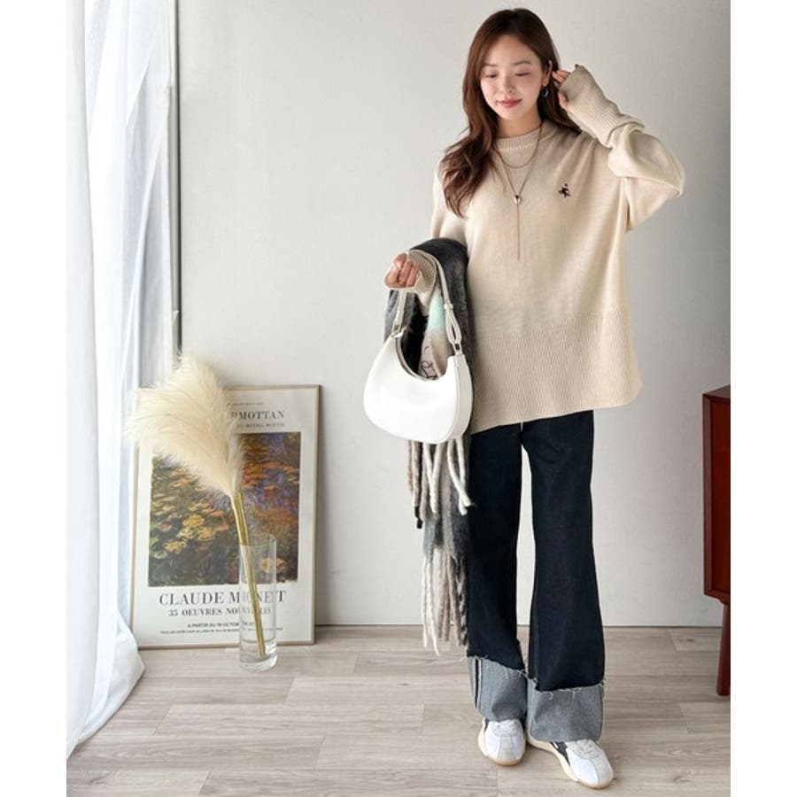 ゆったりとしたワイドシルエットに、さりげない胸元の刺繍が映えるシンプルなニットトップス。