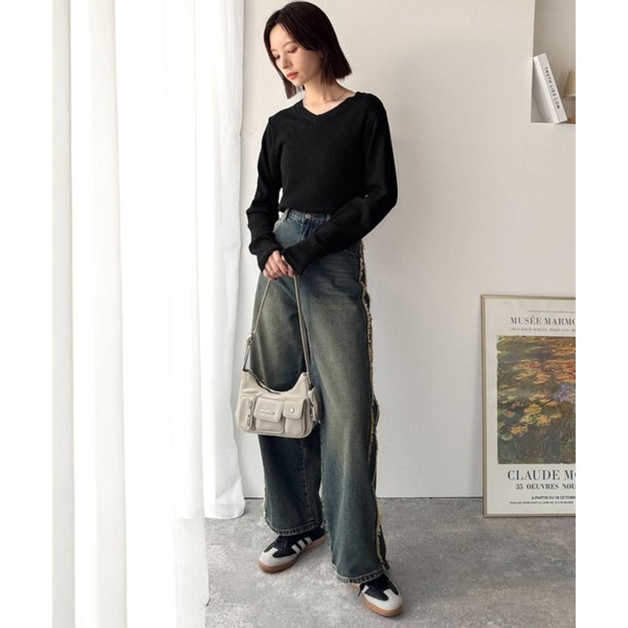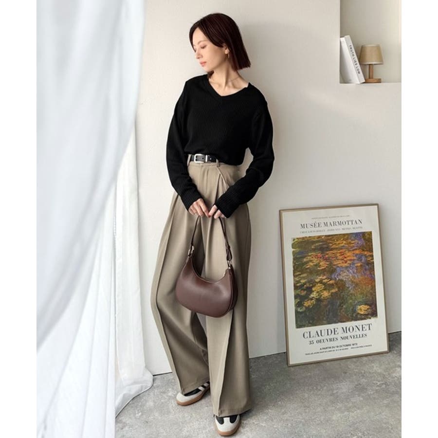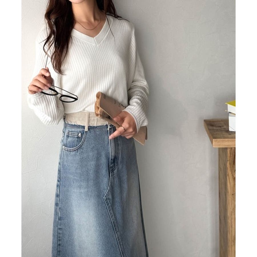 Vネックがデコルテをきれいに見せて、カジュアルにもきれいめにもマッチ。