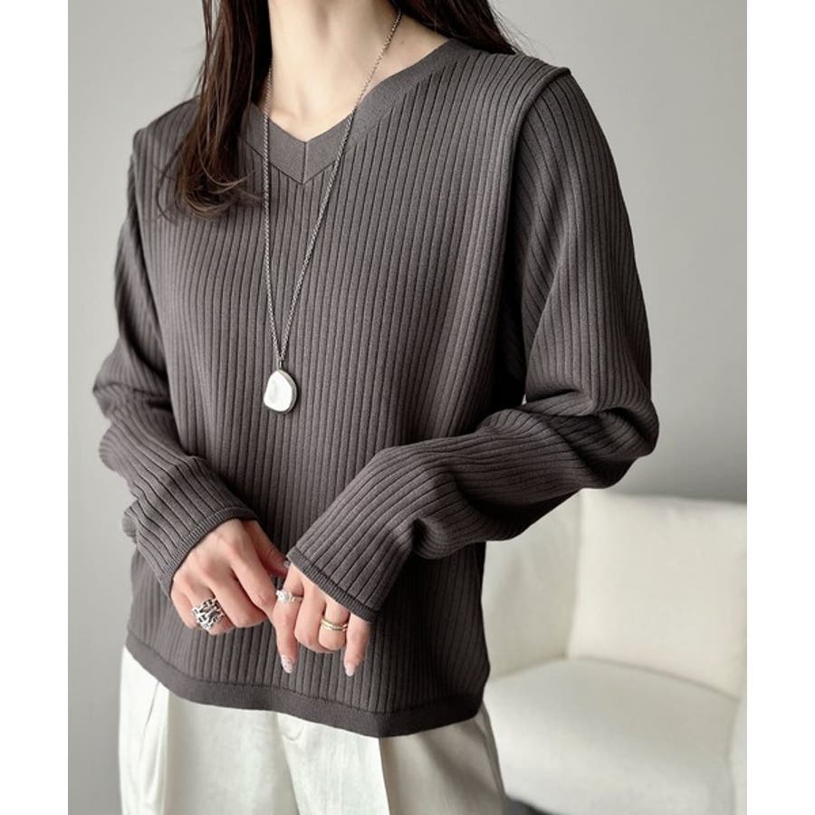 針抜きリブを使用したニット素材で、軽やかに着こなせるVネックトップス。