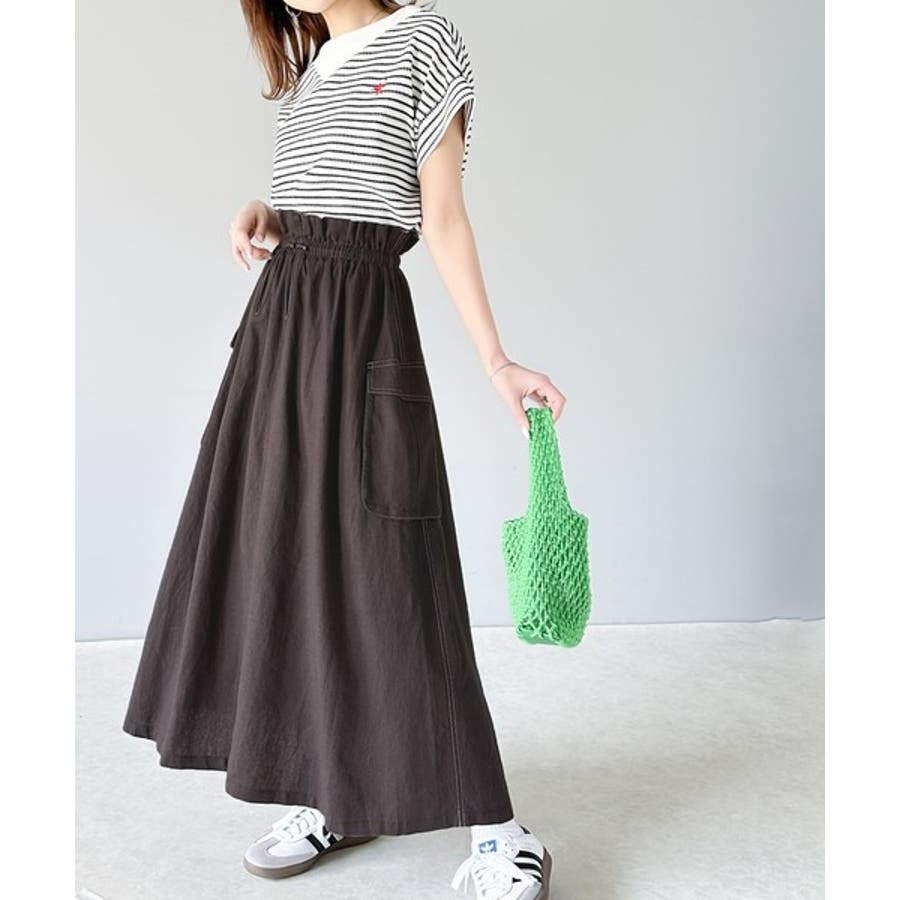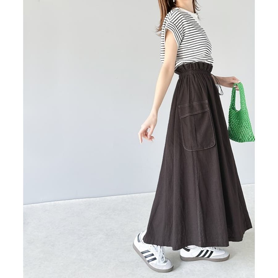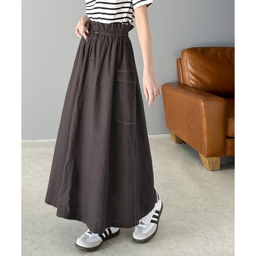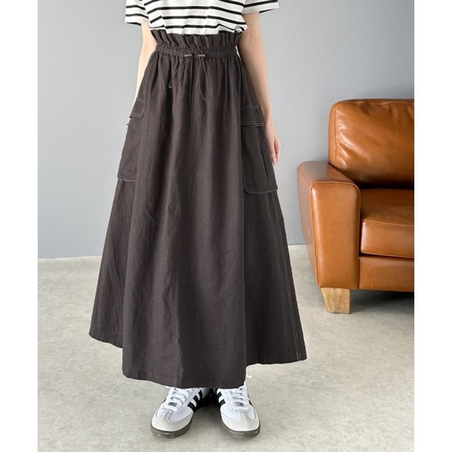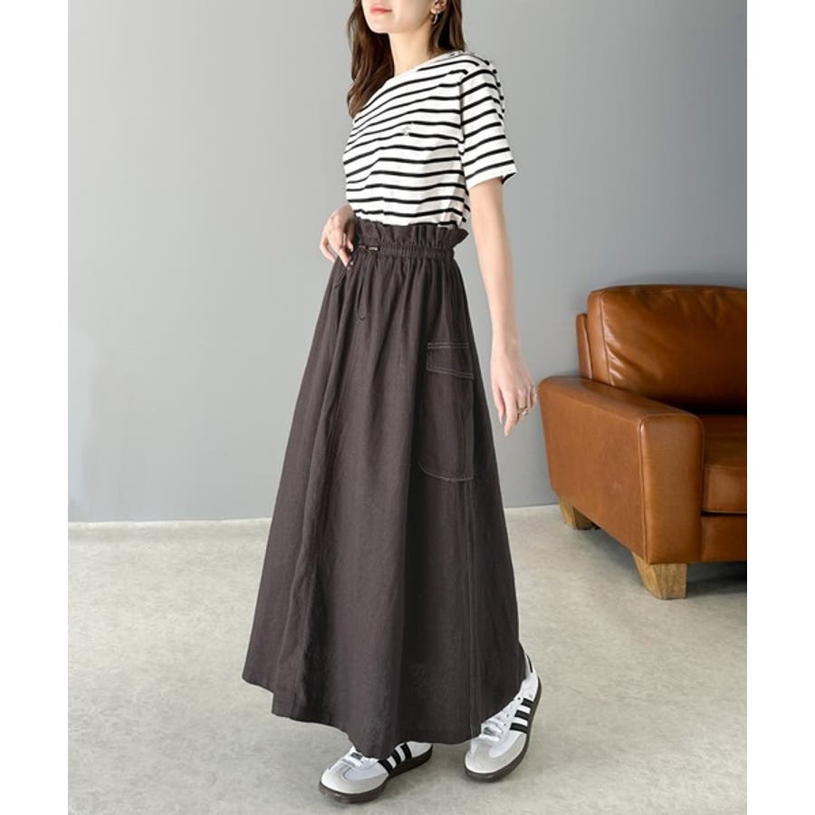 ふんわりカジュアル。麻混ウエストドロスト配色ステッチロングスカート