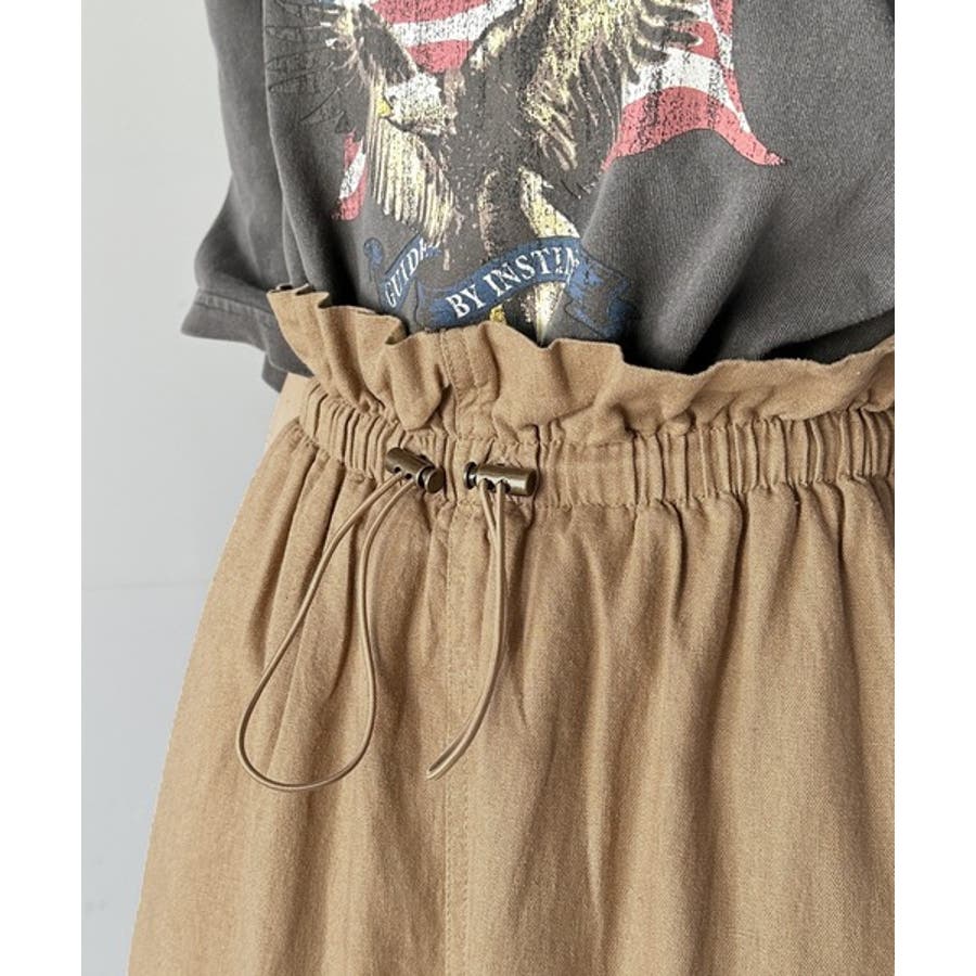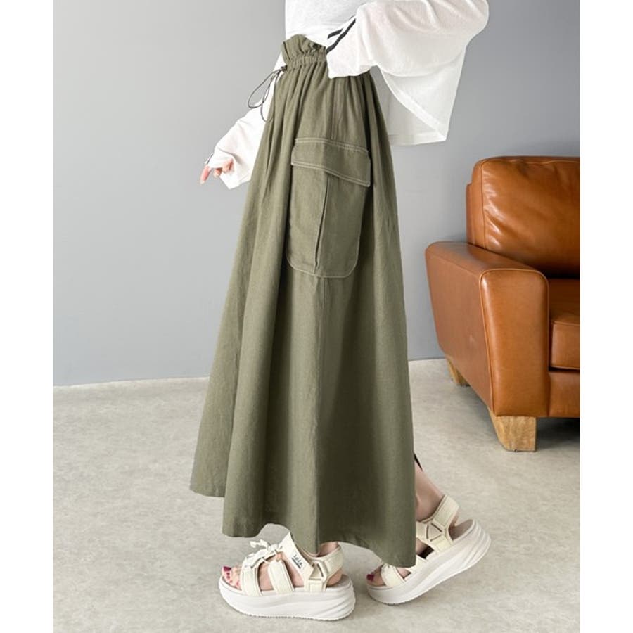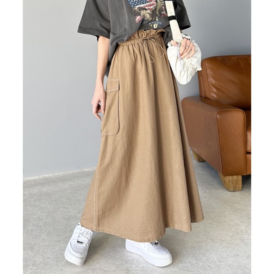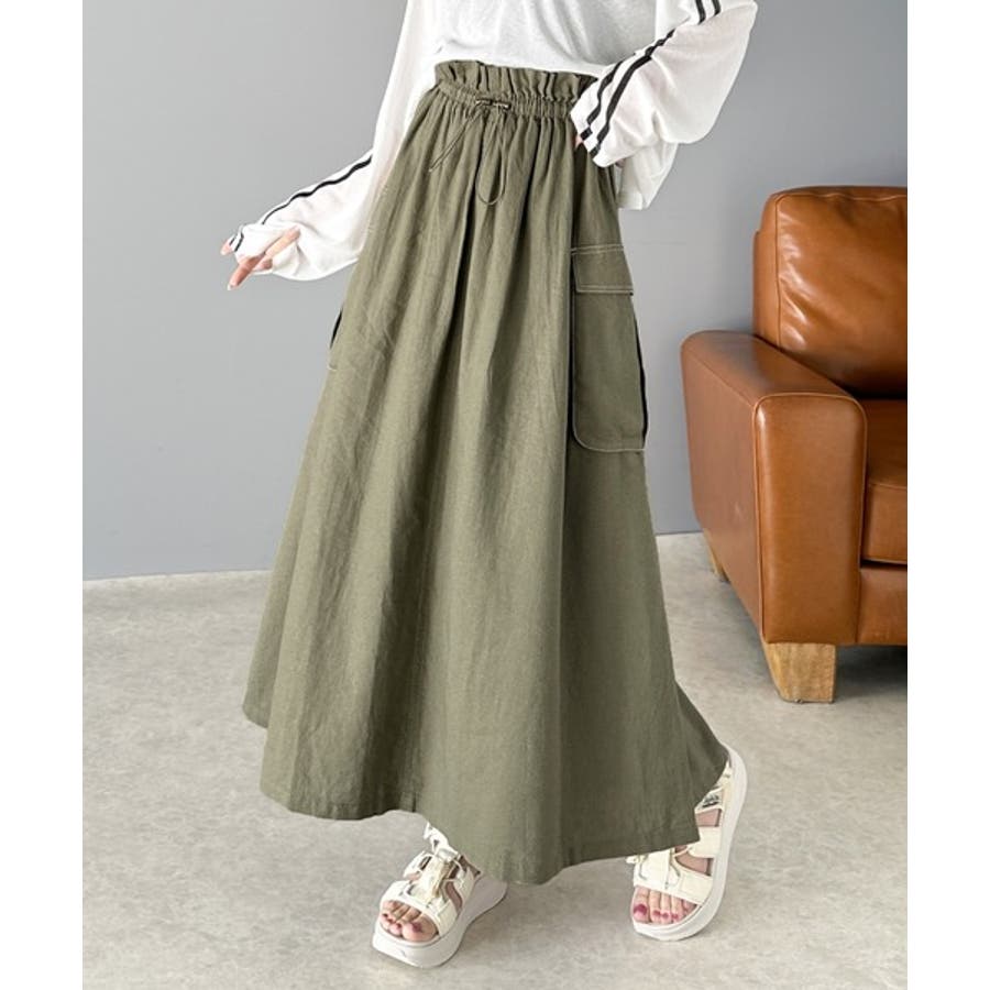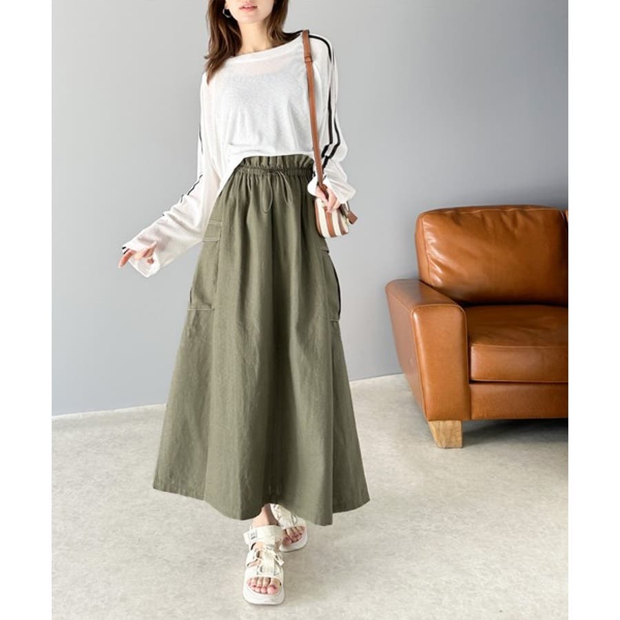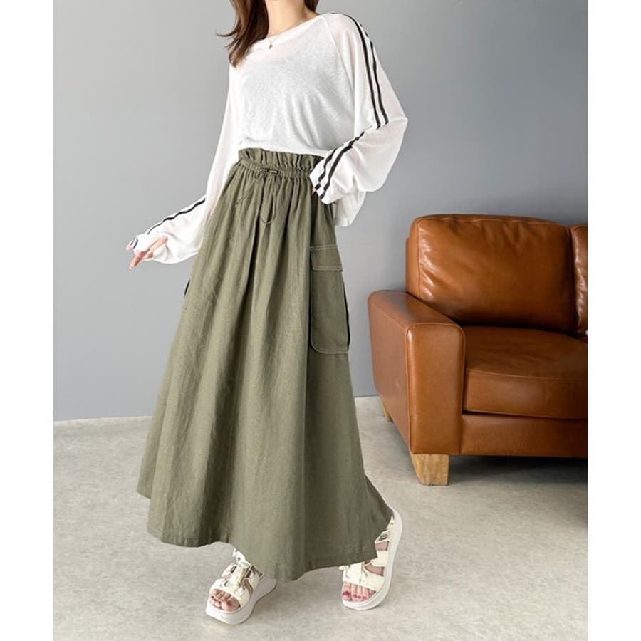 ふんわりカジュアル。麻混ウエストドロスト配色ステッチロングスカート