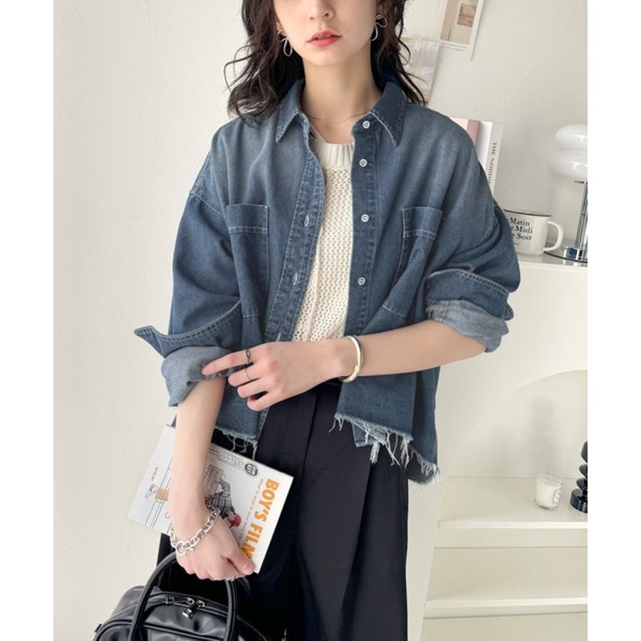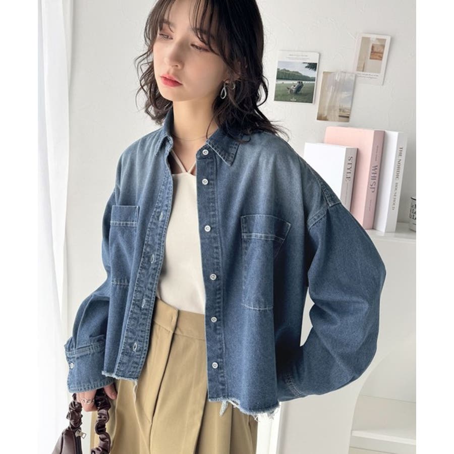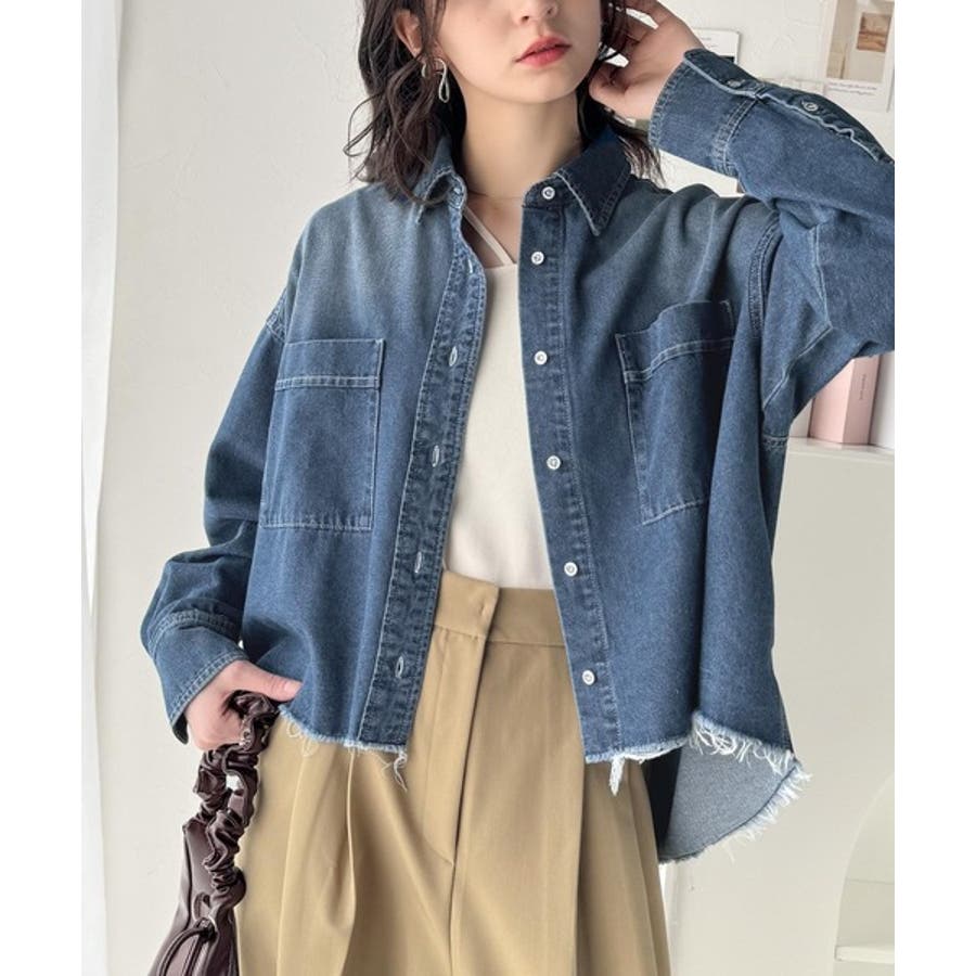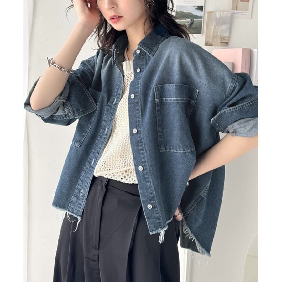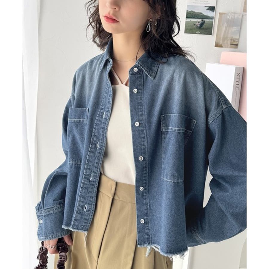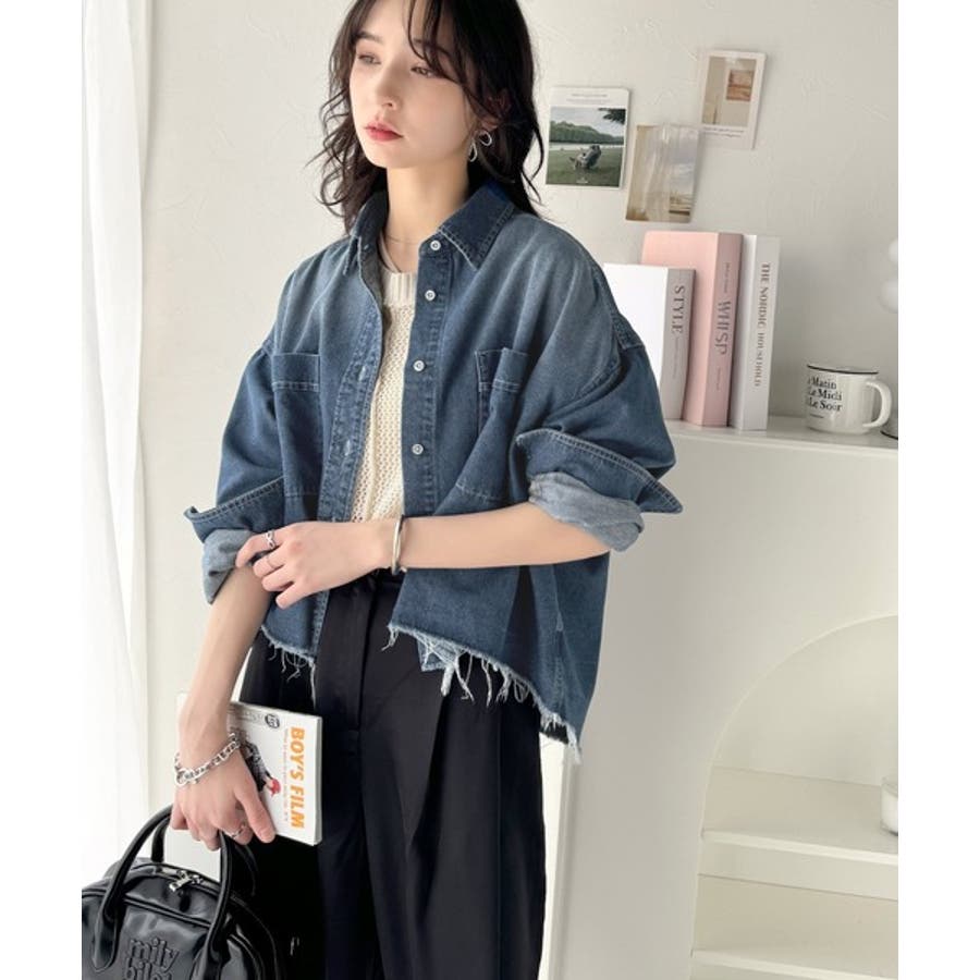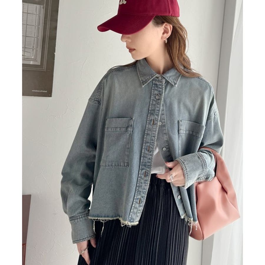 ヴィンテージライクな加工と裾のフリンジが魅力のクロップドデニムシャツ。