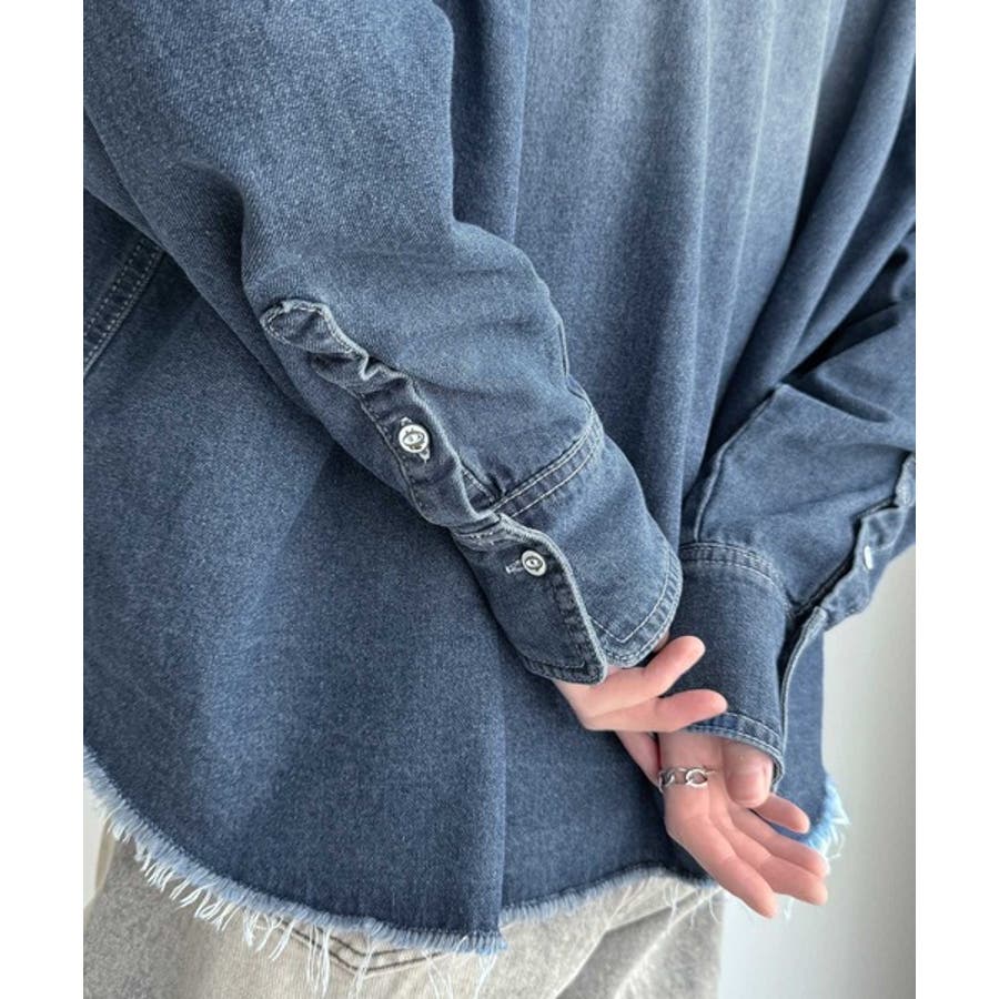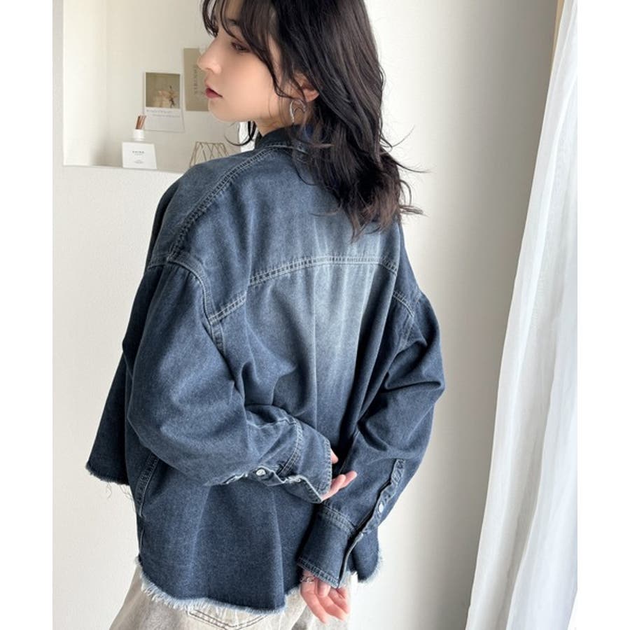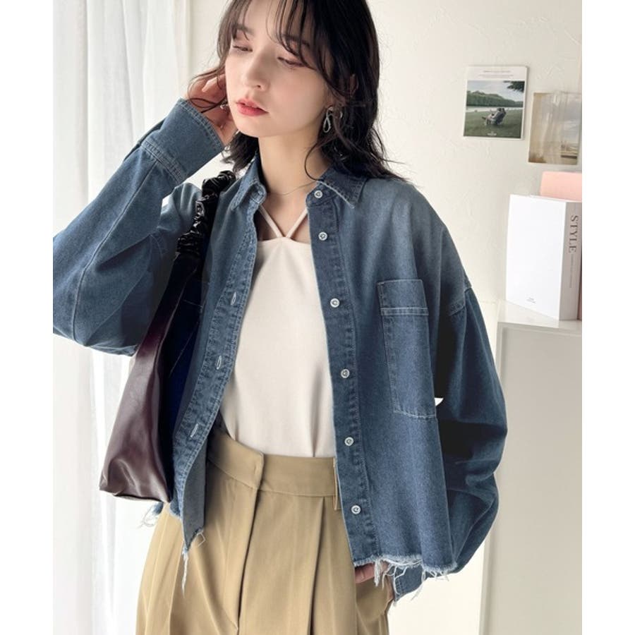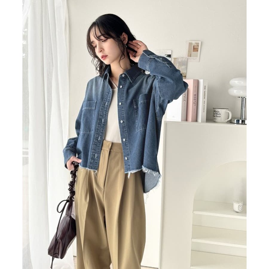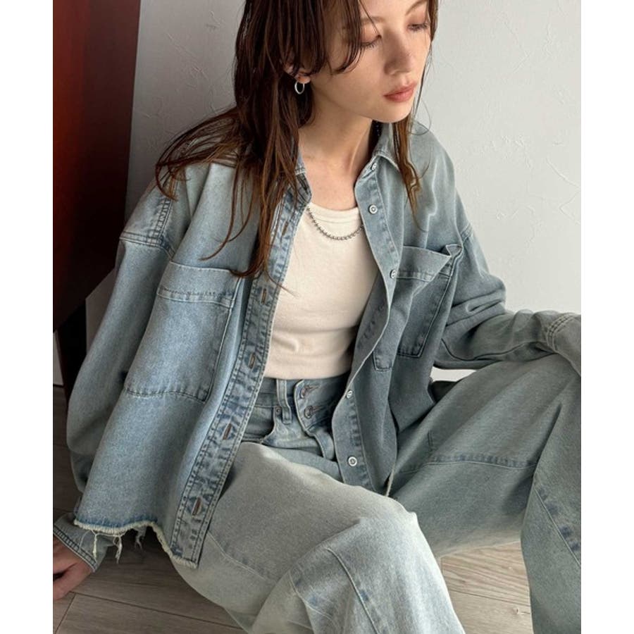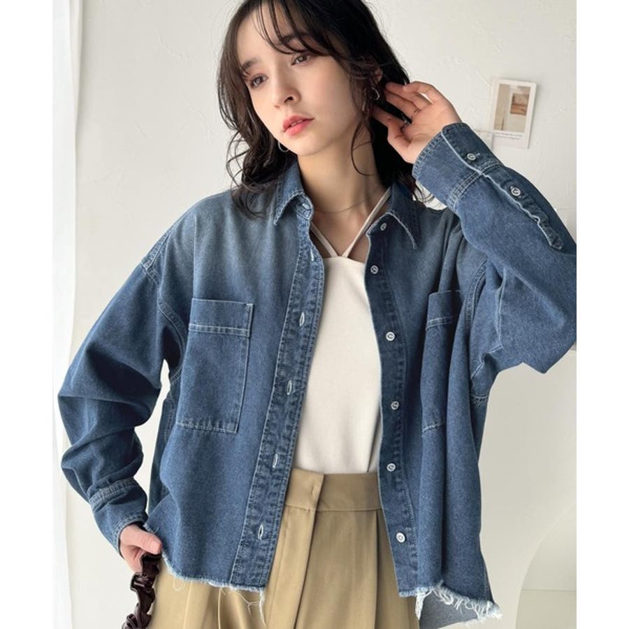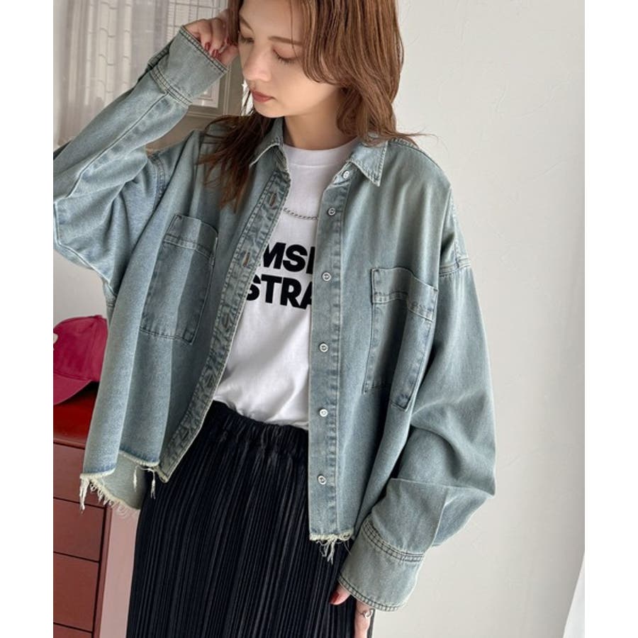 ヴィンテージライクな加工と裾のフリンジが魅力のクロップドデニムシャツ。