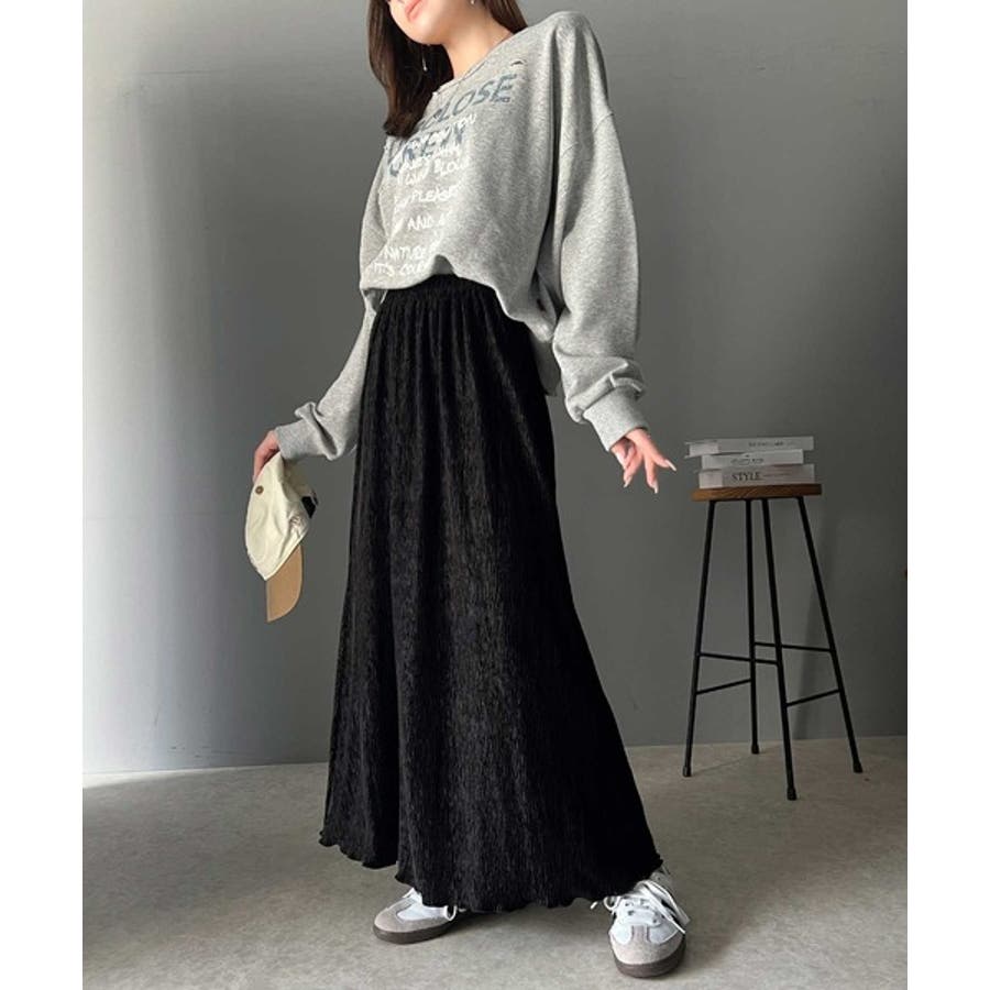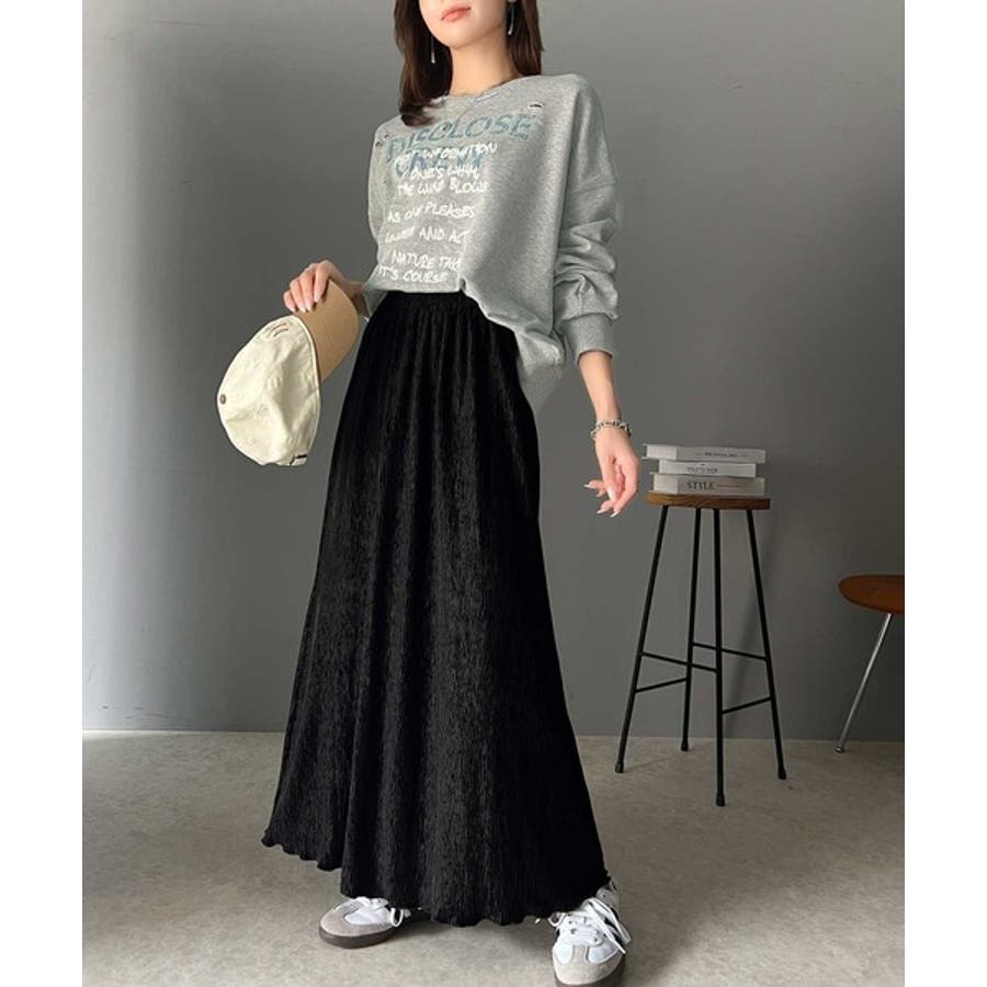 スウェットやトレーナーなどの楽ちんアイテムと合わせても、スカートの上品さで一気に洗練された印象に!