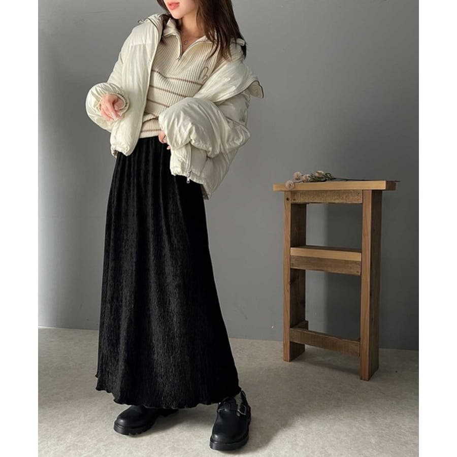 光沢感と揺れが美しい、簡単に着こなしスタイル。シャイニーベロアナロースカート