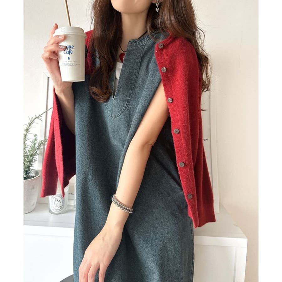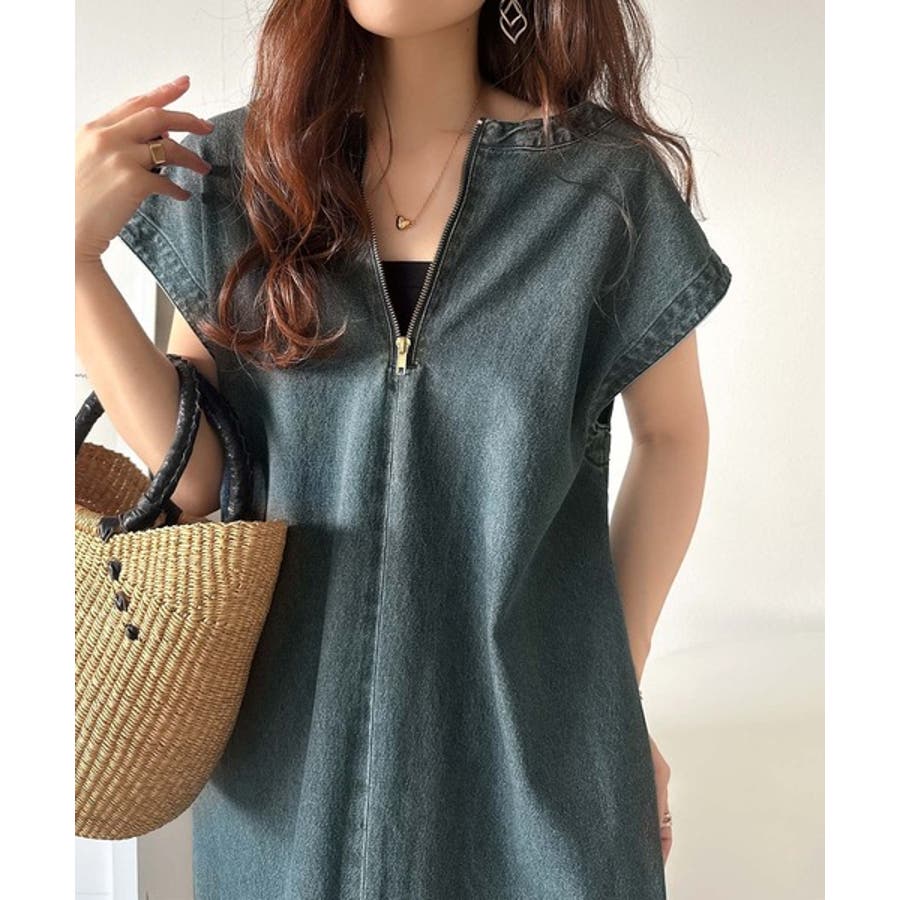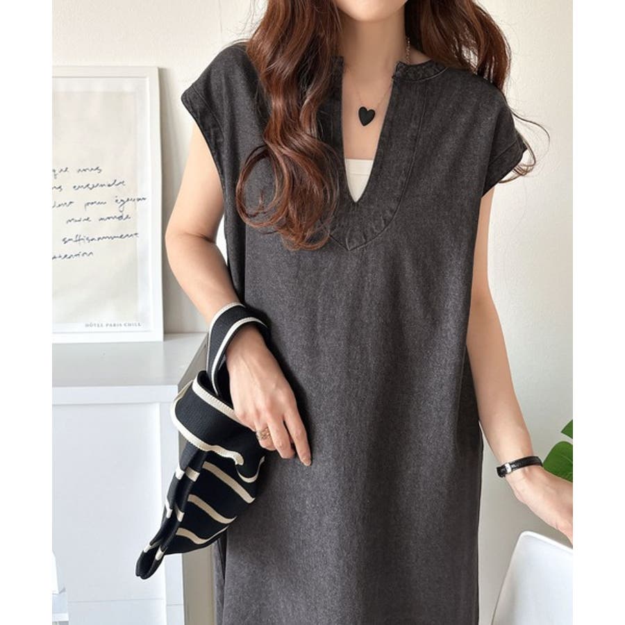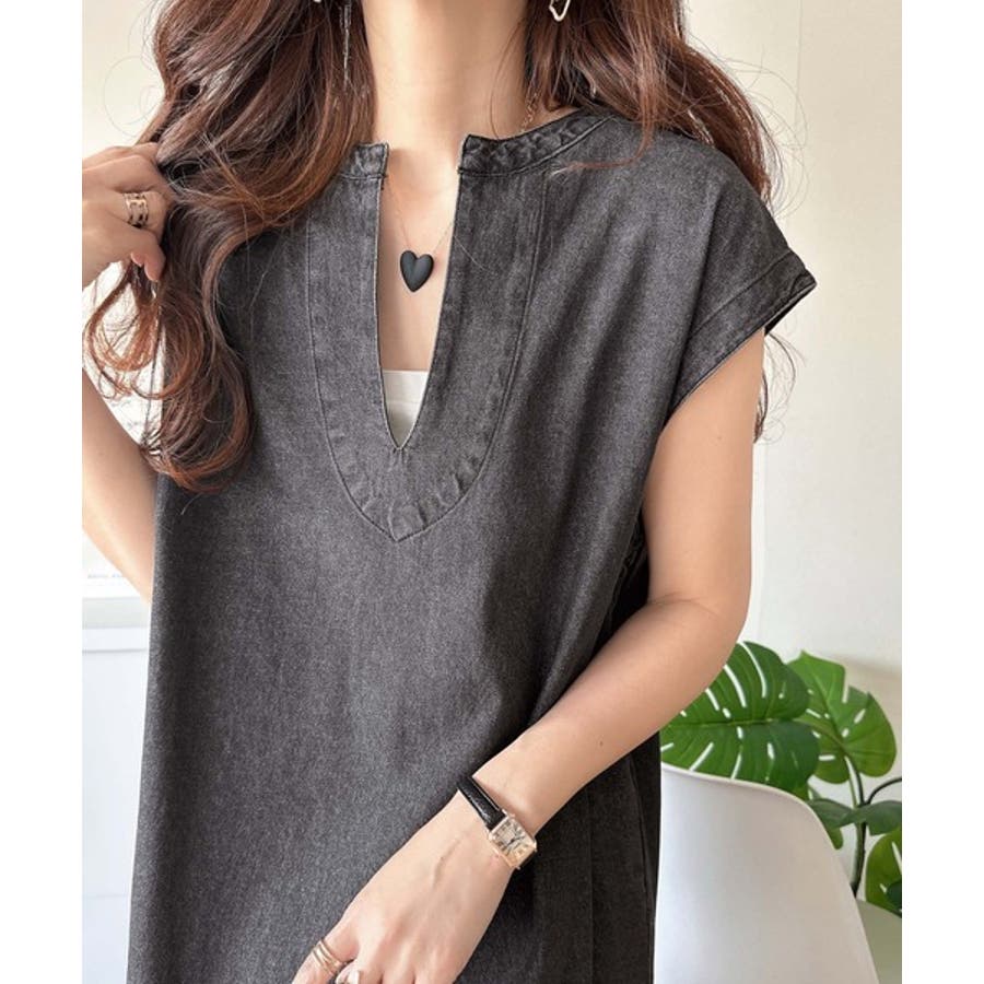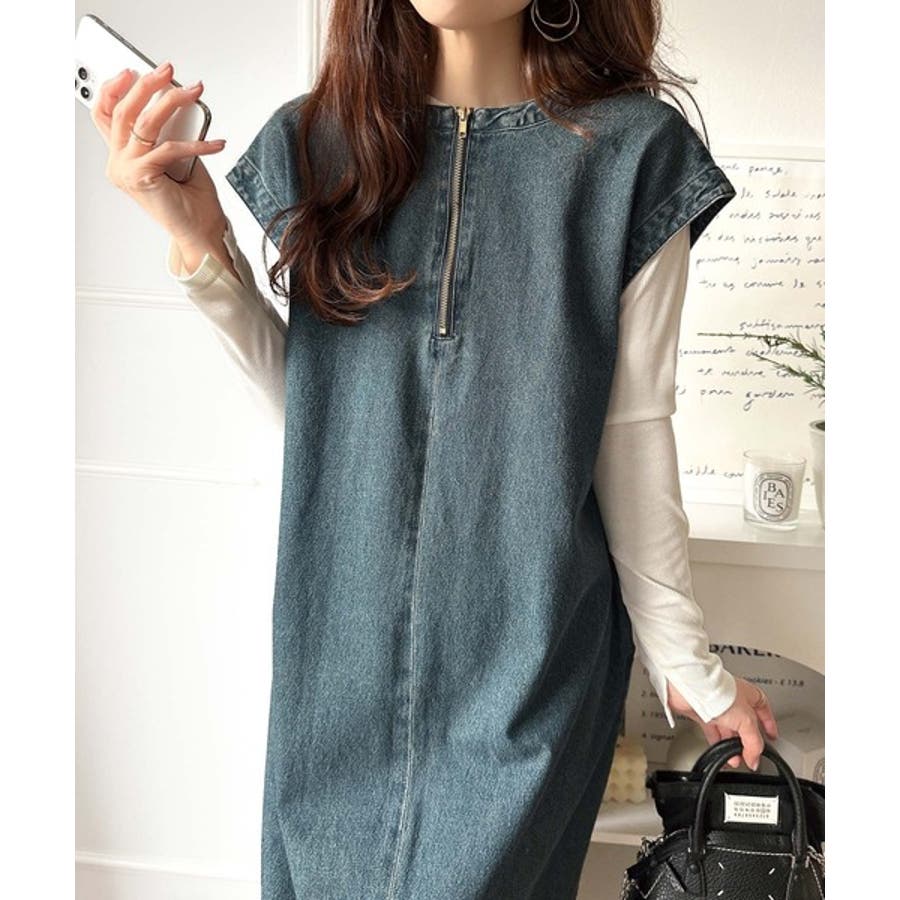 胸元が程よく空いているので、デコルテがさりげなく見えて良い感じです。ジーンズ地だけど、しっかりした素材で色も落ち着いているので、カジュアルになりすぎない。