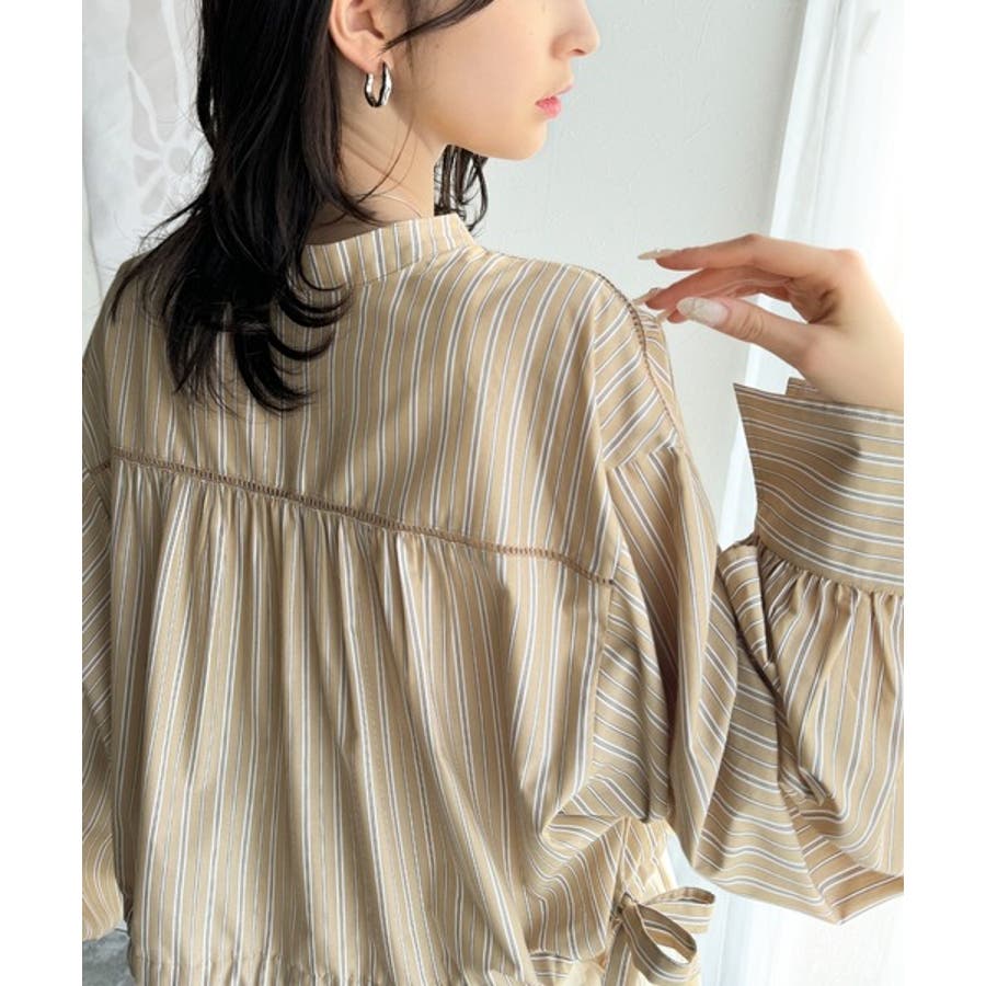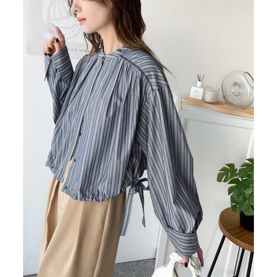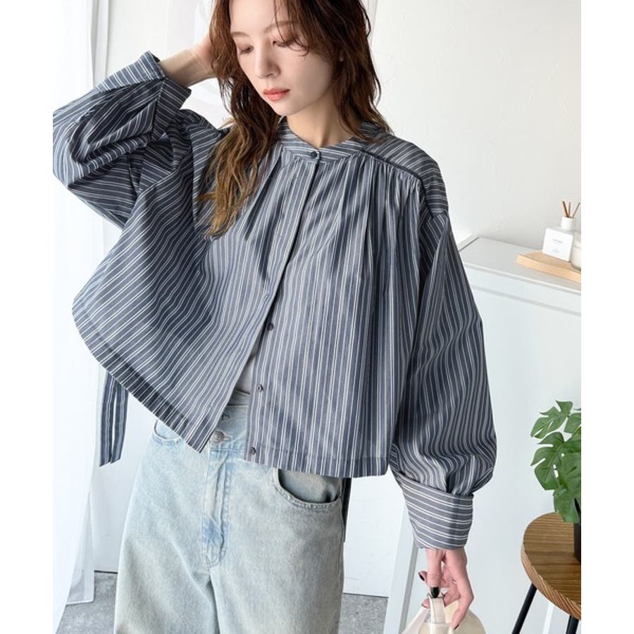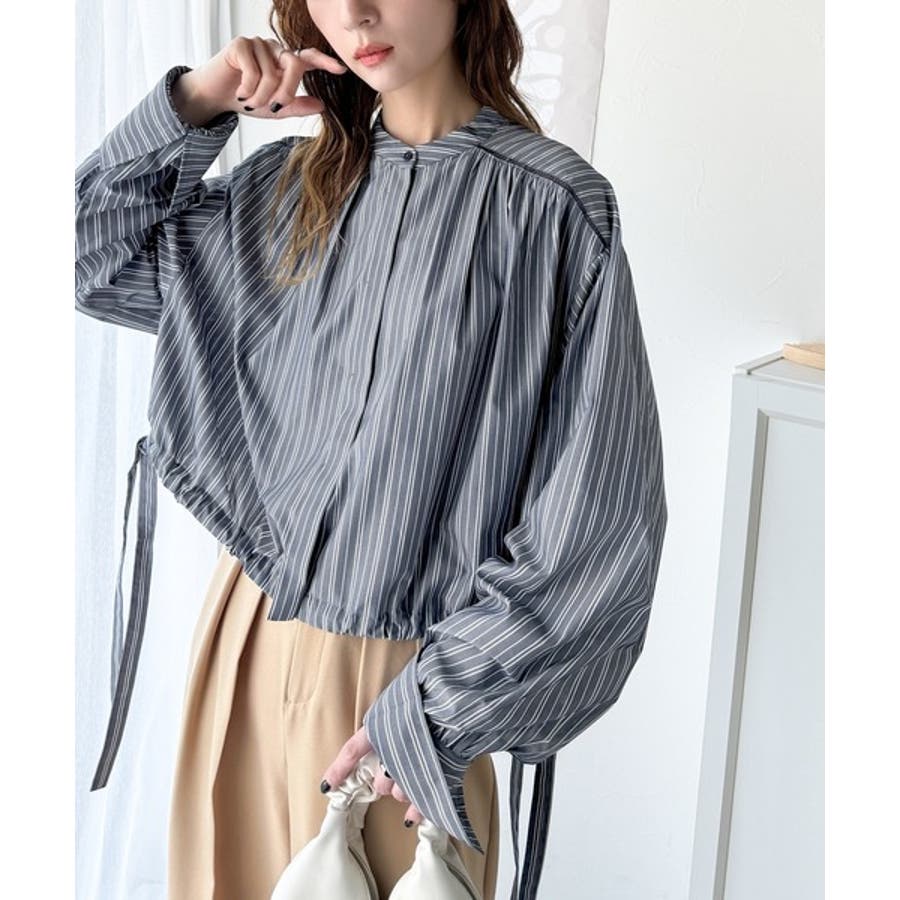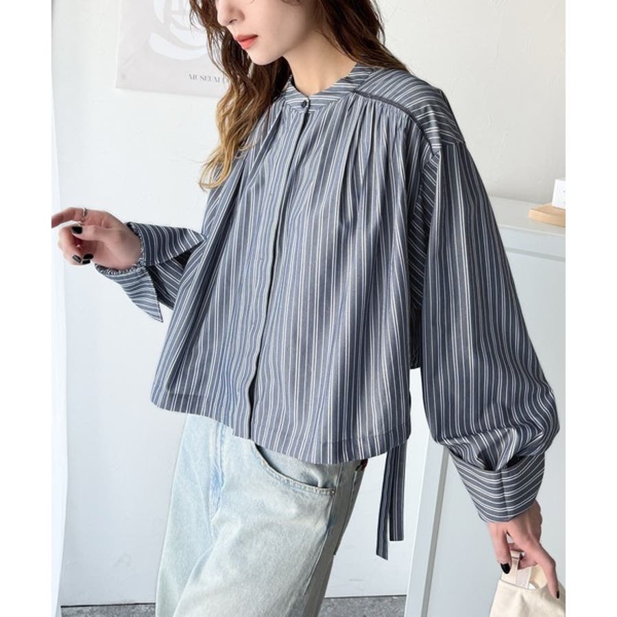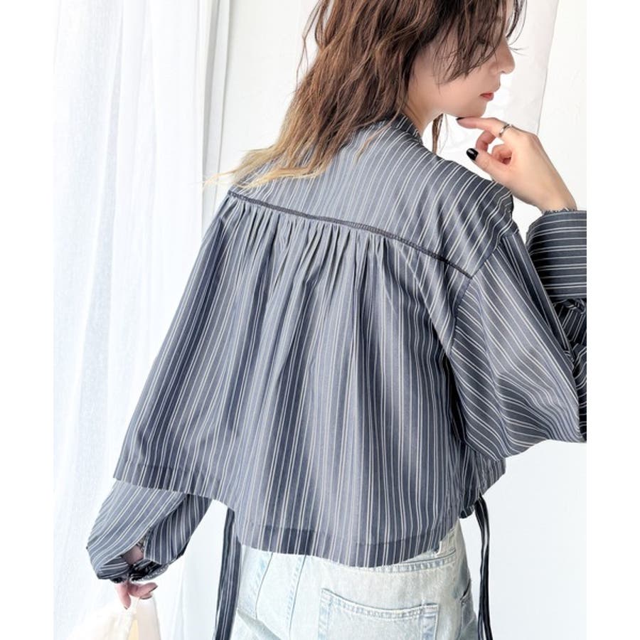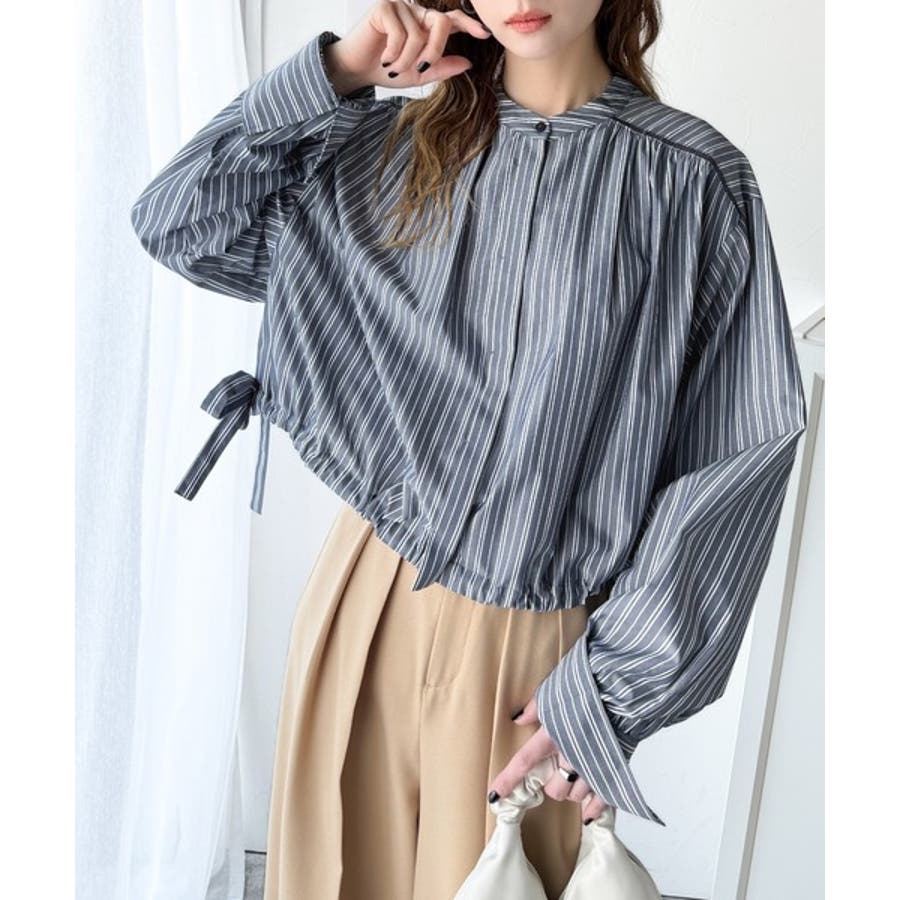 愛らしさと清楚感を両立する、リボンヘムクロップドギャザー長袖ストライプブラウス