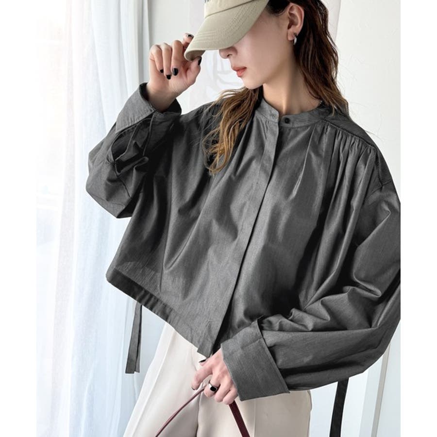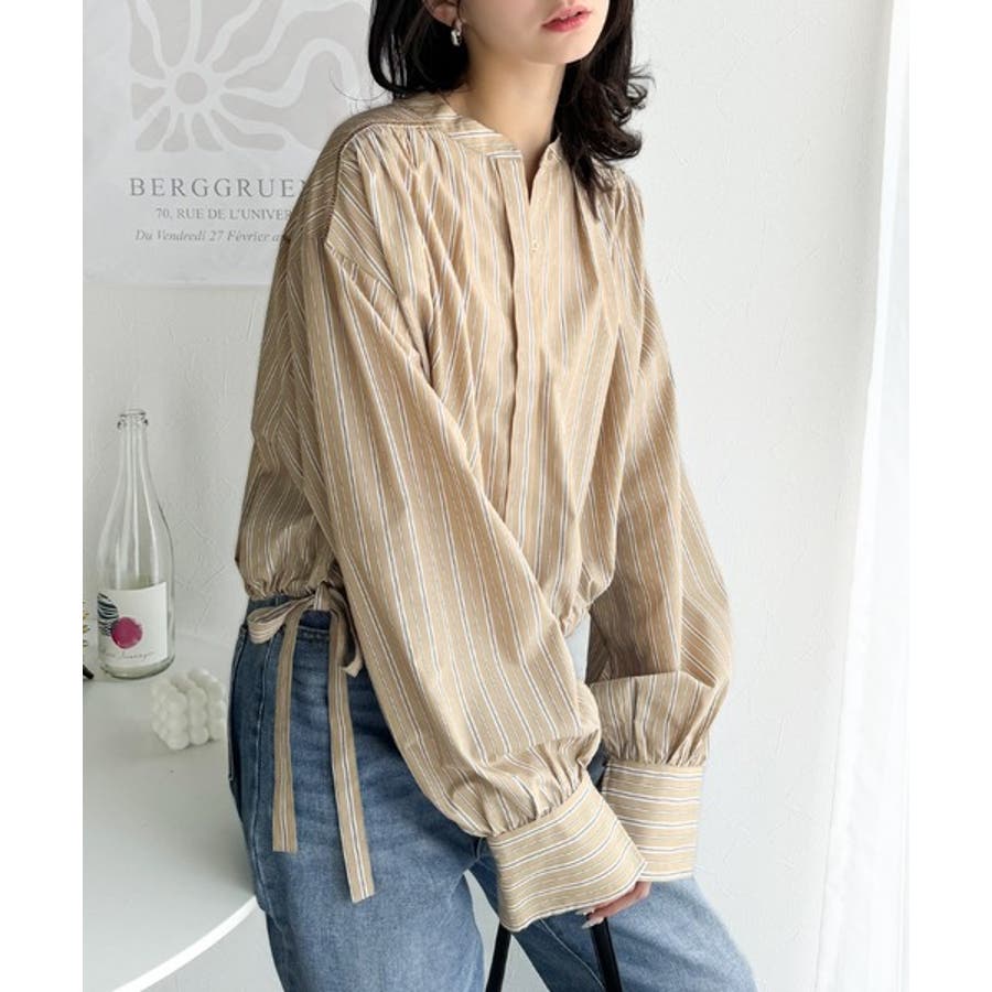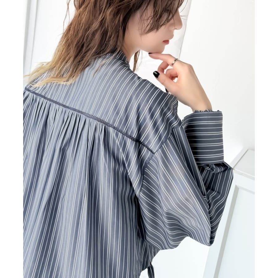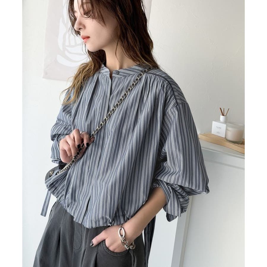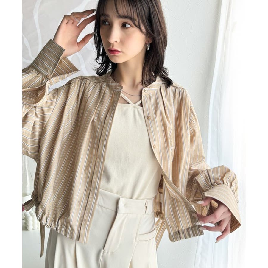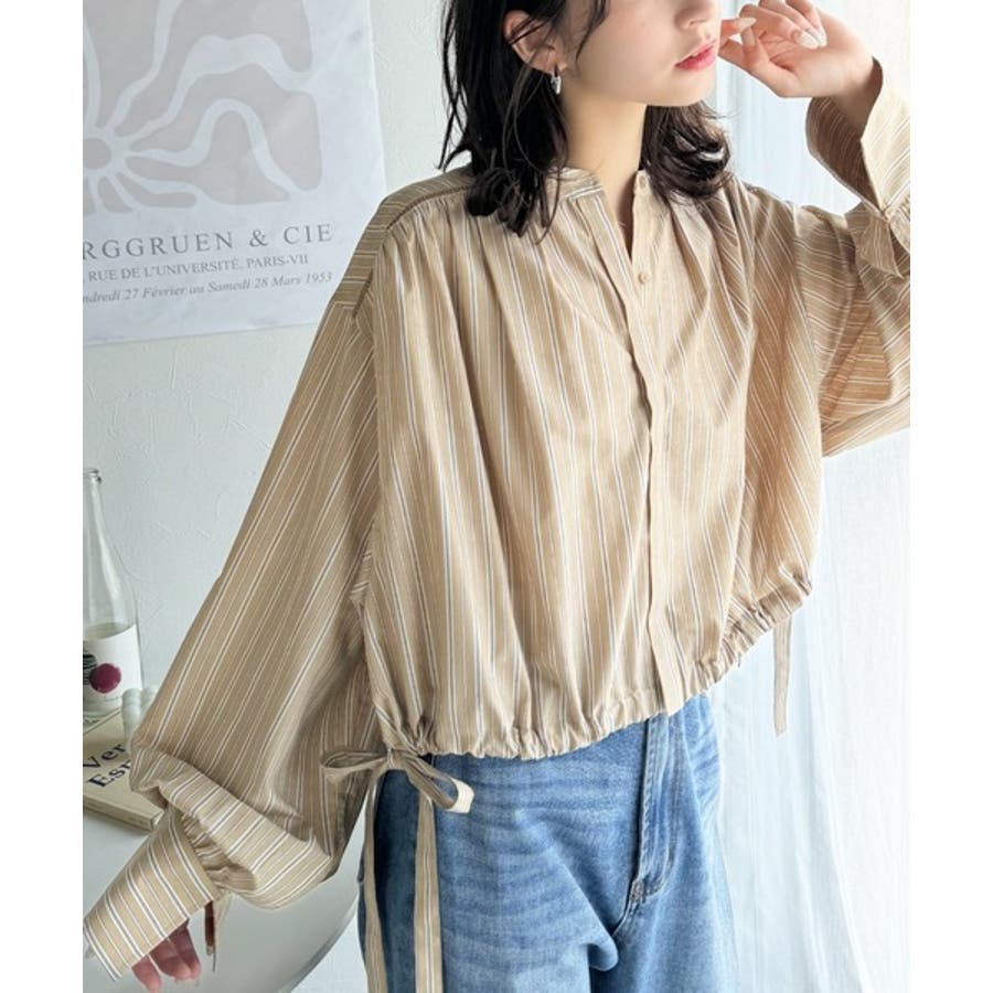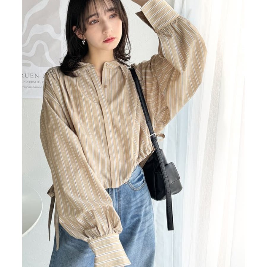 愛らしさと清楚感を両立する、リボンヘムクロップドギャザー長袖ストライプブラウス