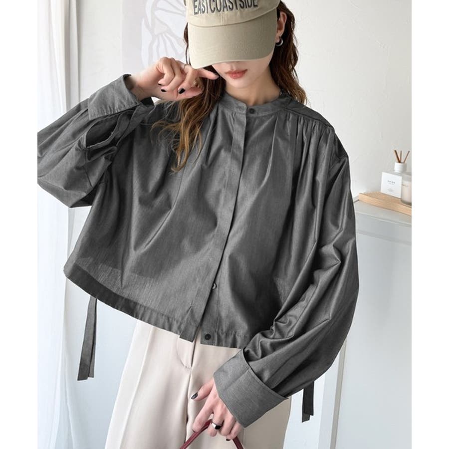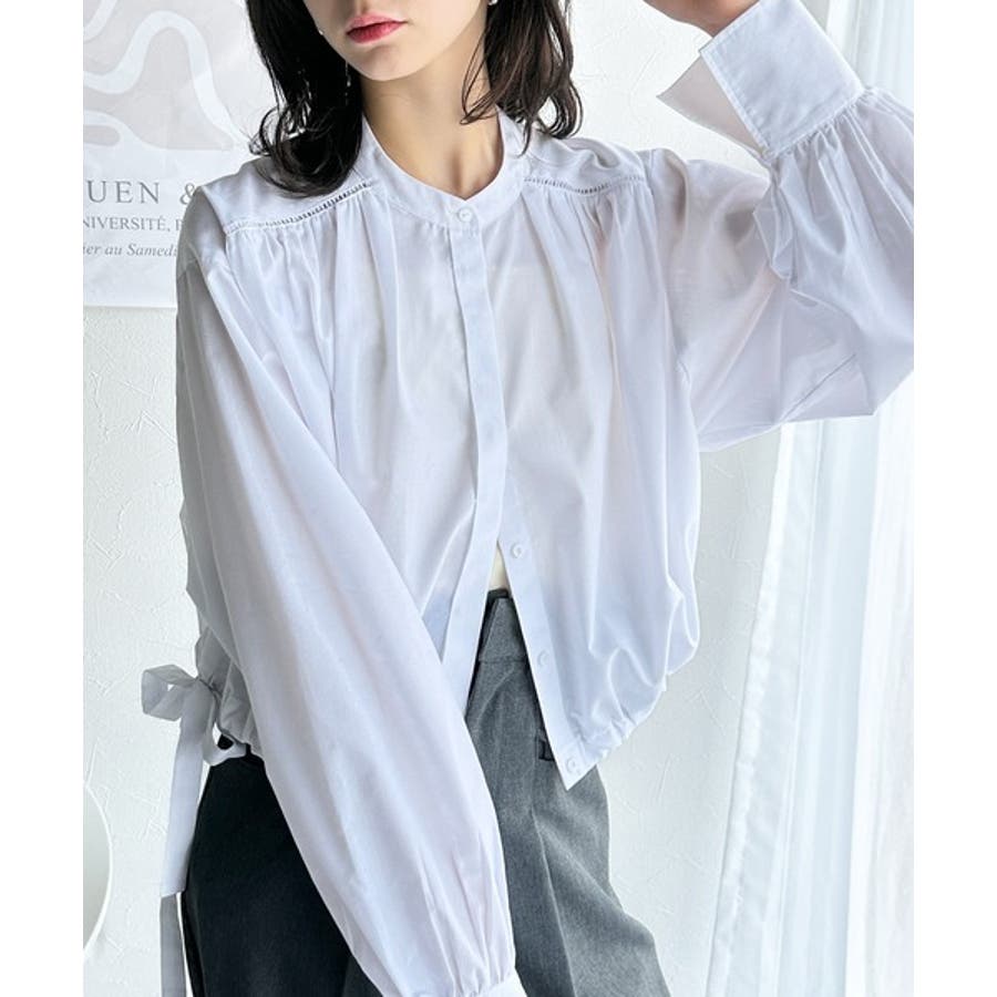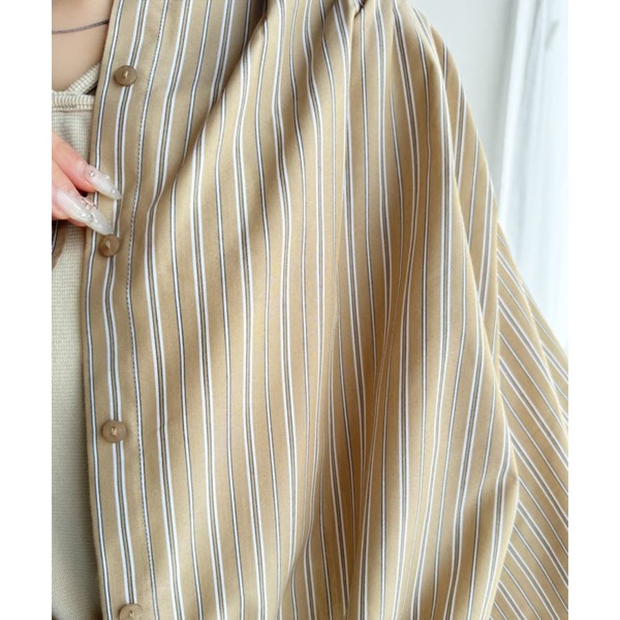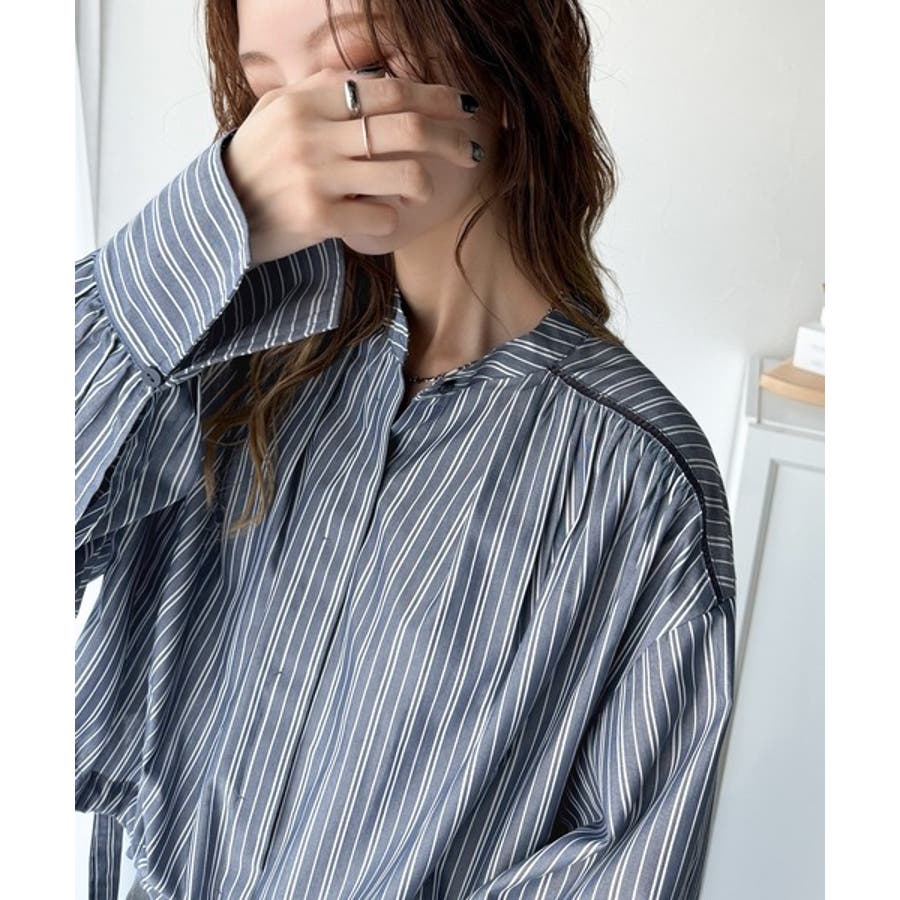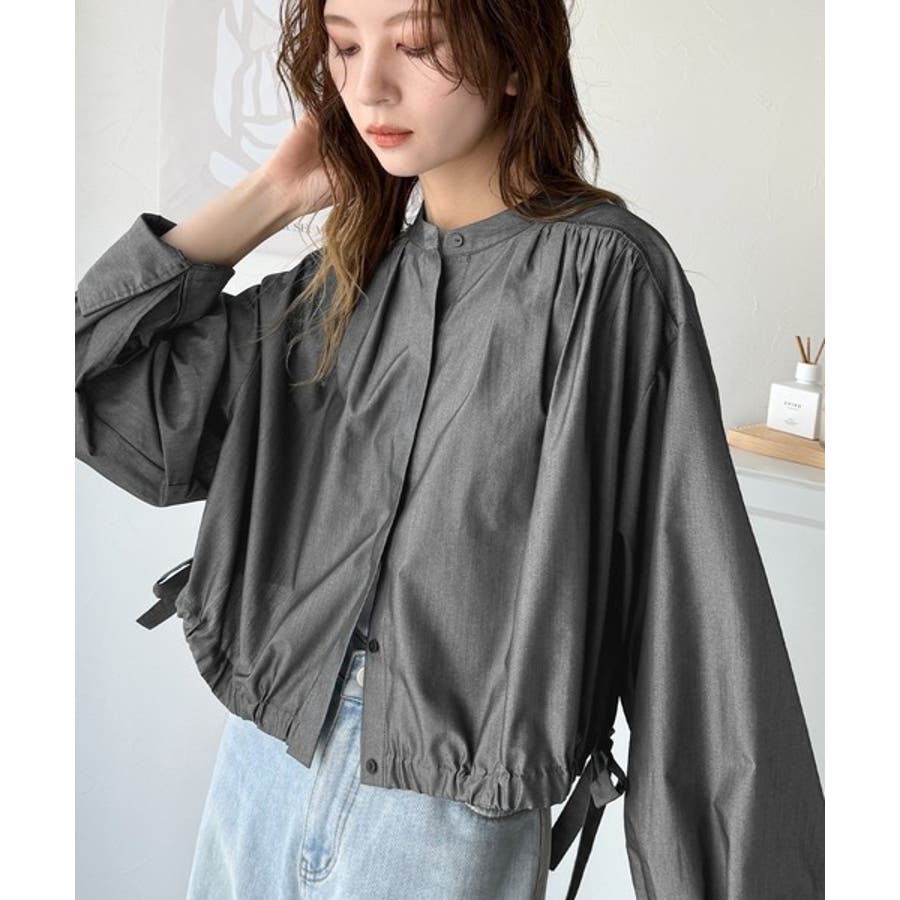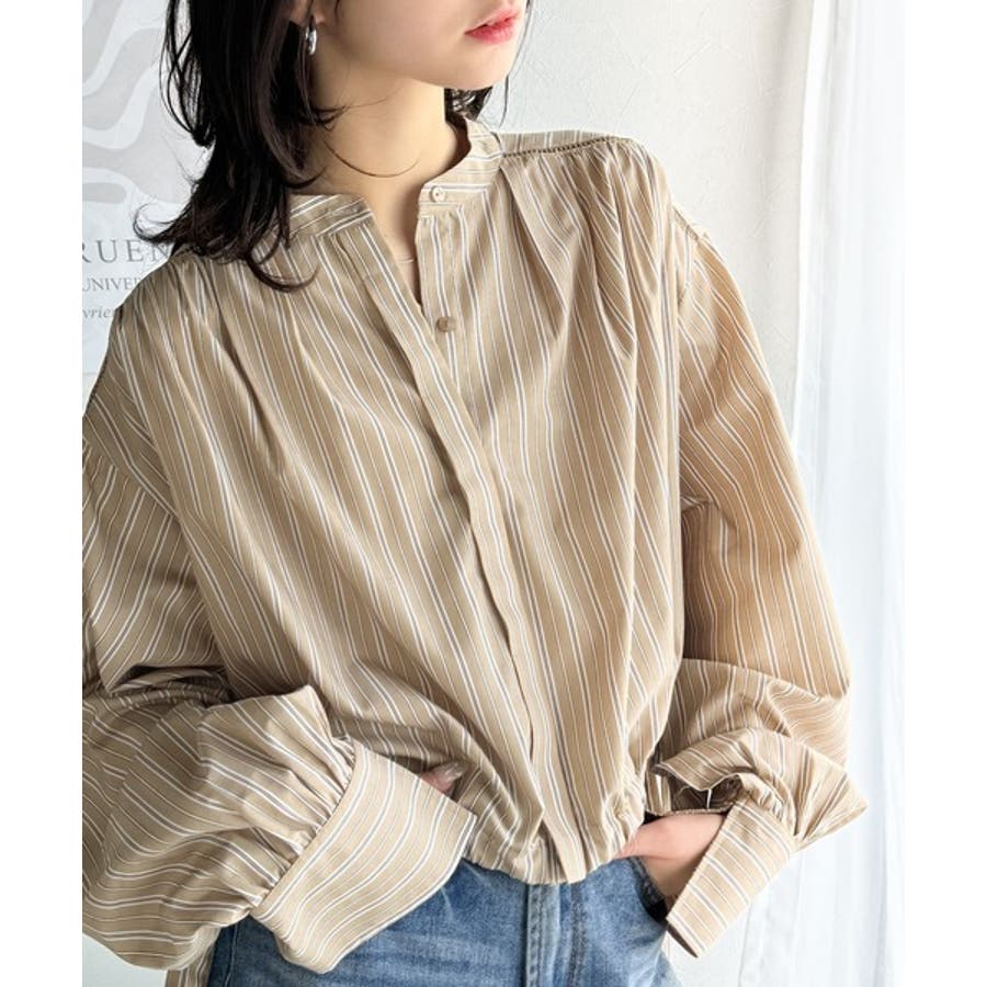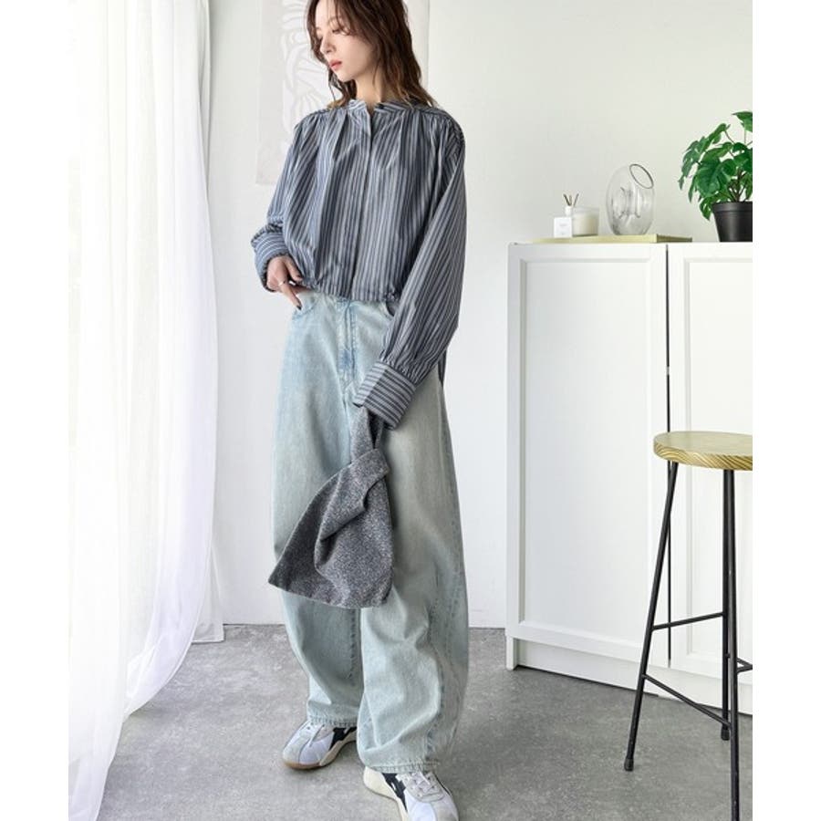 愛らしさと清楚感を両立する、リボンヘムクロップドギャザー長袖ストライプブラウス