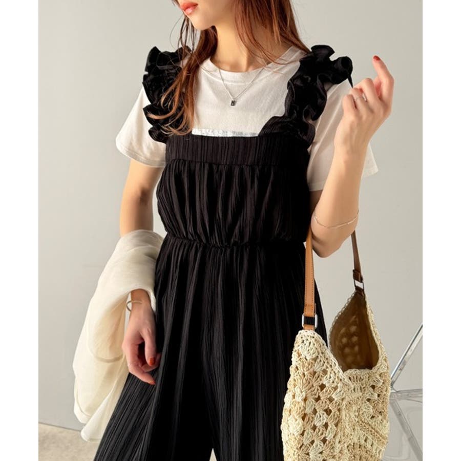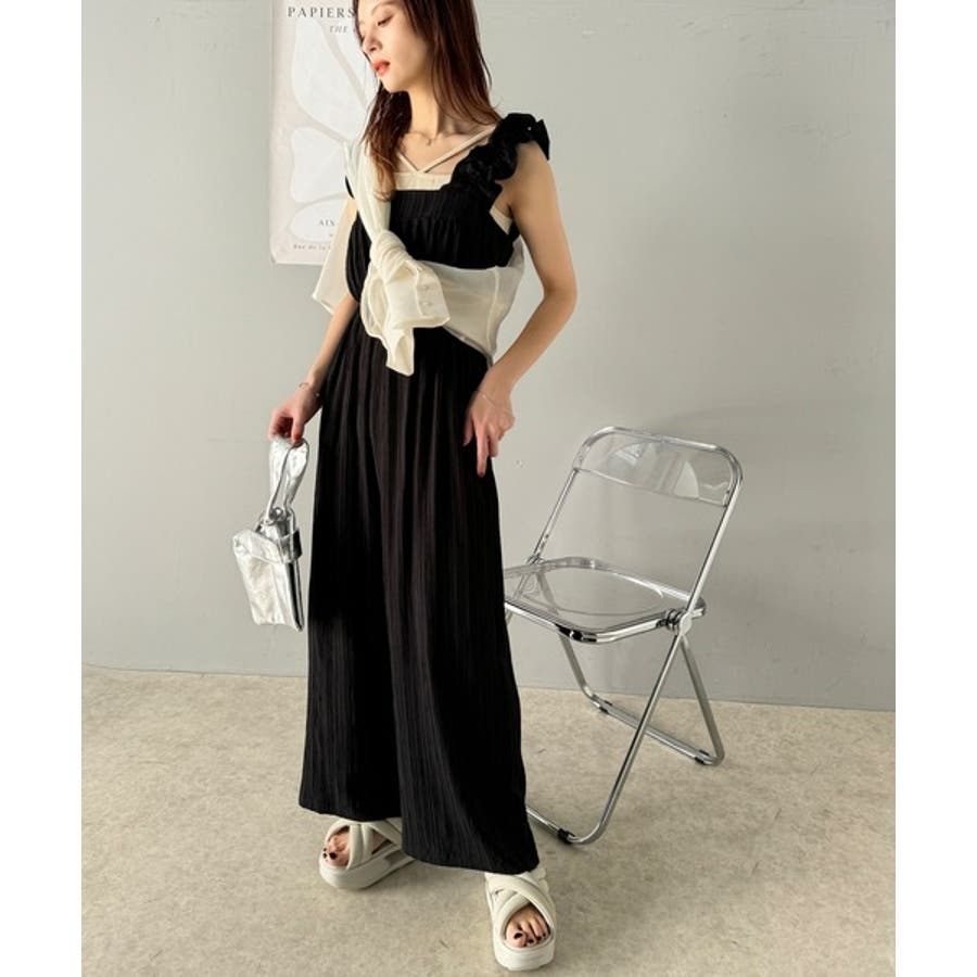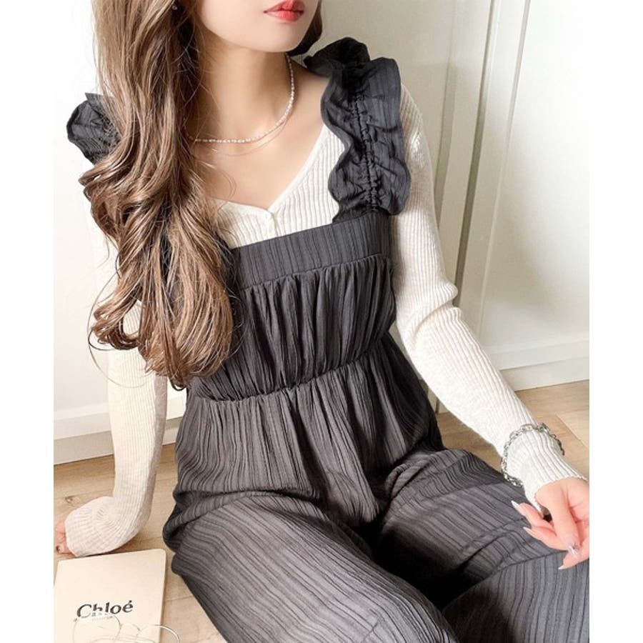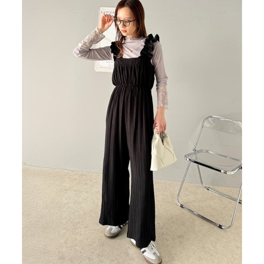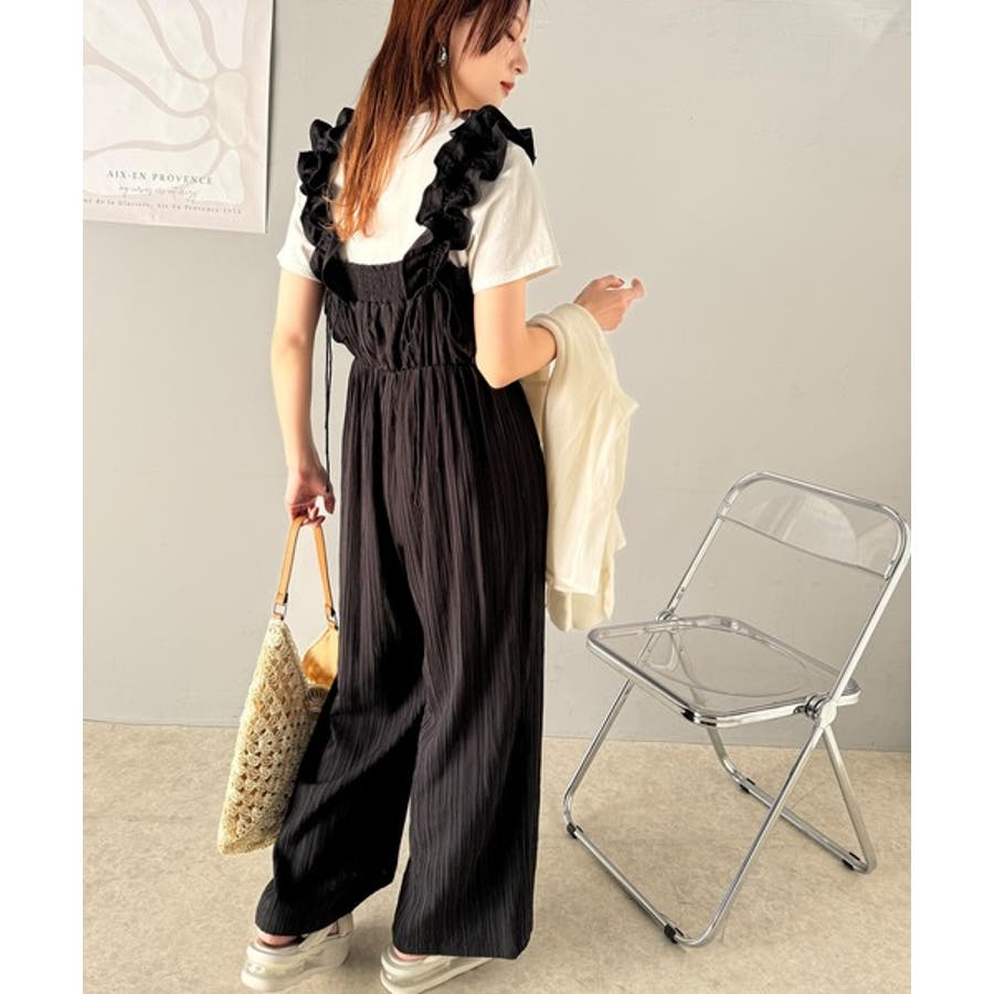 フリルギャザーが女性らしさを引き立てるオールインワン。