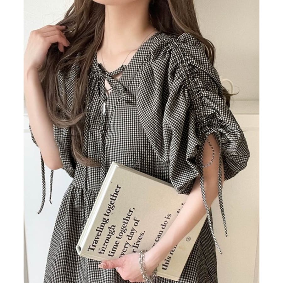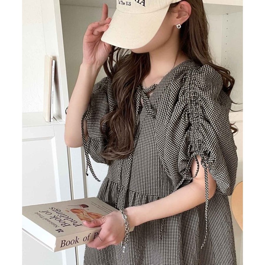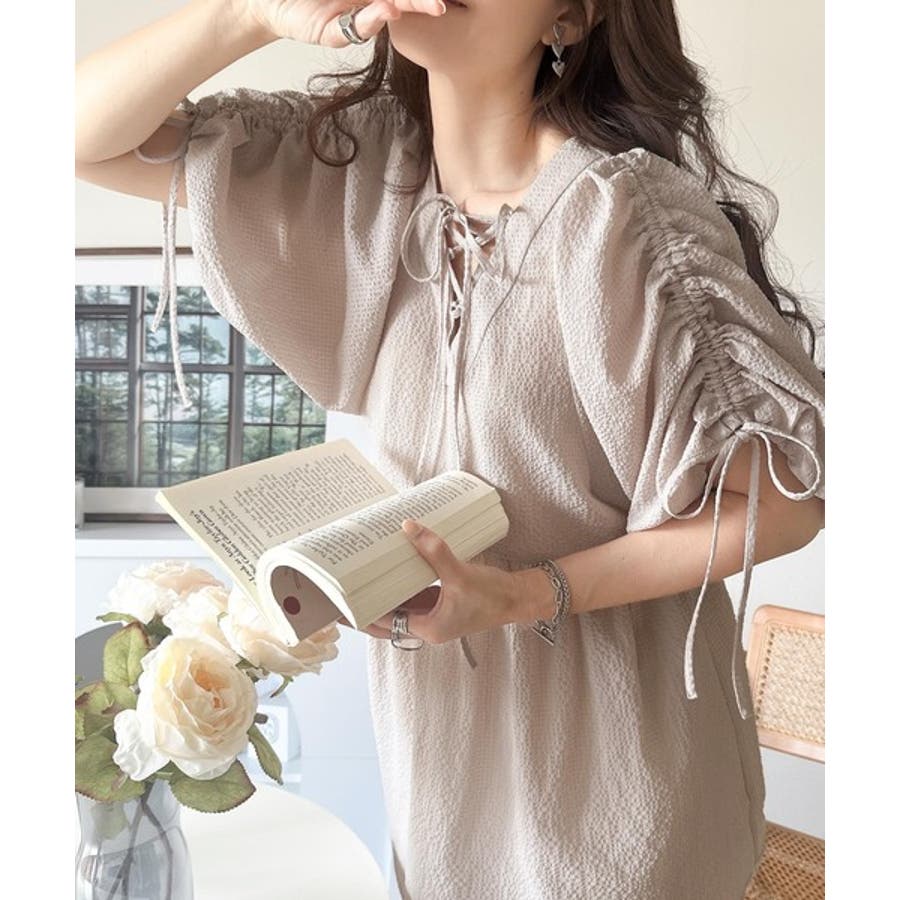 肩のリボンギャザーで袖丈をお好みに調節可能です♪