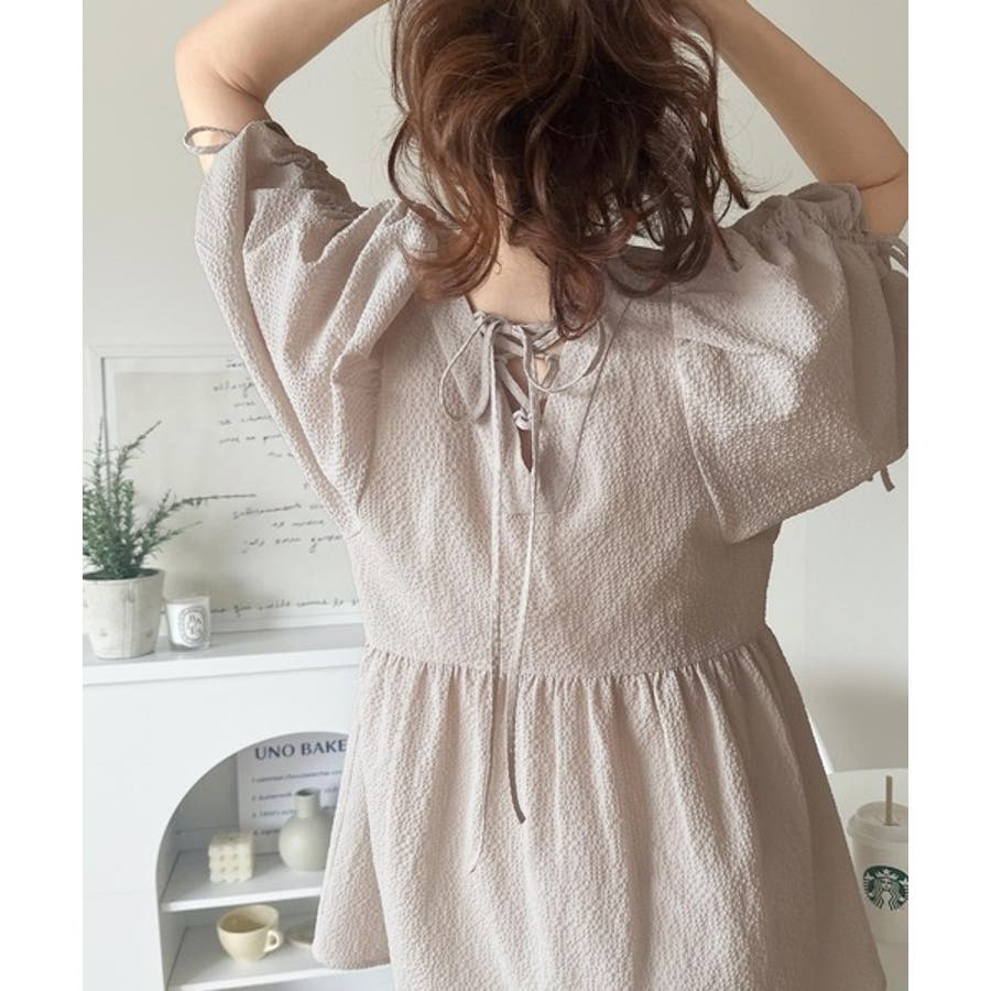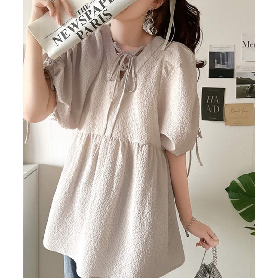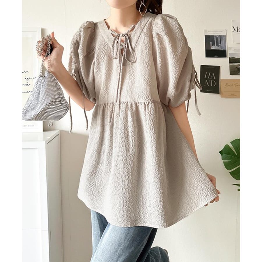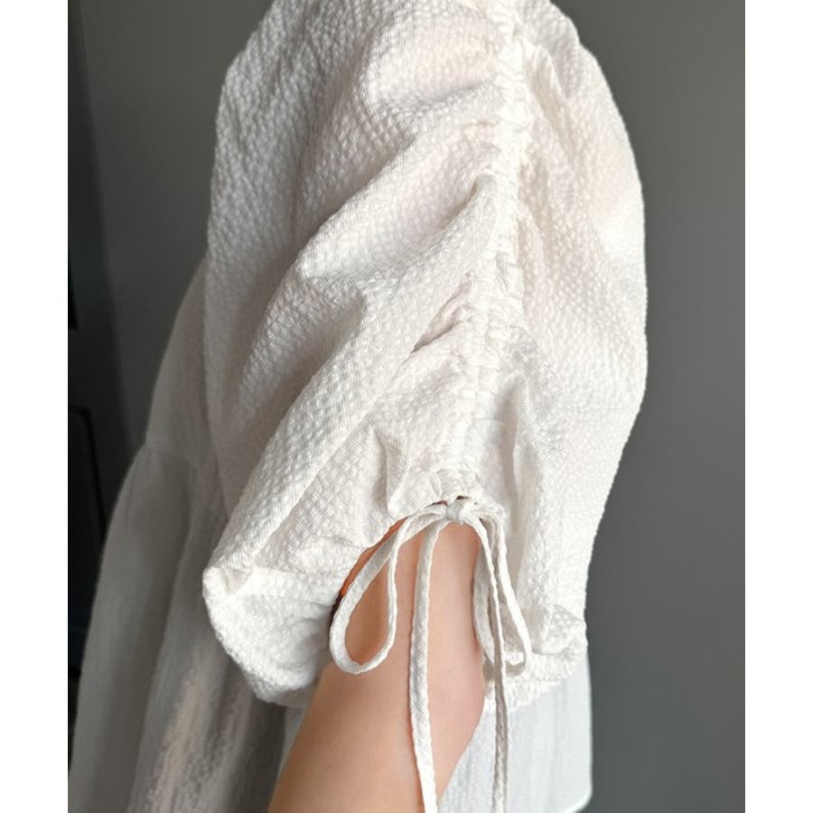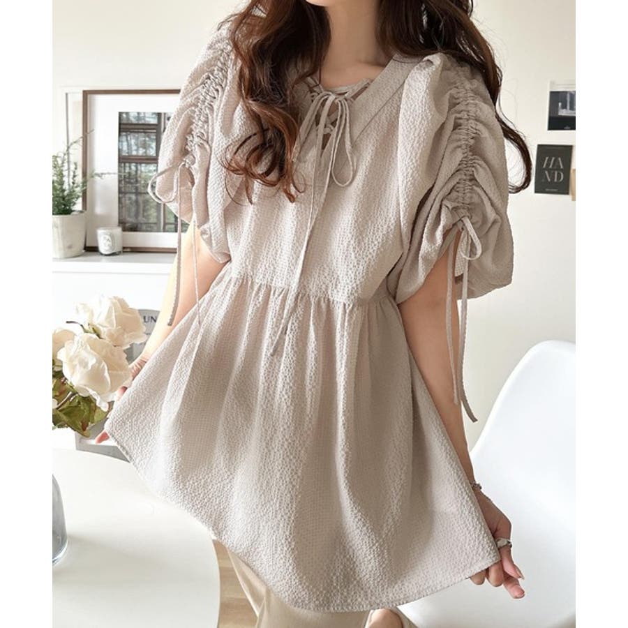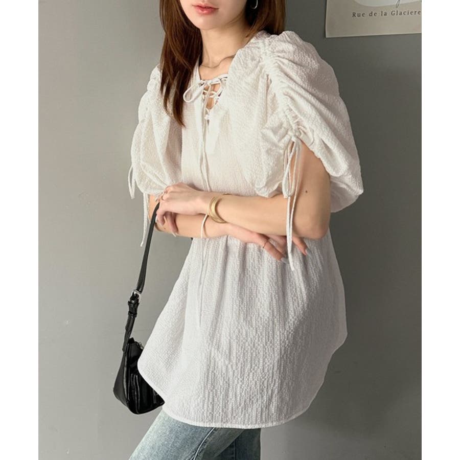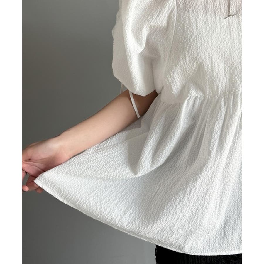 軽やかで上品。シアサッカー前後2WAYギャザーパフスリーブチュニックブラウス
