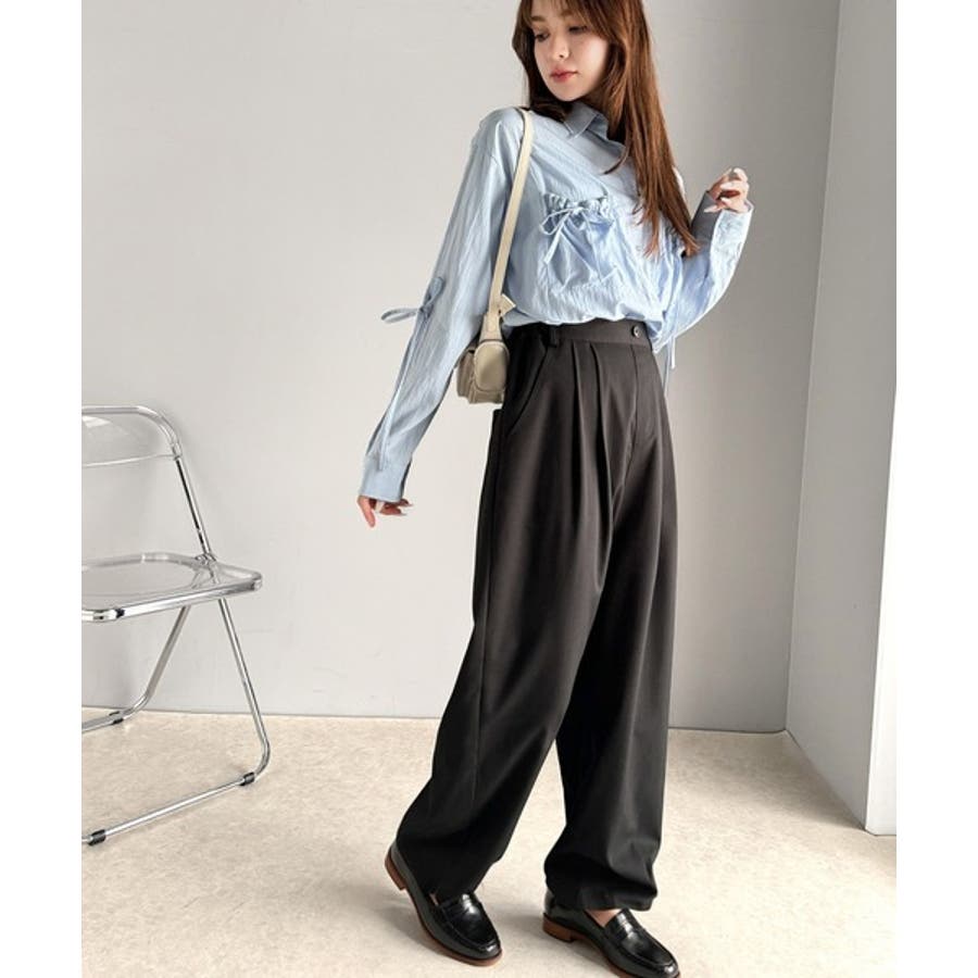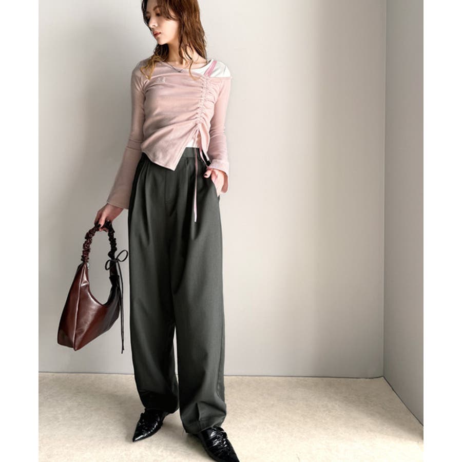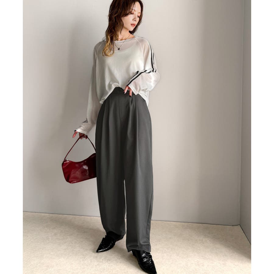 テーパードシルエットと裾に施されたタックが