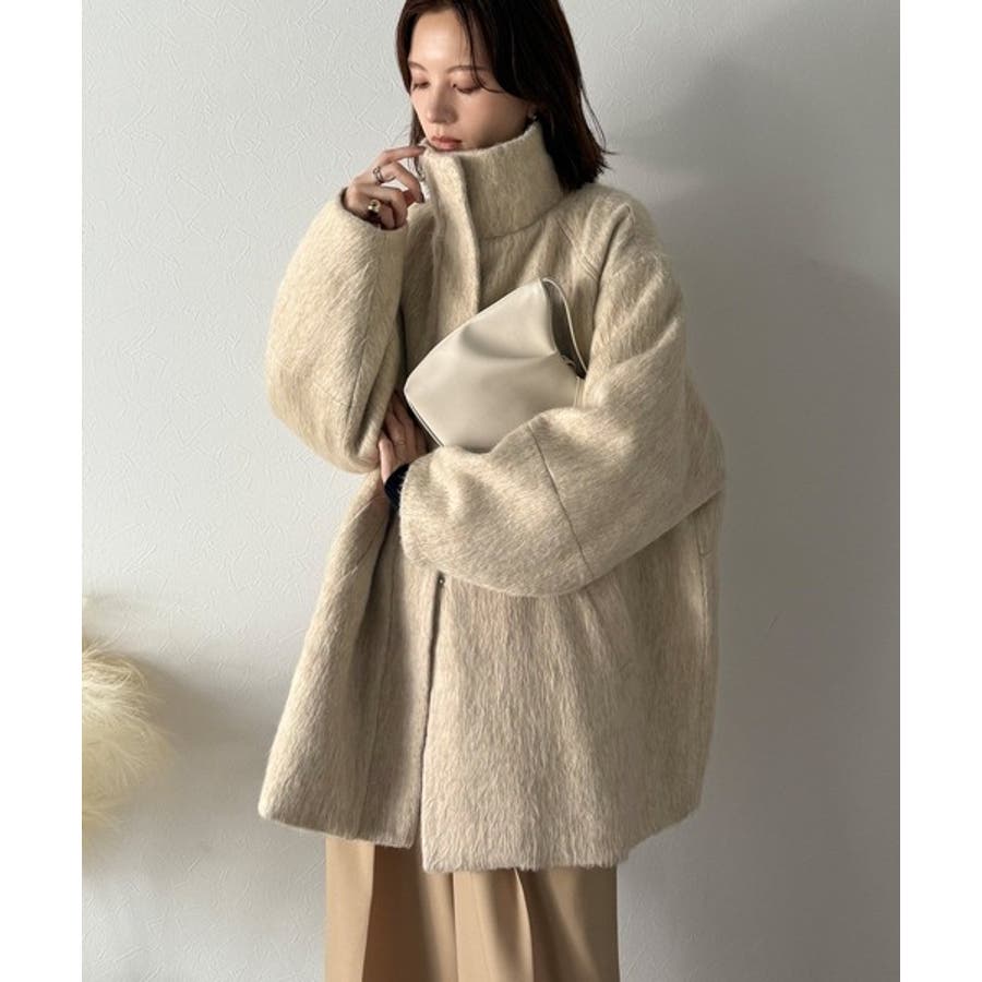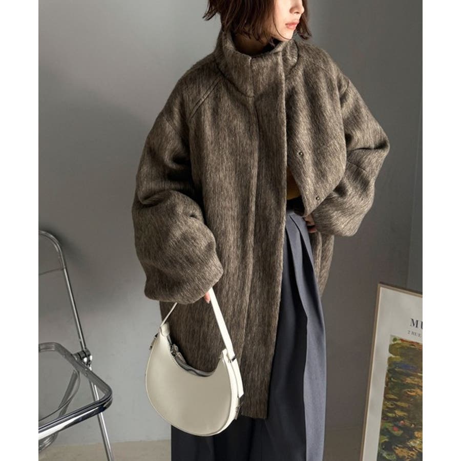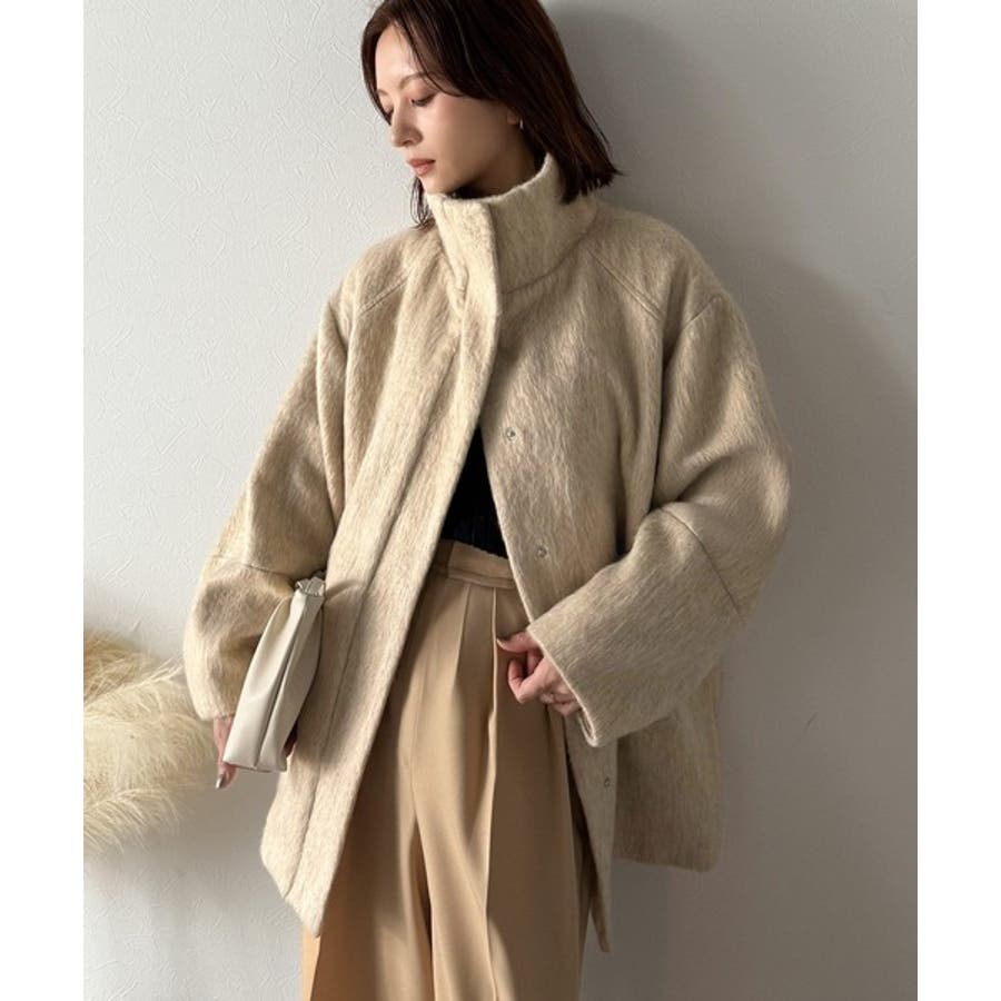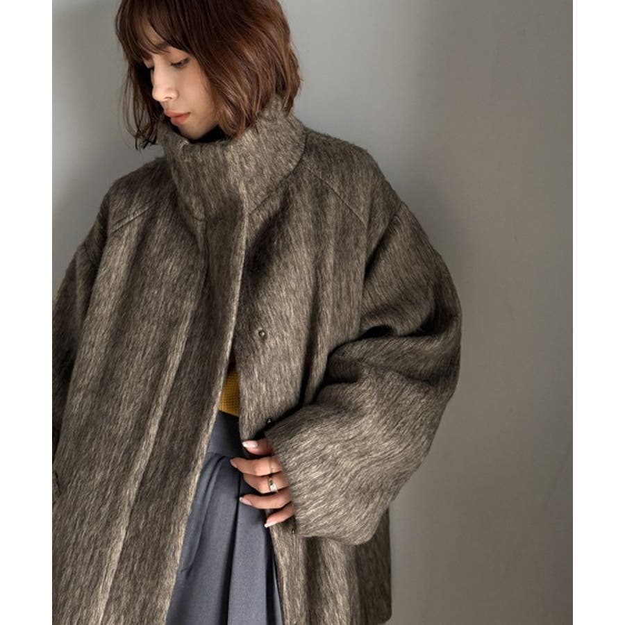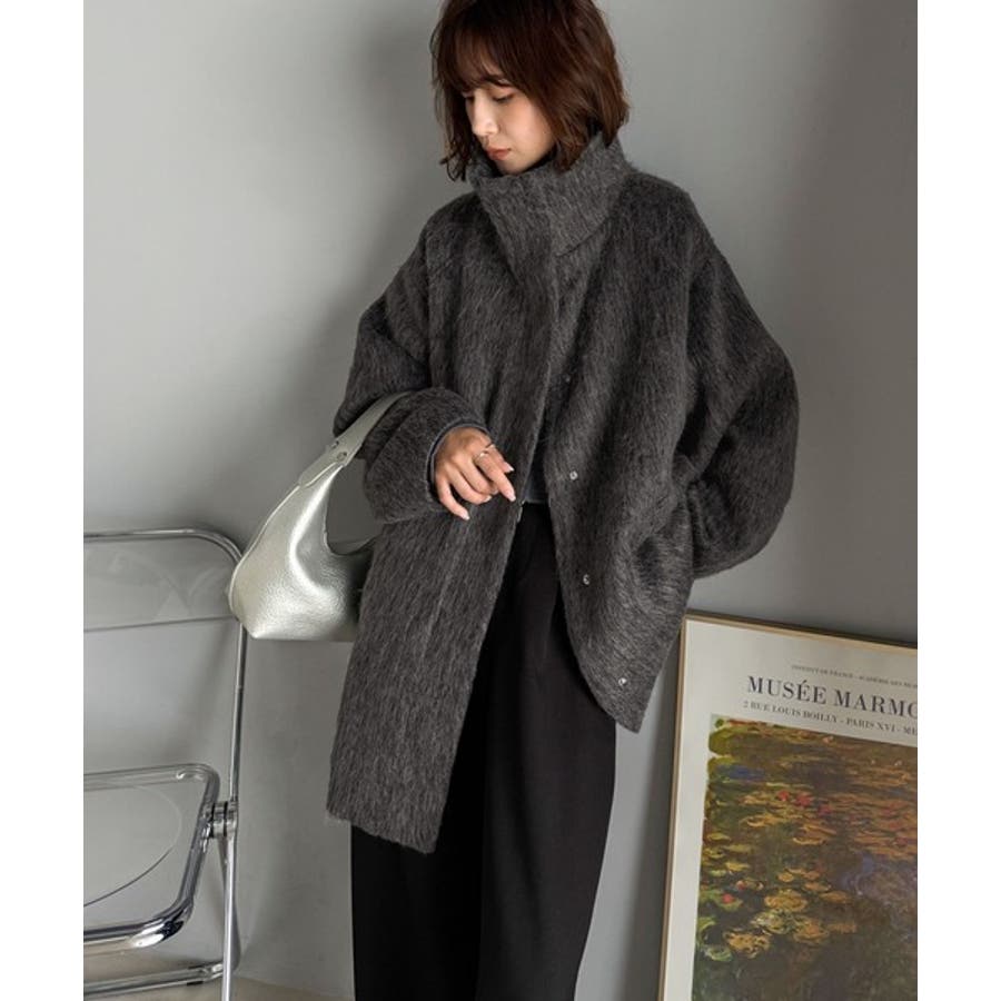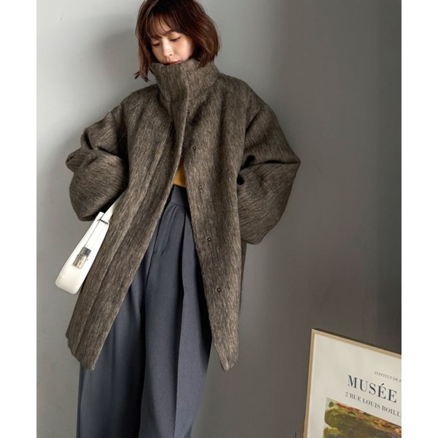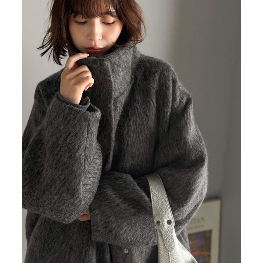 ベーシックとトレンドを両立。MIXシャギー比翼スタンドネックミドル丈コクーンスリ…