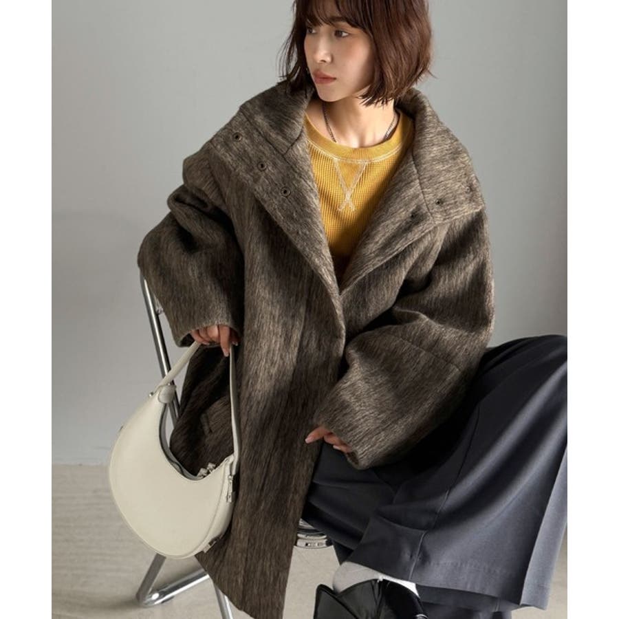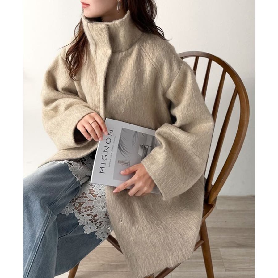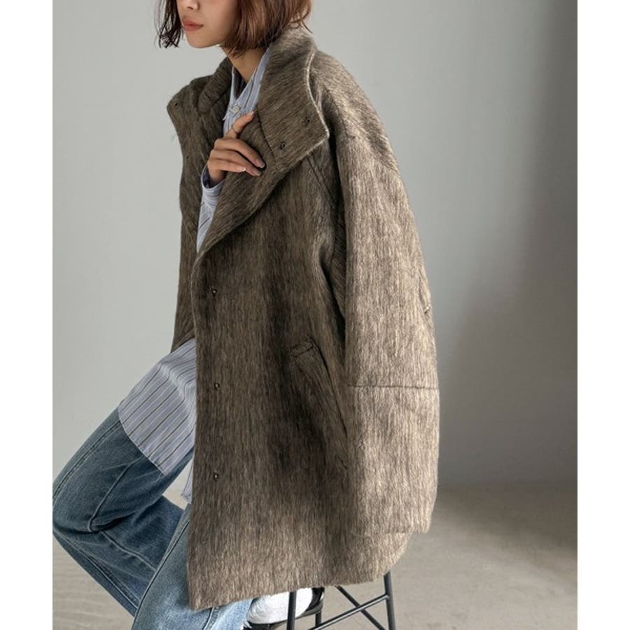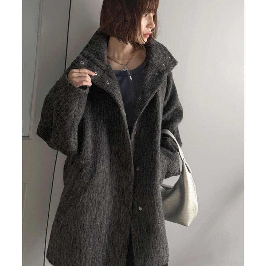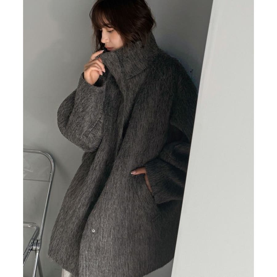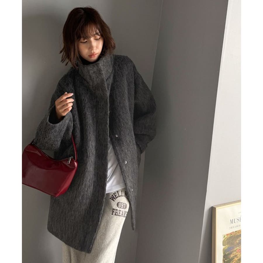 ベーシックとトレンドを両立。MIXシャギー比翼スタンドネックミドル丈コクーンスリ…