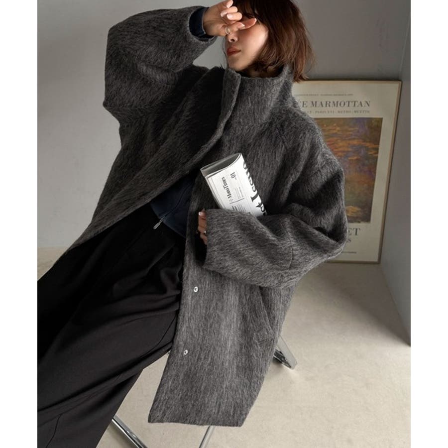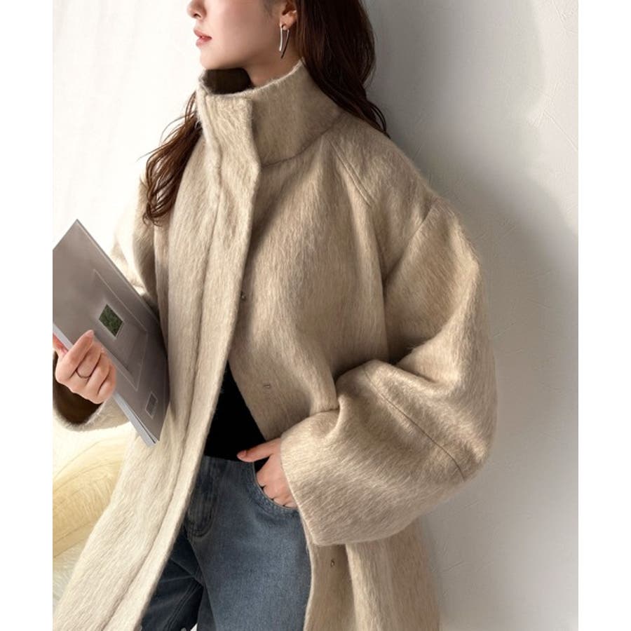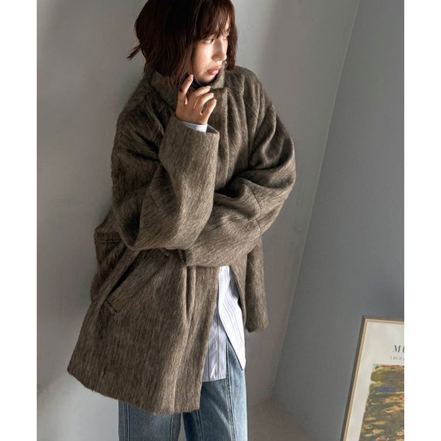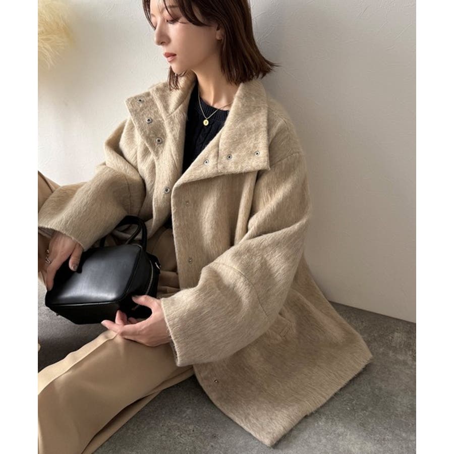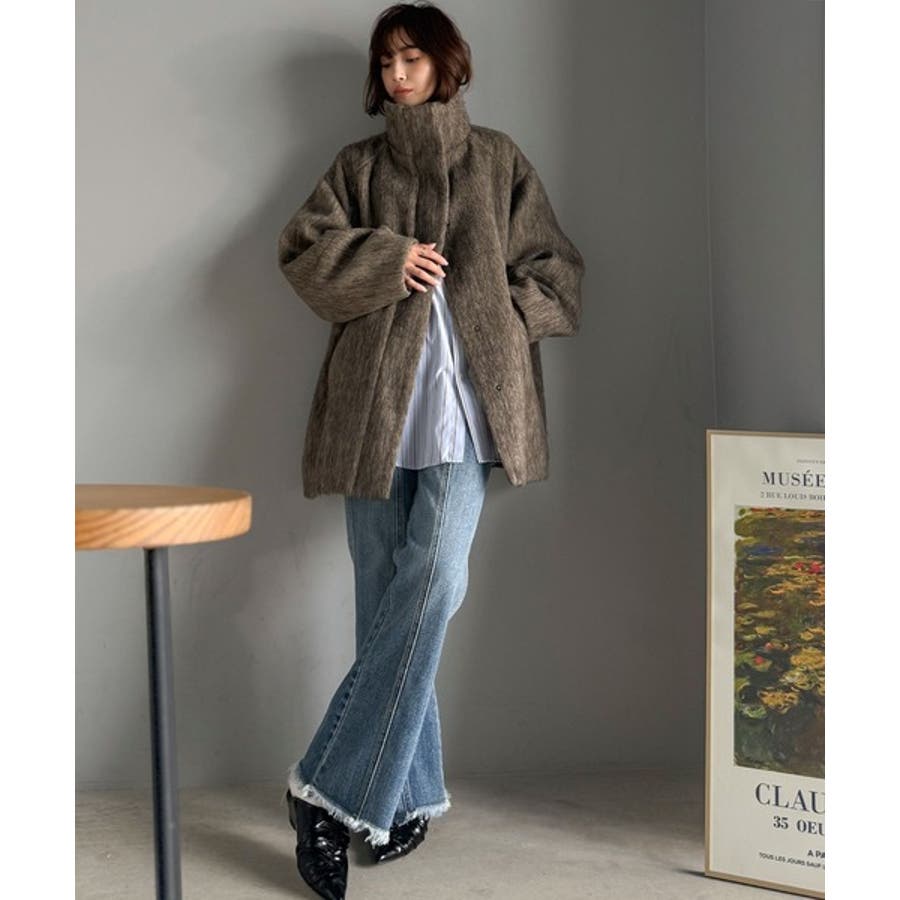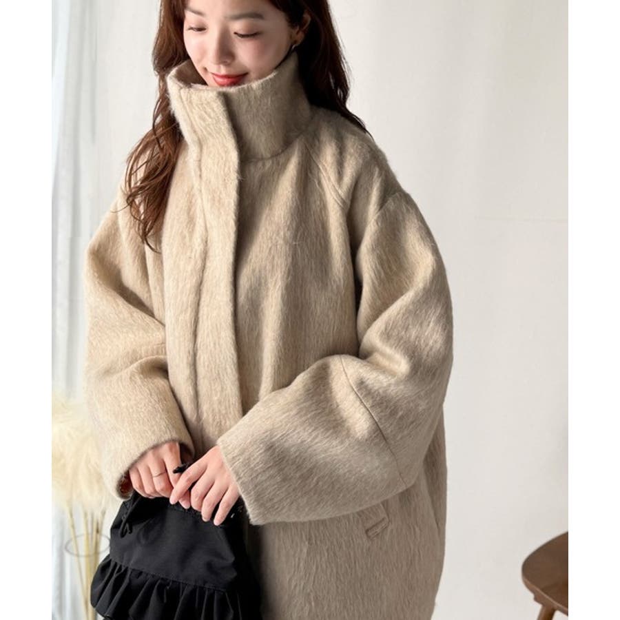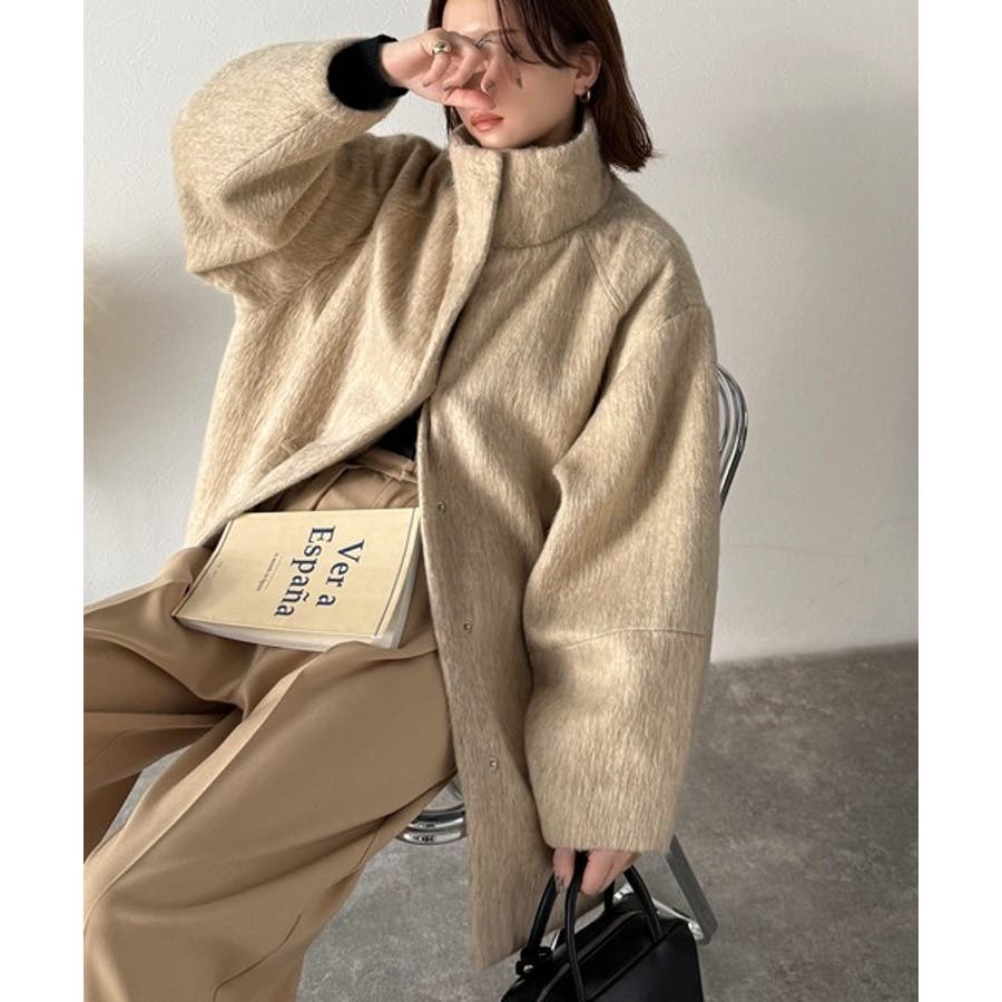 ベーシックとトレンドを両立。MIXシャギー比翼スタンドネックミドル丈コクーンスリ…