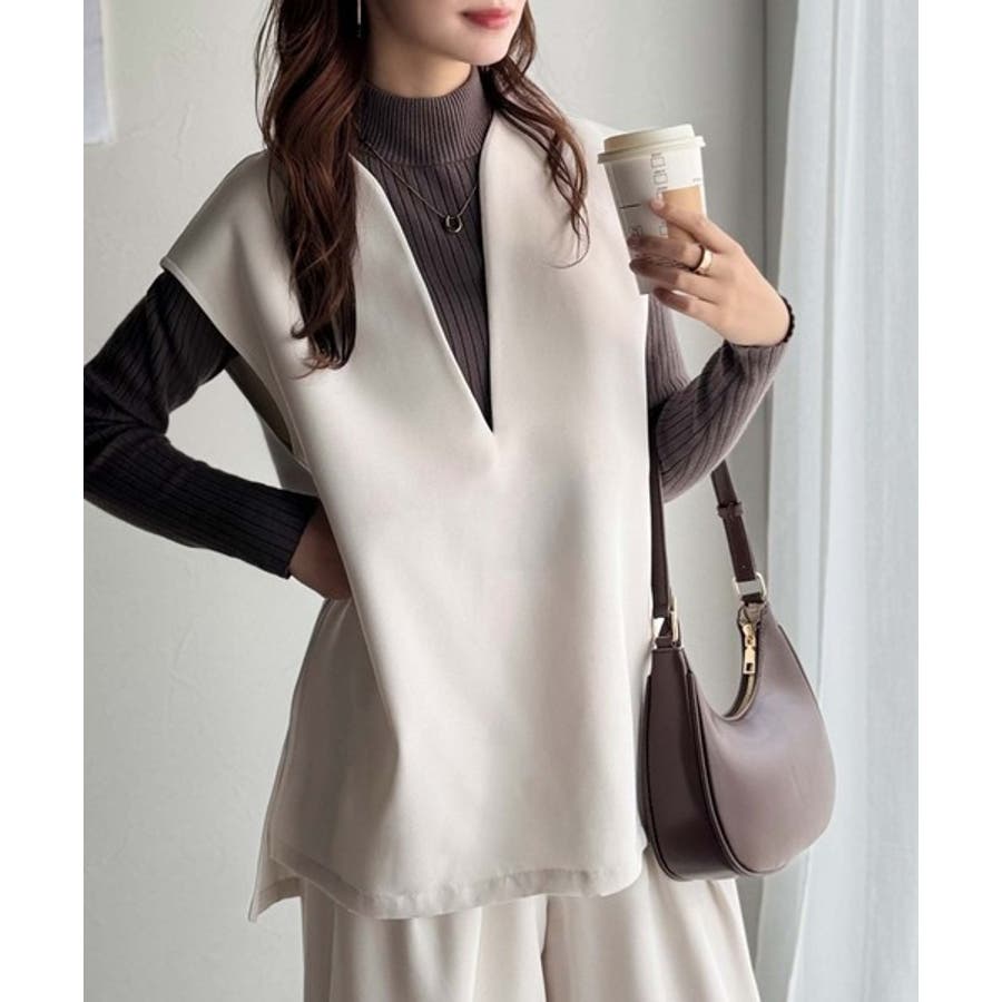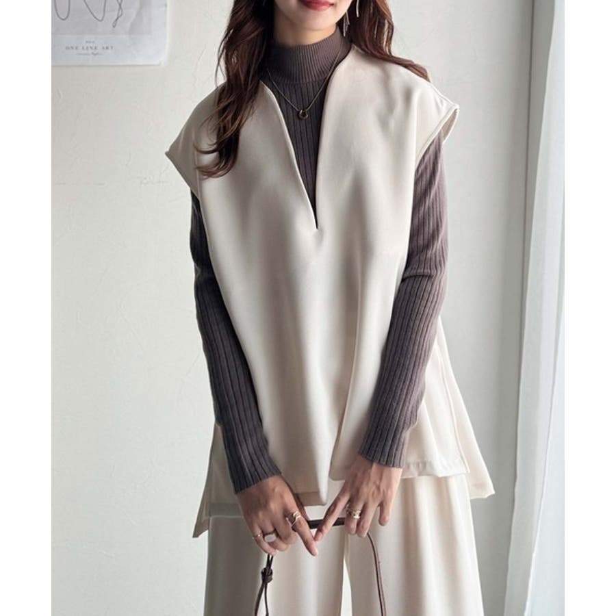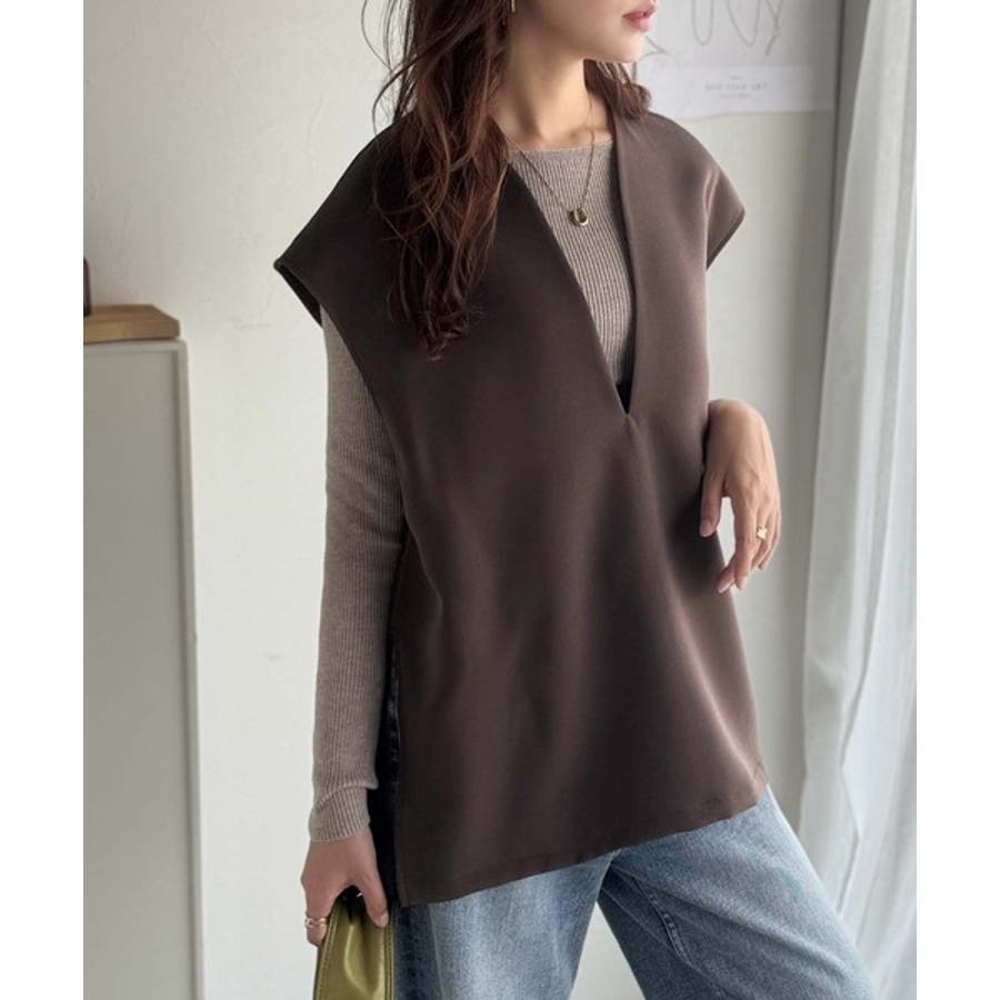 衿元が深めに開いたキーネックデザインが特徴のベスト。