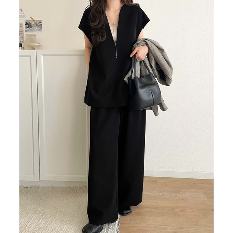 中にブラウスをレイヤードしてセットアップパンツと合わせれば、