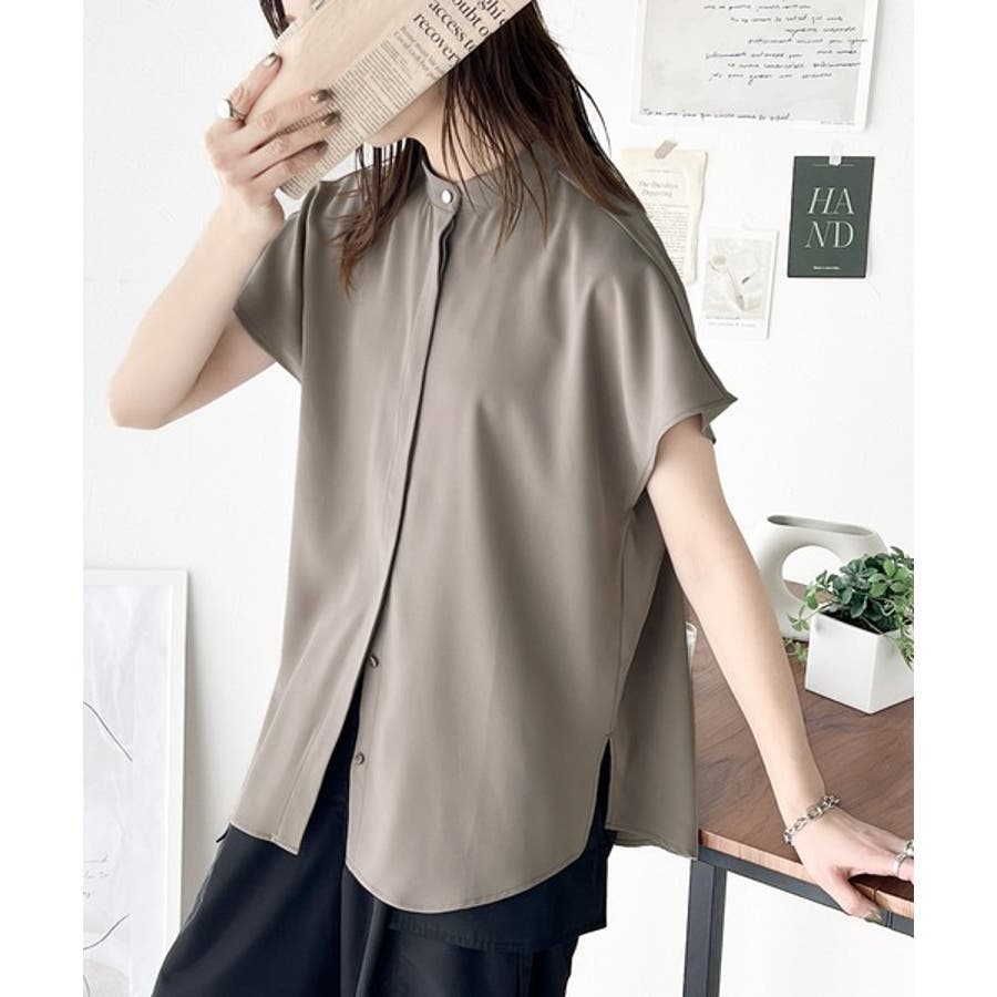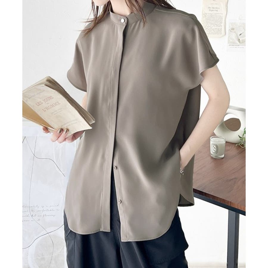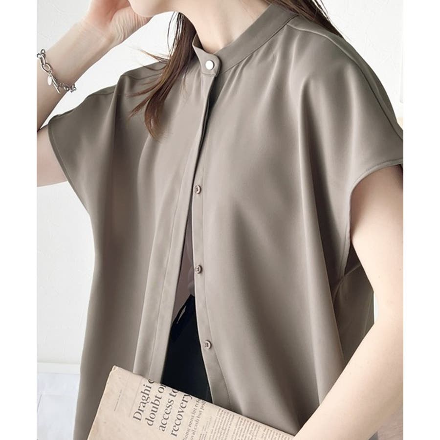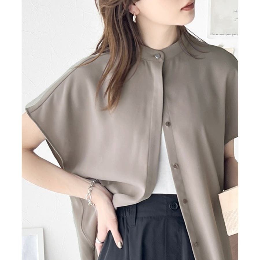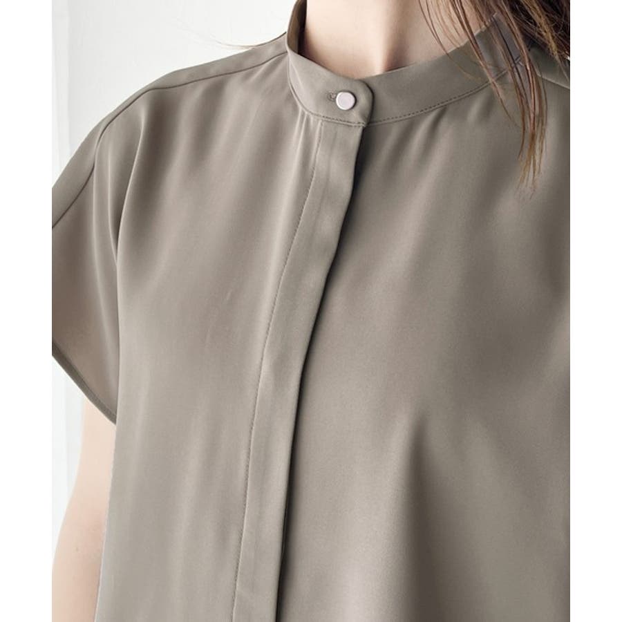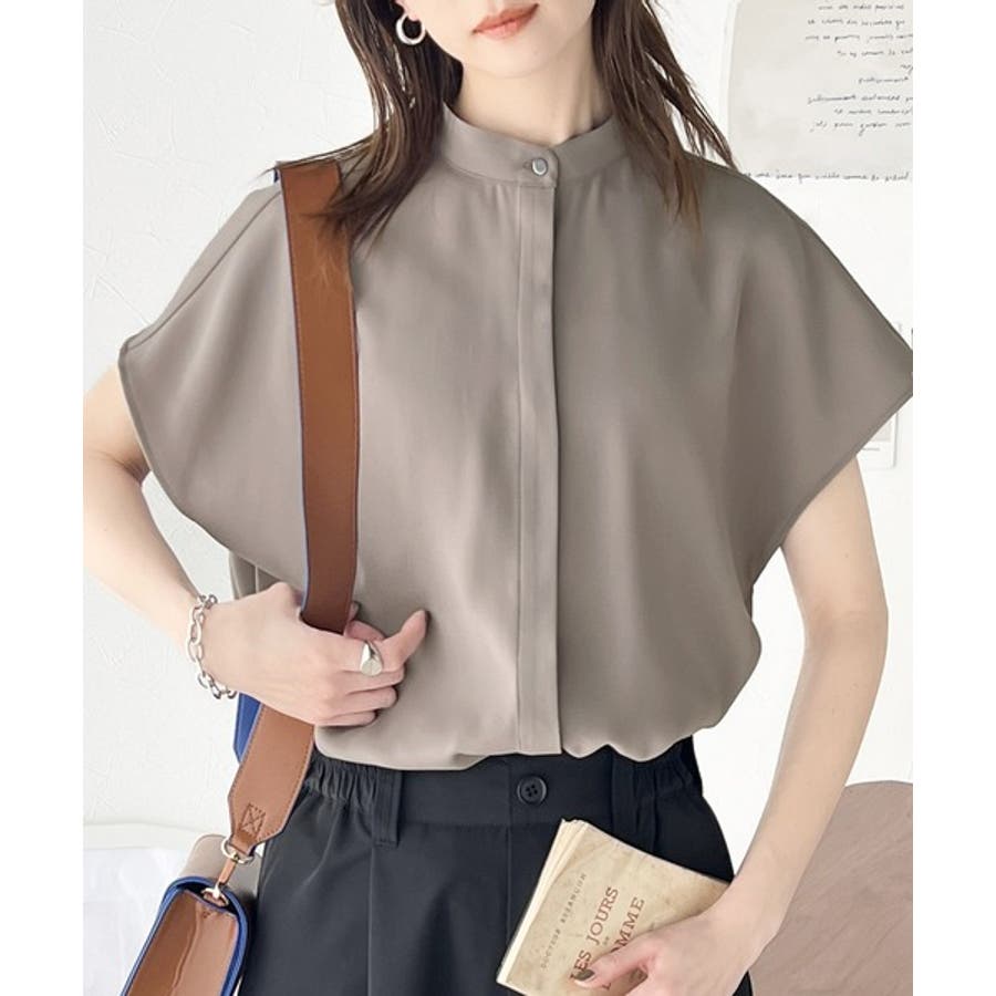 着まわし万能な大人トップス。比翼バンドカラーフレンチスリーブシャツ