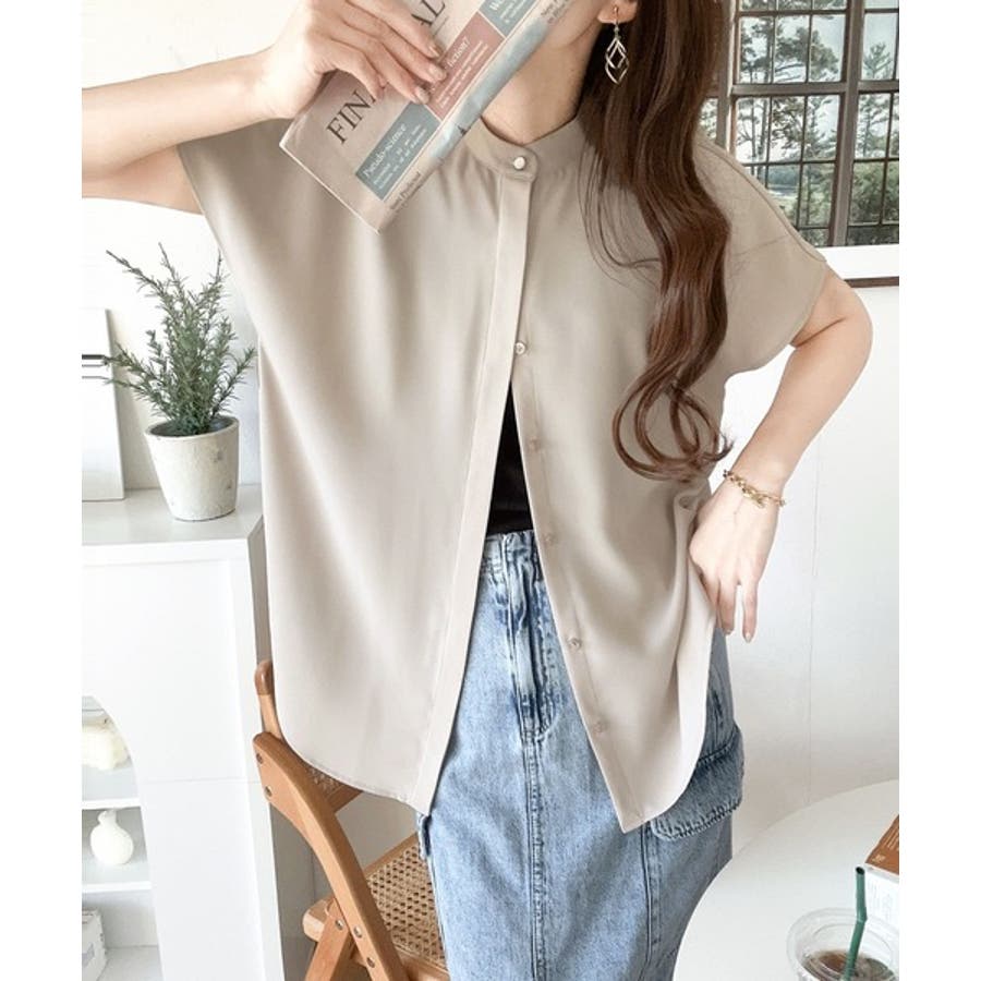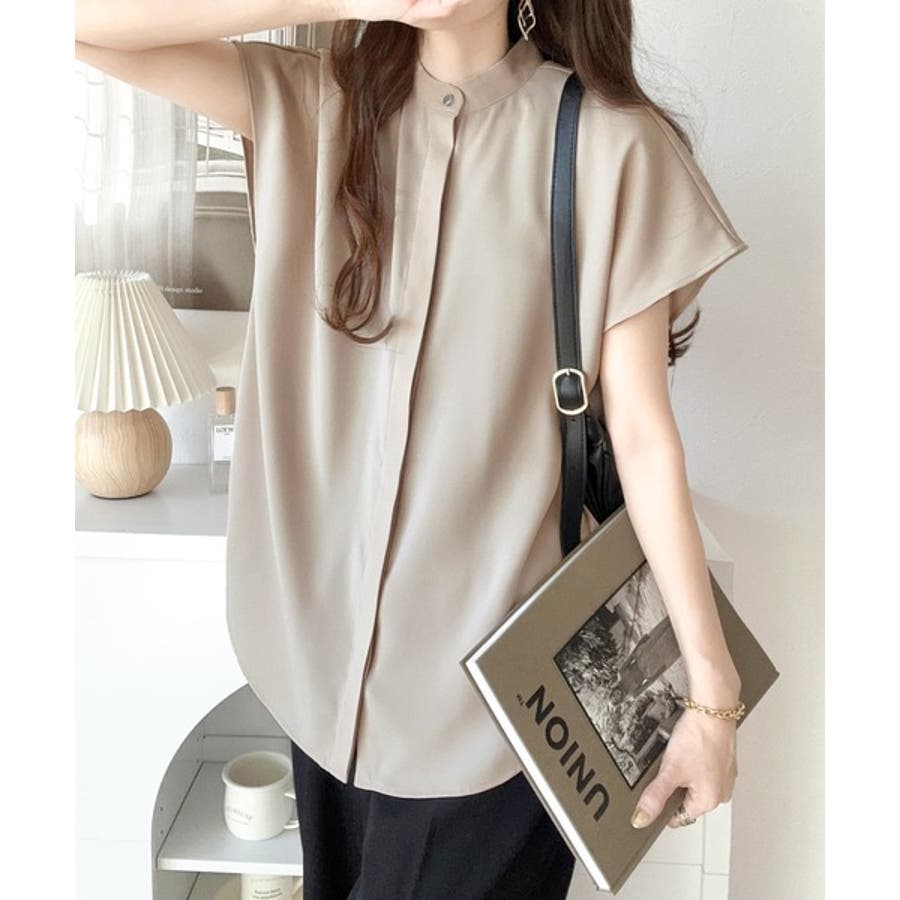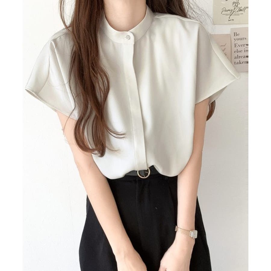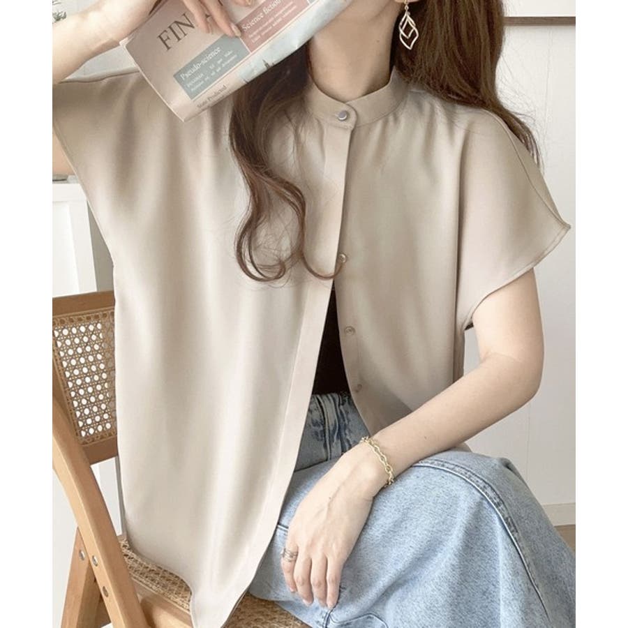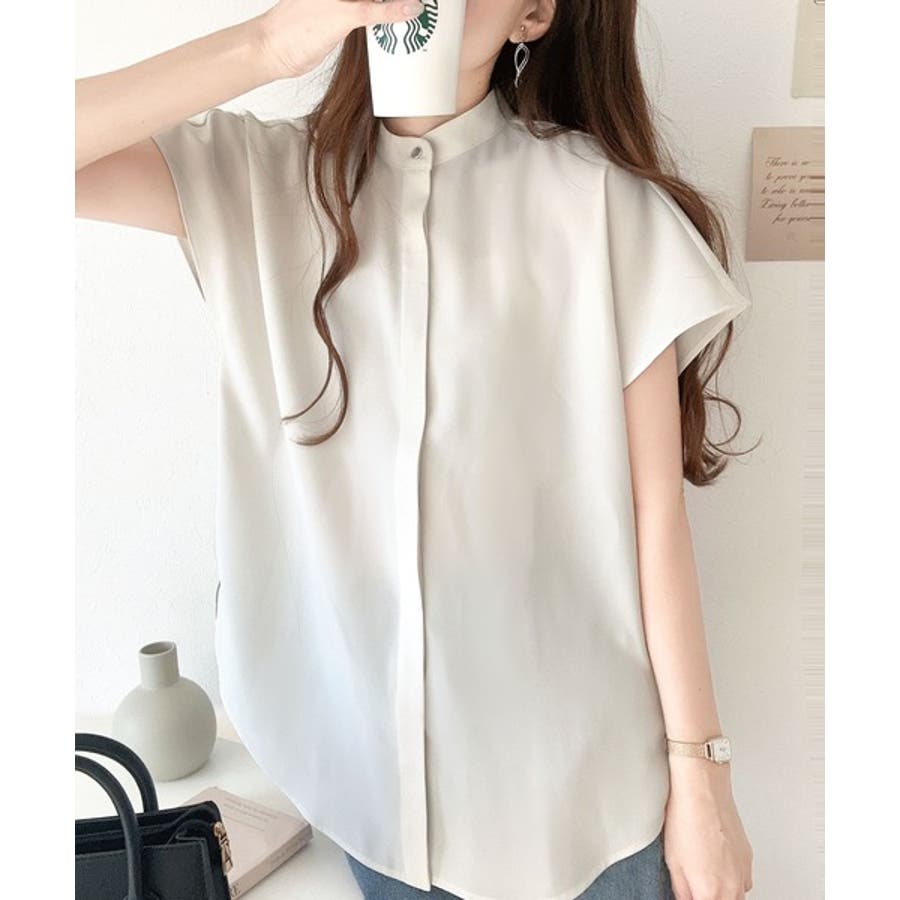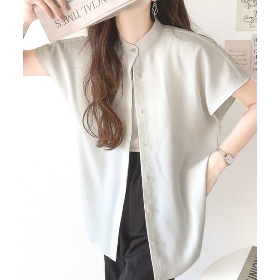 着まわし万能な大人トップス。比翼バンドカラーフレンチスリーブシャツ
