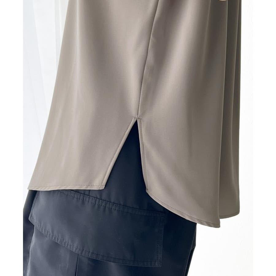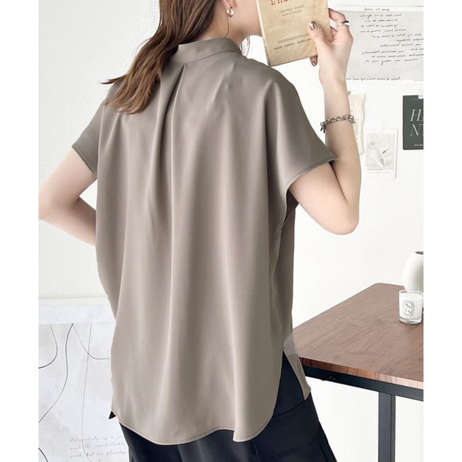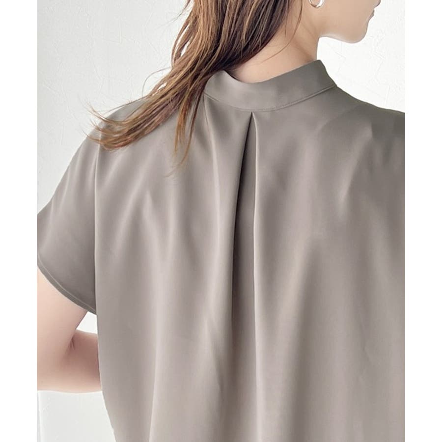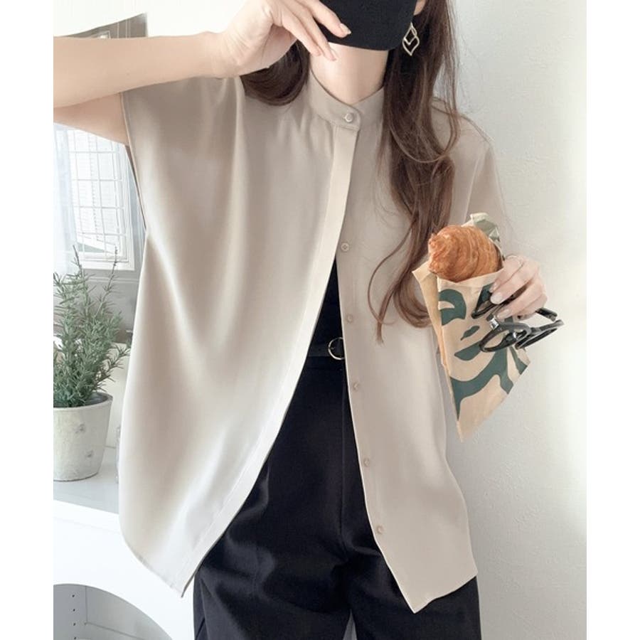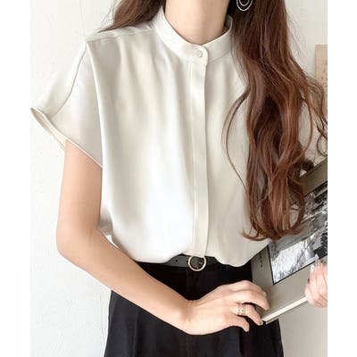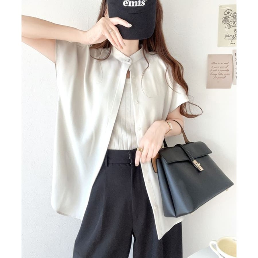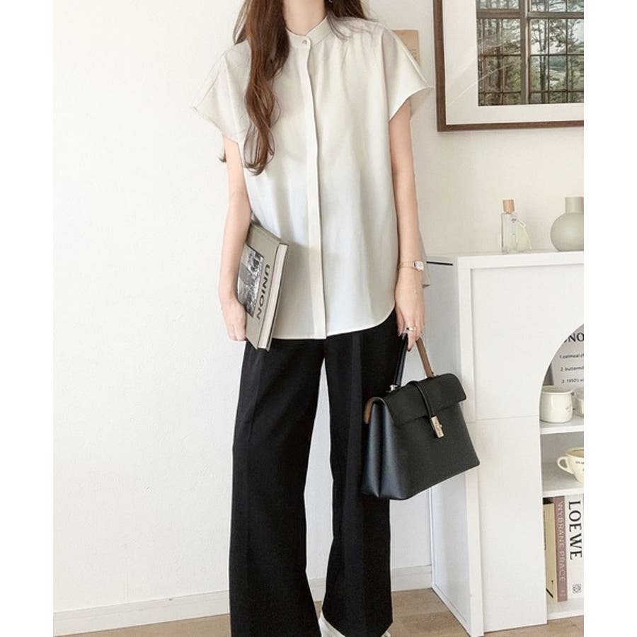 着まわし万能な大人トップス。比翼バンドカラーフレンチスリーブシャツ
