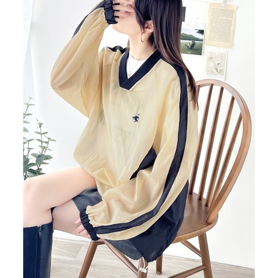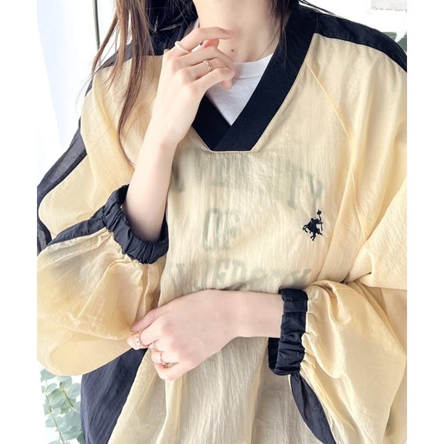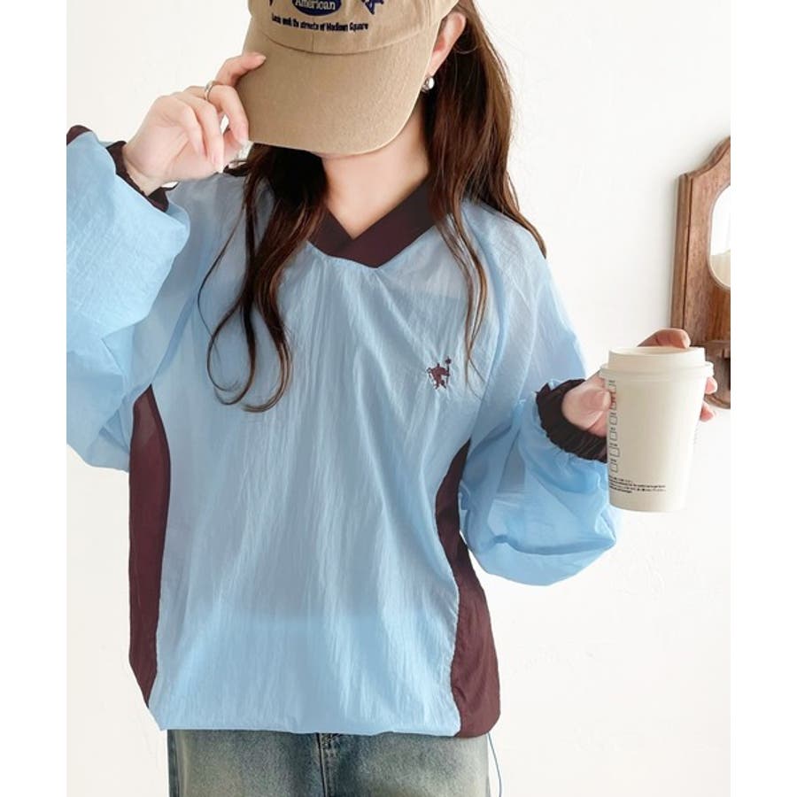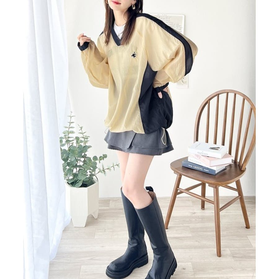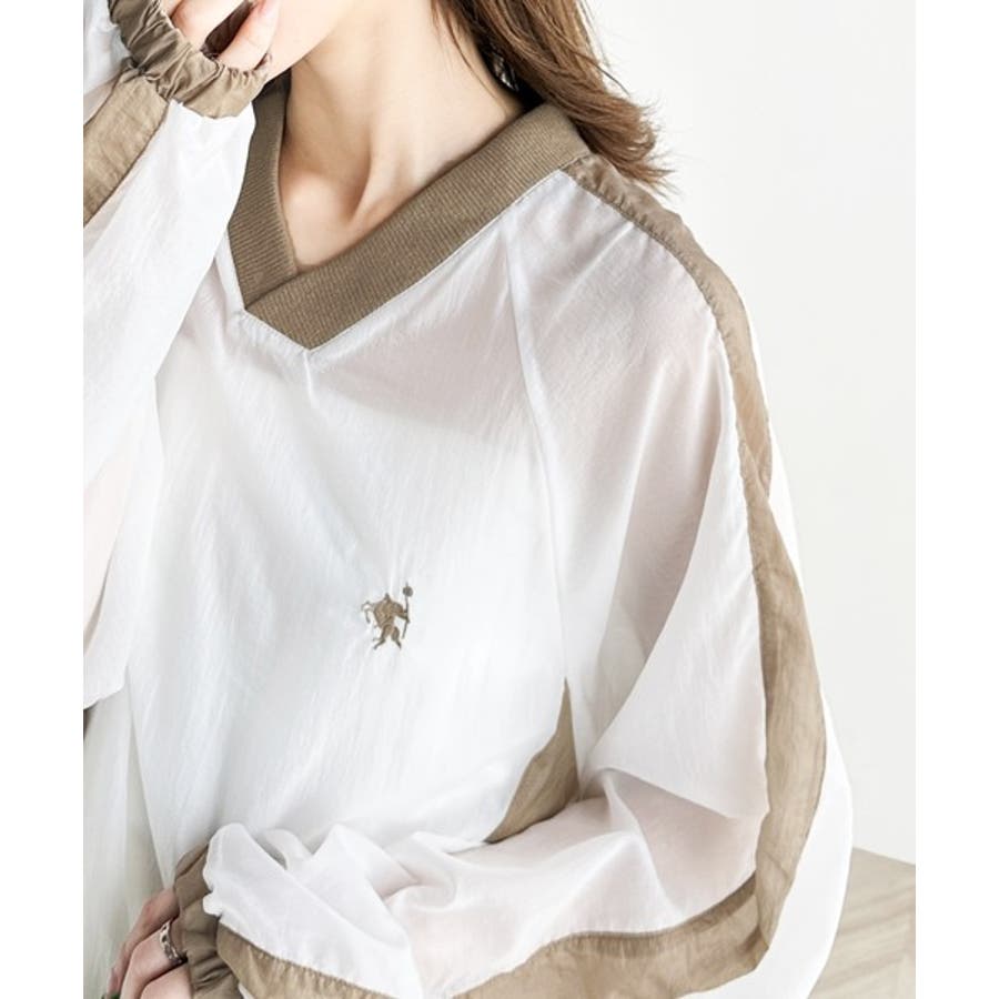 レトロ配色が今っぽ!胸刺繍配色シアー裾ドロストVネックプルオーバー