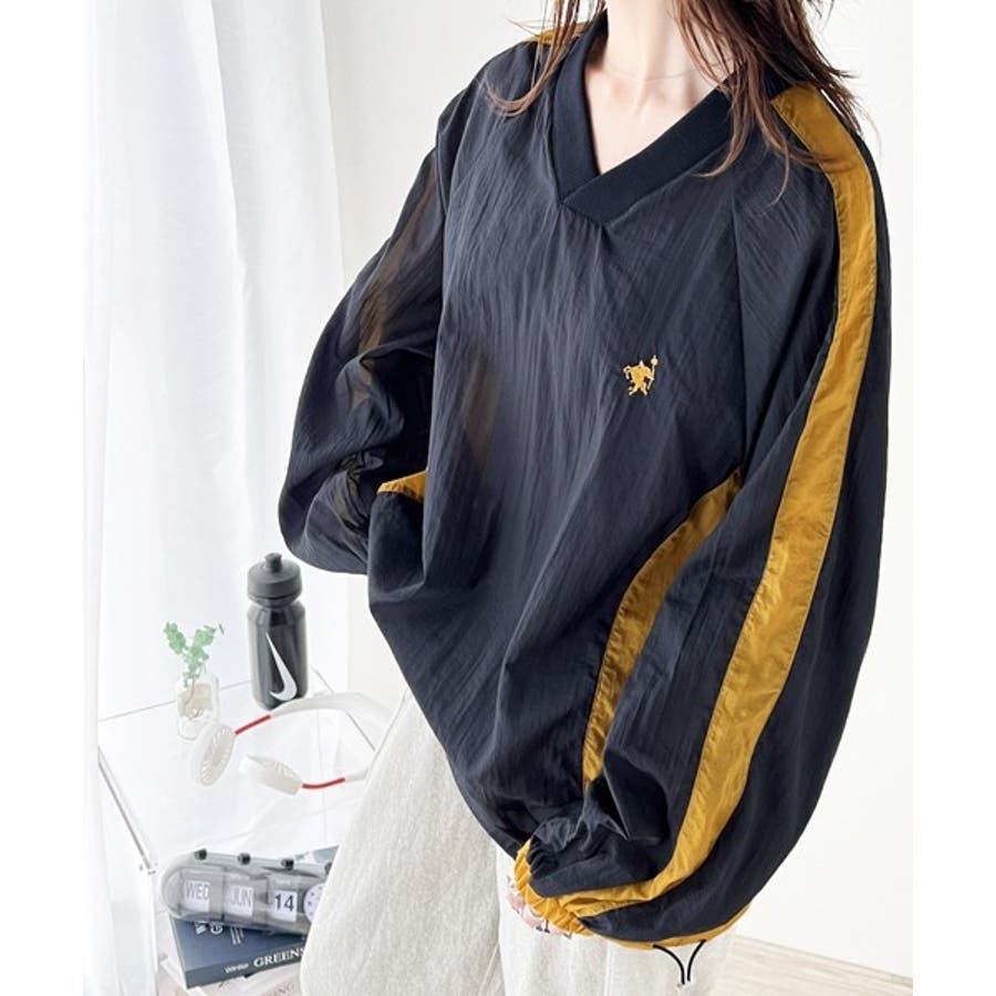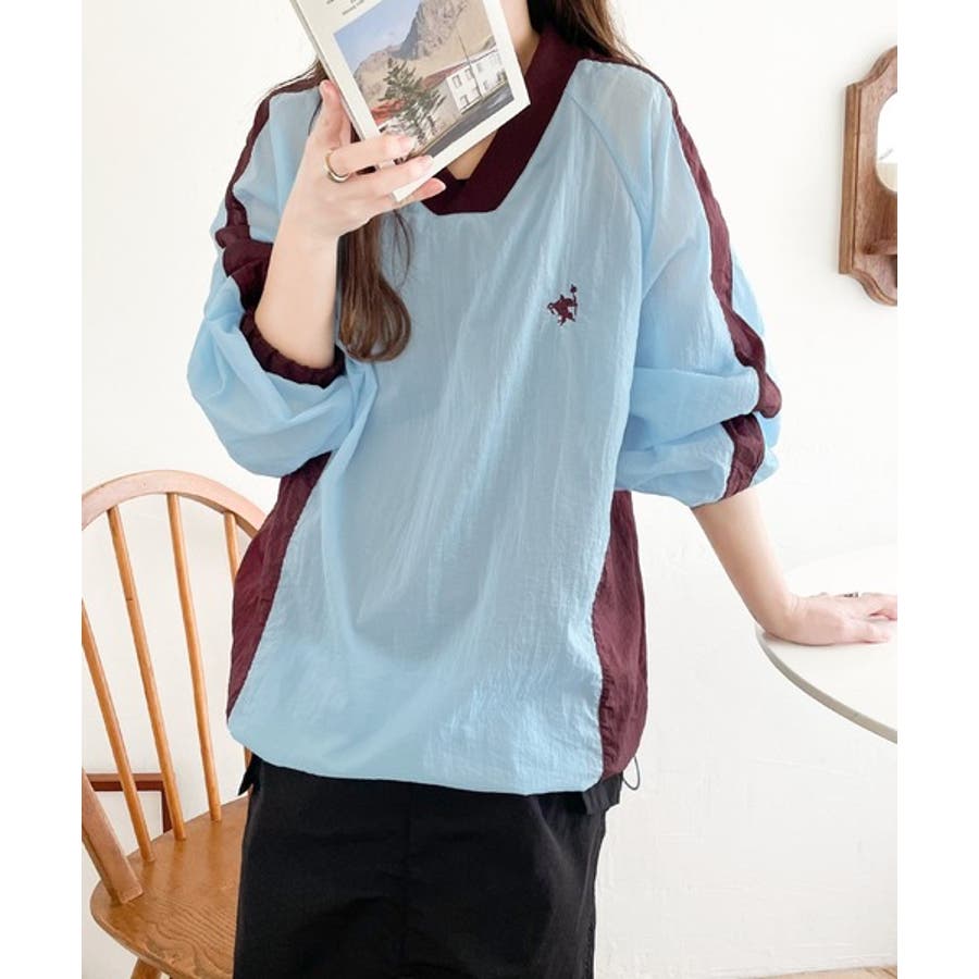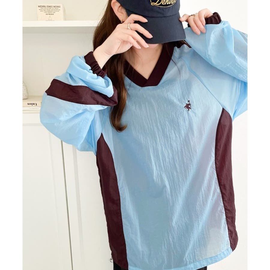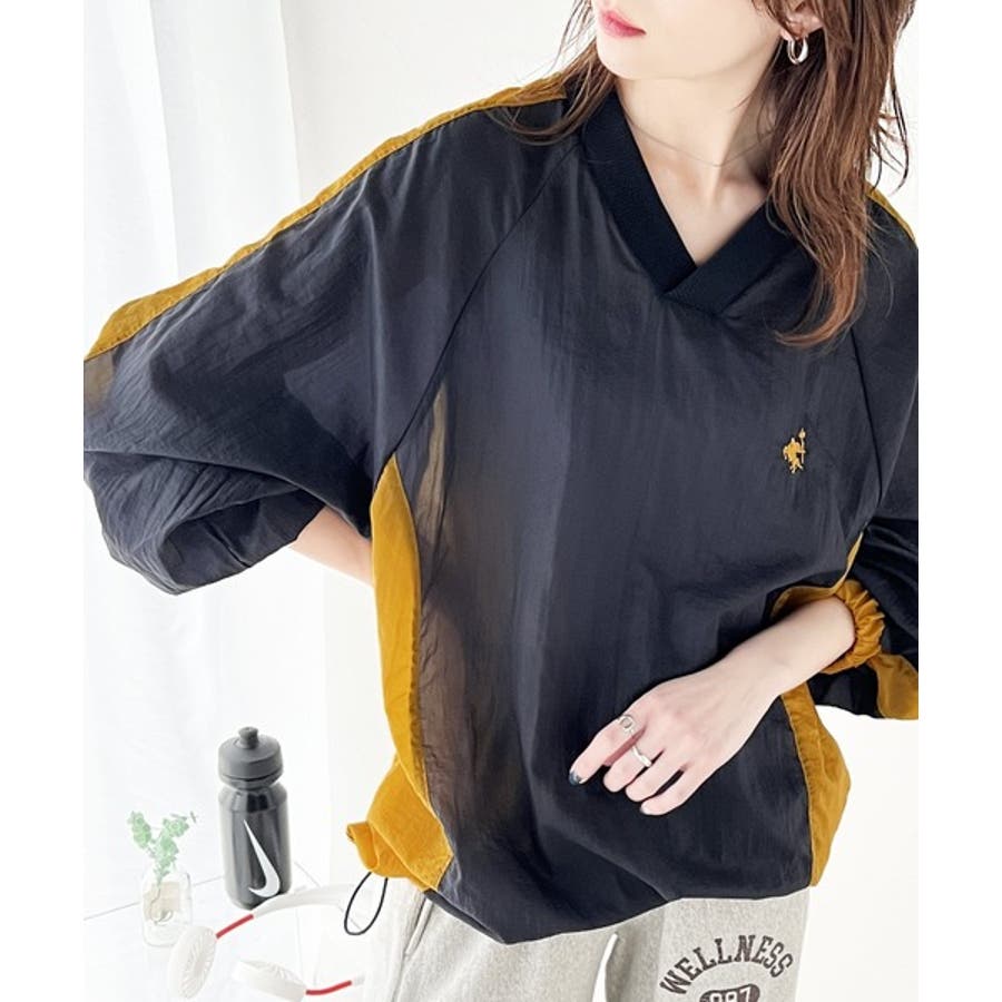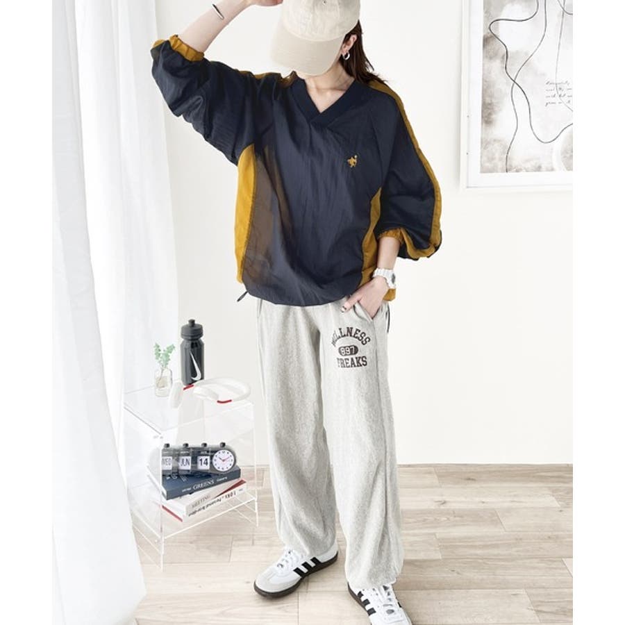 レトロ配色が今っぽ!胸刺繍配色シアー裾ドロストVネックプルオーバー