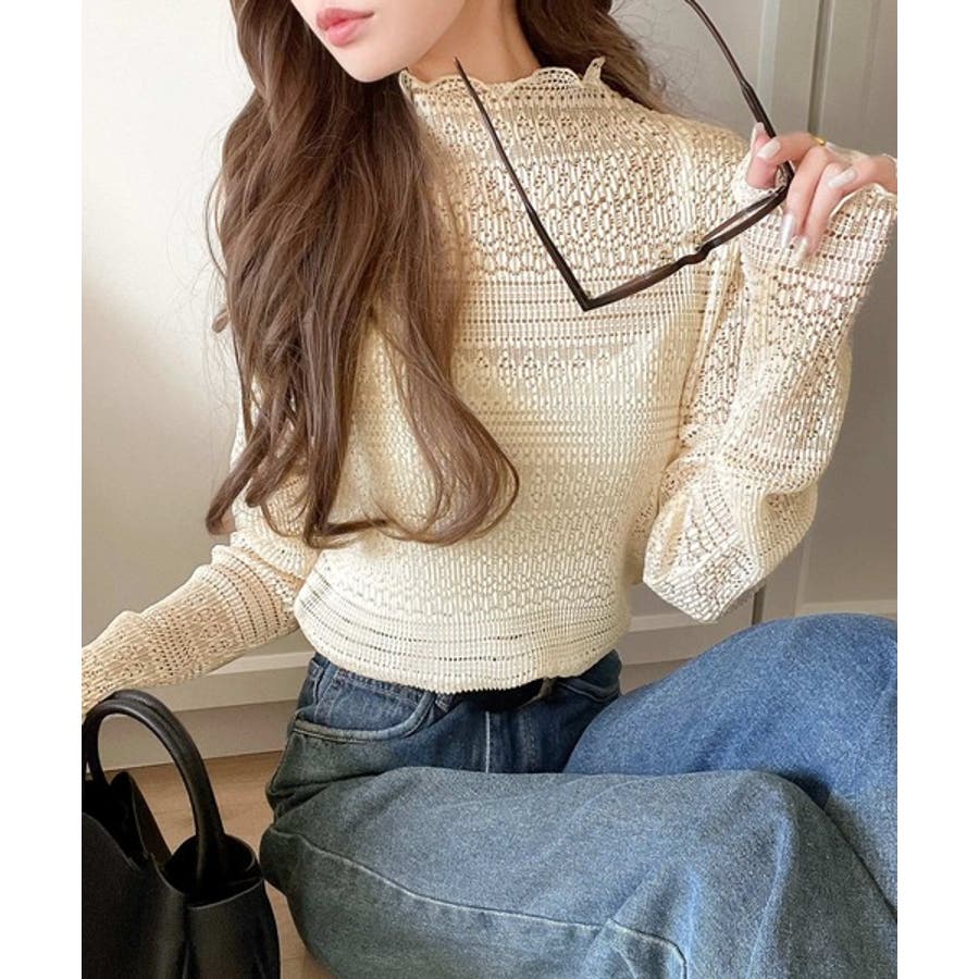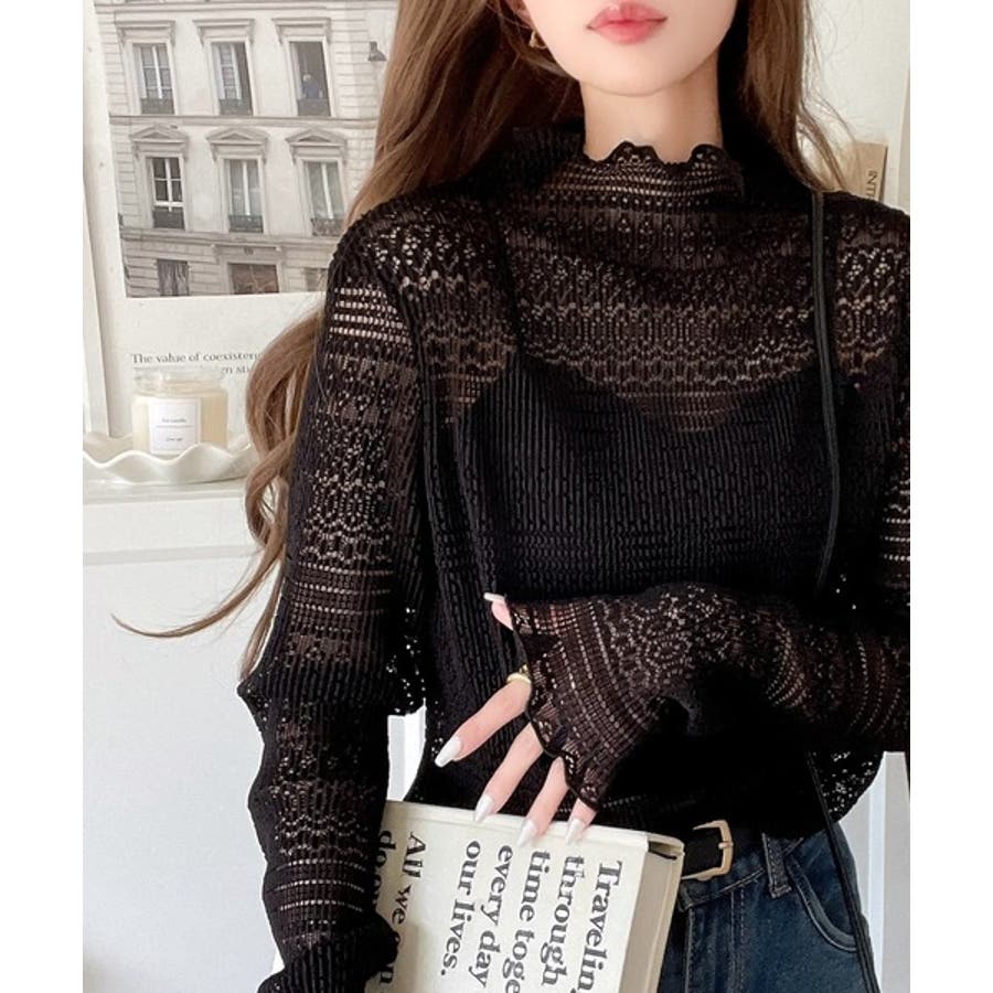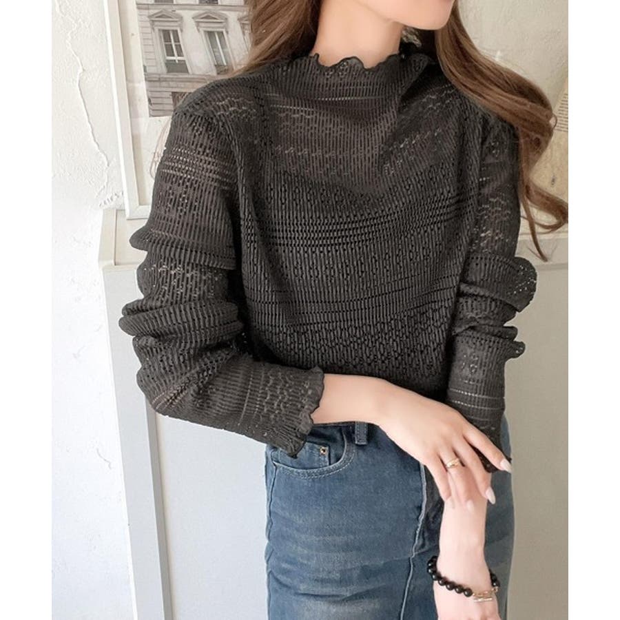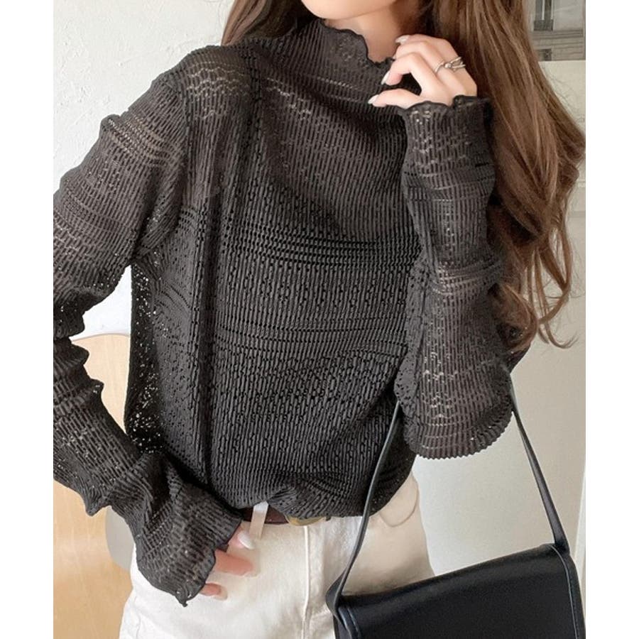 ハイネックデザインでより大人っぽく、程よい透け感を楽しめるアイテムです。