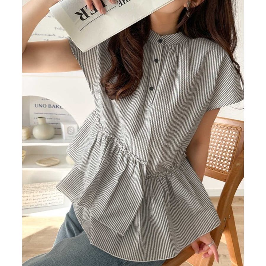 アシンメトリーフリルデザインのサッカーブラウス。