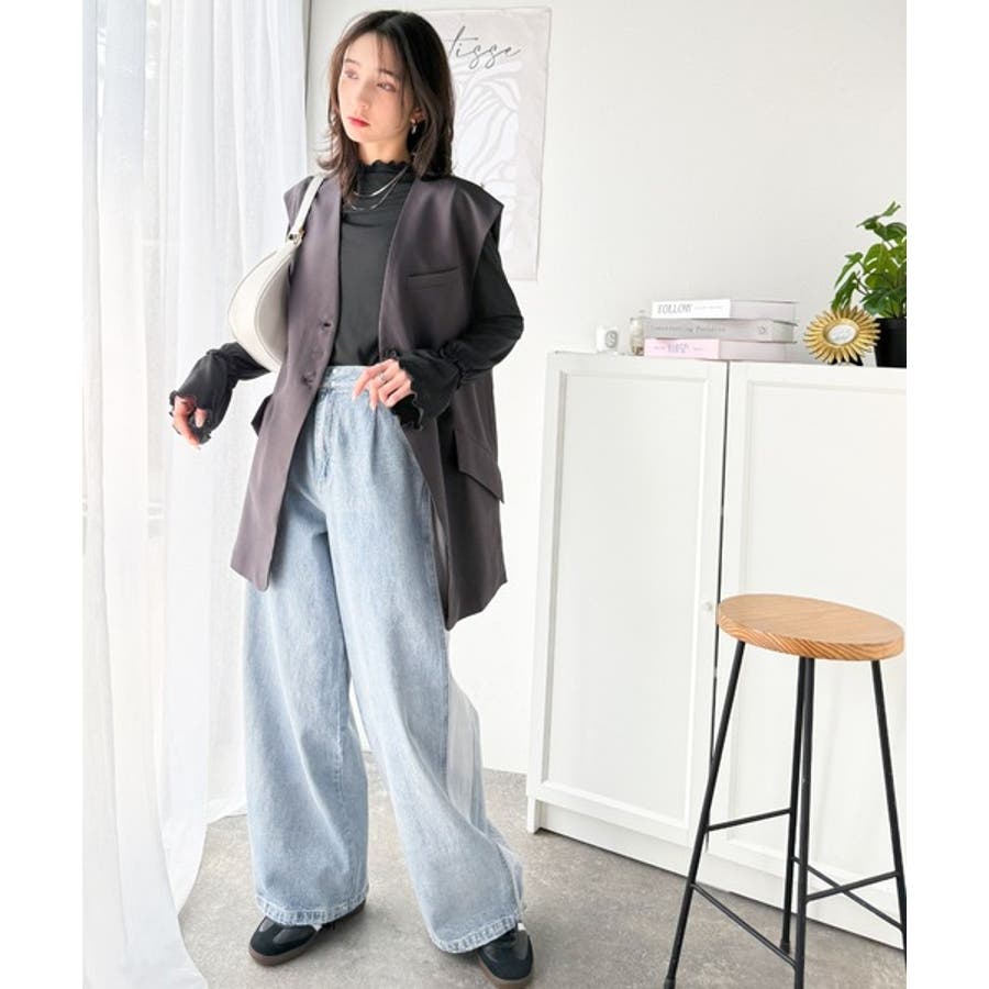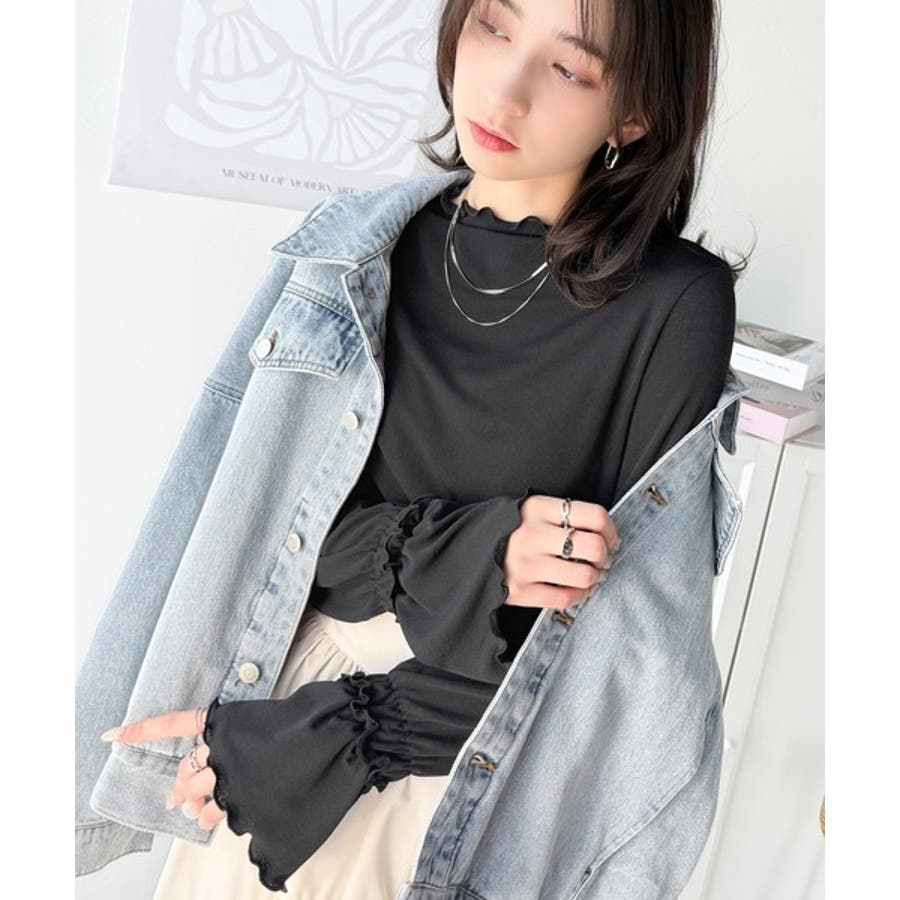 トップスのフリルがアクセントになり、デニムやフレアパンツと合わせて