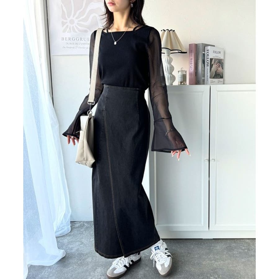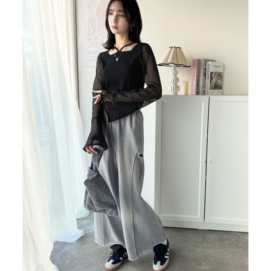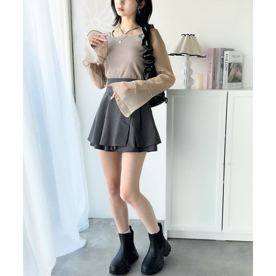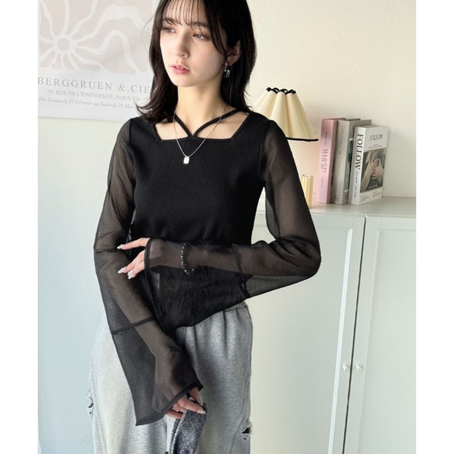 リブ素材&オーガンジ素材切替で一枚でお洒落なコーデに。