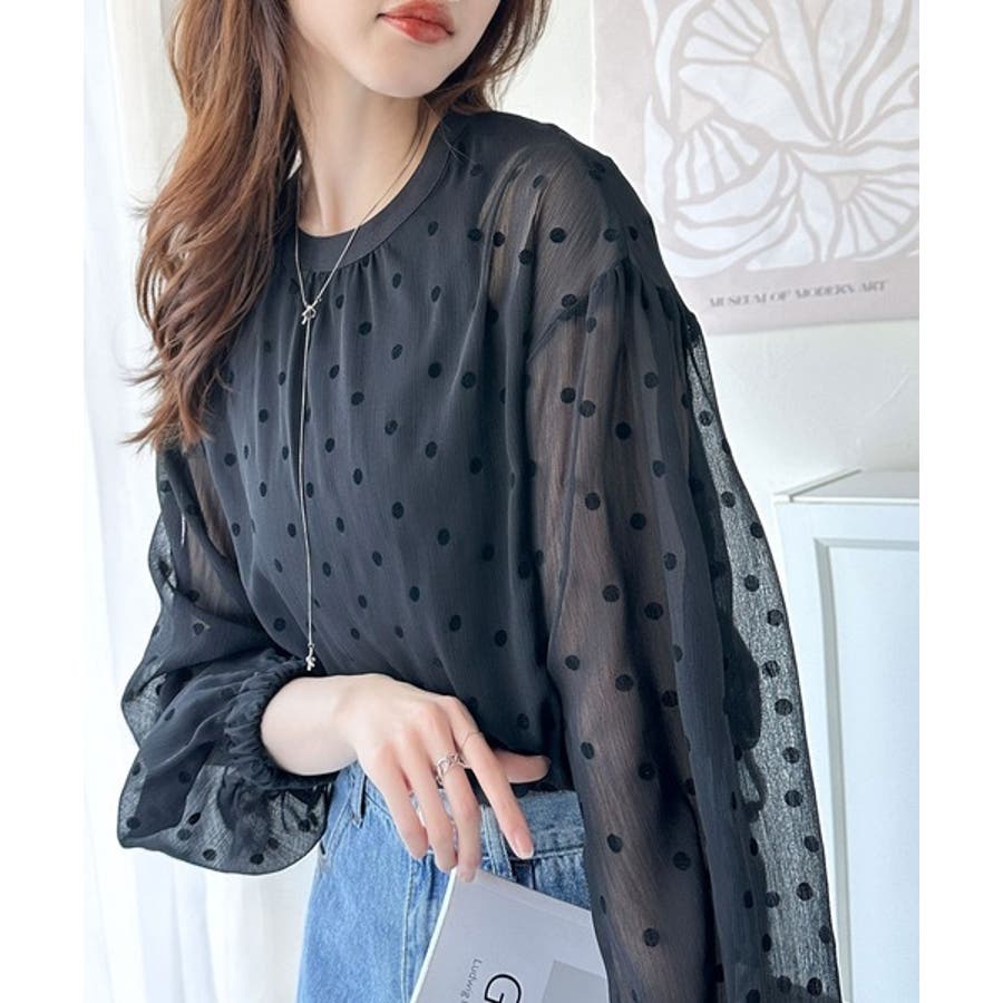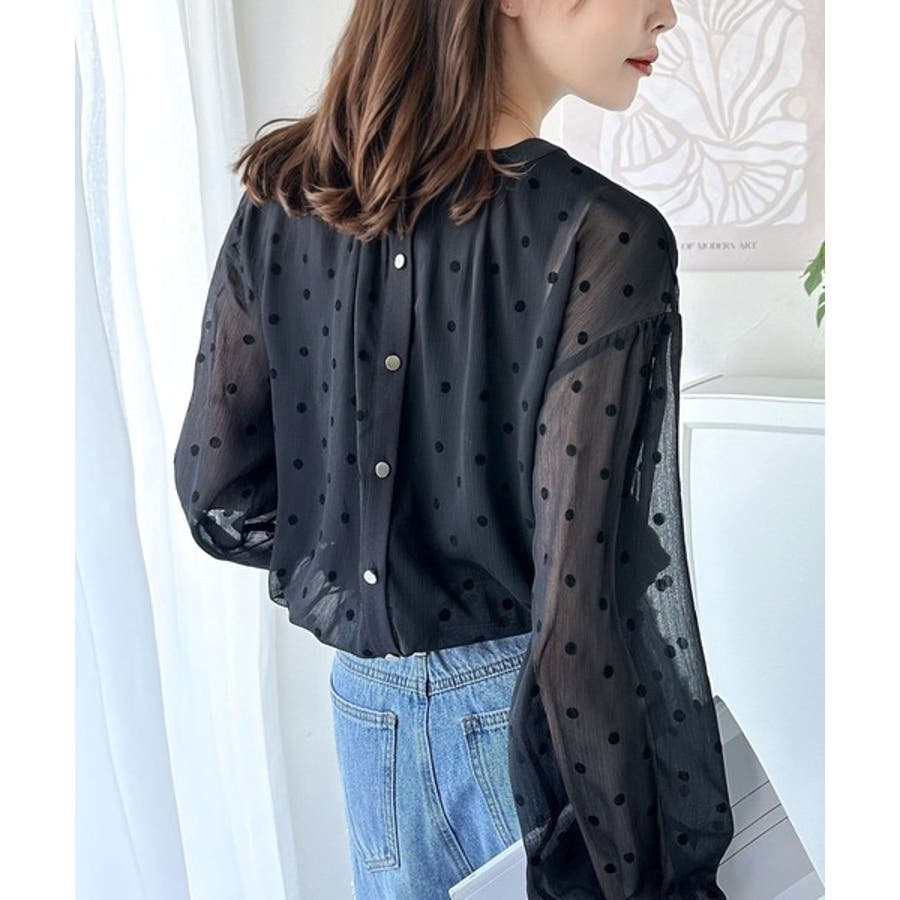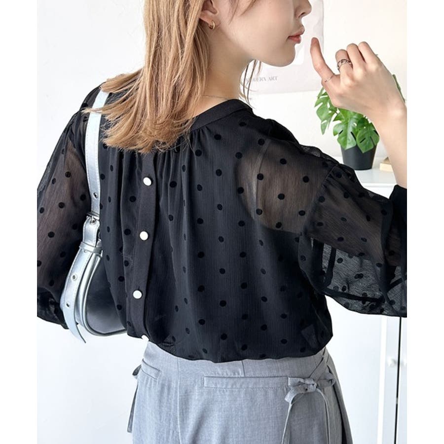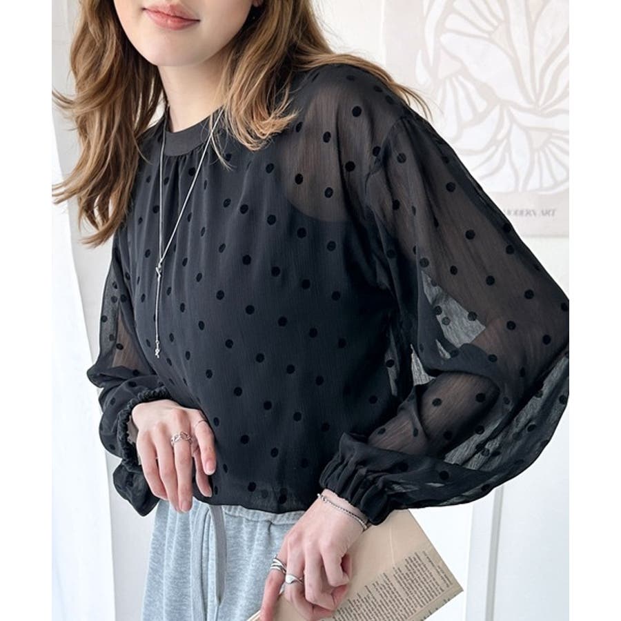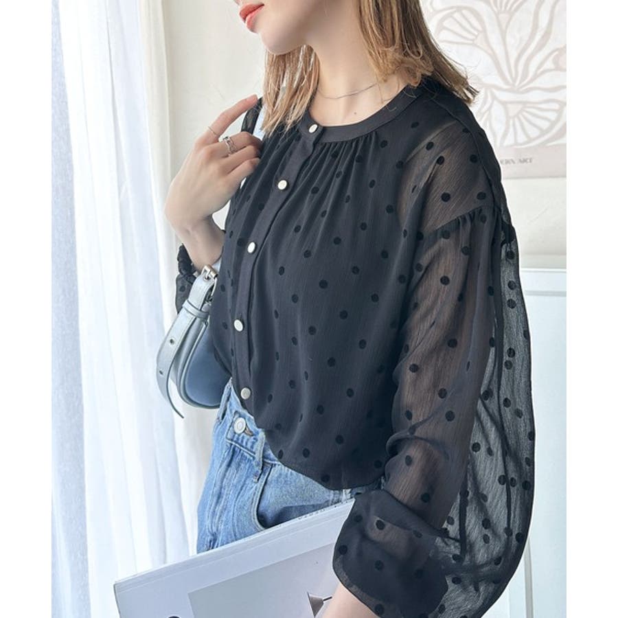 【ブラック】ふんわり可愛いが魅力!前後2wayフロッキードットプリント楊柳シアー素材ブラウス…