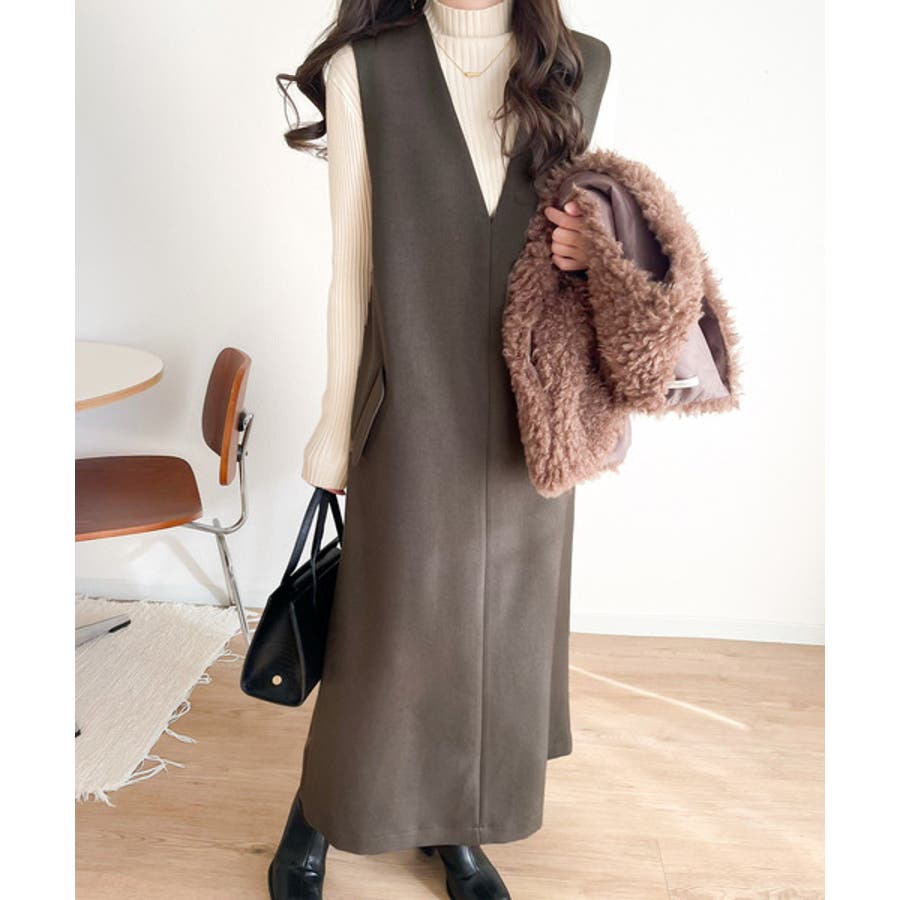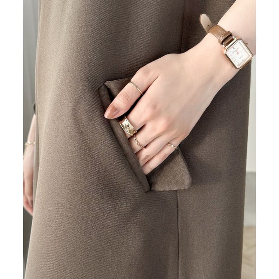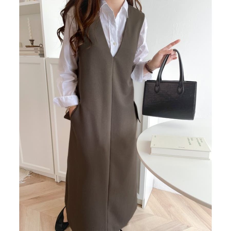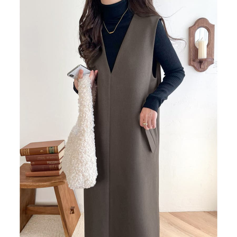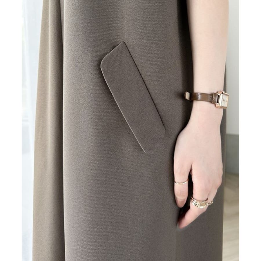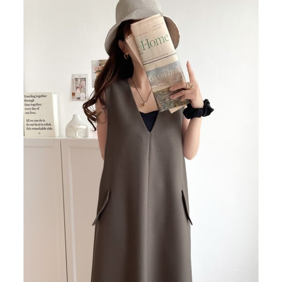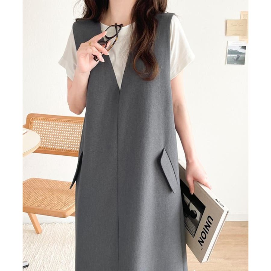 シンプルなデザインながらもフロントのVネックとフラップポケットがアクセントのワンピース。